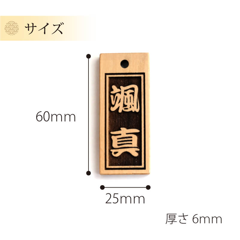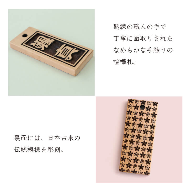 日本の伝統・文化を受け継いだ木札。 縁起物として古くからさまざまな用途に使われました。 あなたにきっとご利益あるかも♪ 大切な人への贈り物にも最適です! 1. 日本の伝統文化 木札の由来 木札は、日本人の暮らしの中で様々な場面に用いられていました。 その中でも、木札が縁起物とよばれるようになった理由には 以下のような由来があります。 一つ目は、江戸火消しの「消し札」。 「火事と喧嘩は江戸の華」と言われるほど江戸時代は火事が多く、 町火消しが火事を防いだ際に、組名が記された札を消し口に掲げていました。 以来、木札は火難、災厄を逃れる縁起物として今に伝わっています。 二つ目は、神社やお寺でも販売されている「身代わり札」。 名前が刻まれた木札は、その人の分身。 札が割れた際はお札が身代わりとなって守ってくれたという伝承が残っており、 古来よりお守りとして使われていました。 三つ目は、願い事を叶える「納札」。 お寺や神社を参拝する人が、祈願成就のために名前や出身地を書いて納める札のことで、千社札とも呼ばれています。 現在は紙のものが一般的ですが、昔は木札を納めていました。 どれも古くからの日本文化を感じられる由来となっておりますが、 現在ではおしゃれ感覚で身につける人も多く見られます。 キーホルダーやストラップのほか、 名札やボトルキープ用のネームタグなど、様々な用途で使われています。 男女年齢問わず、プレゼントにもおすすめのアイテムです。 2. こだわりの木材 当店で作る木札は全て自社製! 素材にこだわり、職人が一つ一つ丁寧に仕上げました。 温かみのある手触りとやさしい木の香りが、安らぎをもたらします。 また自然木は、時間が経つほどに風合いなどの深みが増していくので、 永く愛着を持ってお使いいただけます。 大切な思い出と共に経年変化を楽しめる逸品です。 柘植 ?ツゲ ? 柘植(つげ)は強度があり、非常に堅い木。細工物の材料に 適しており、将棋の駒や印鑑などにも使われています。 本桜や檜に比べて黄色みが強く、上品で落ち着いた雰囲気を 纏っているので、同じ木札でも、モダンなイメージの木札になります。 3. 名前彫刻 当店自慢の技術で一つ一つ心を込めてお名前を刻みます。 名入れ専門店である当店の確かな技術力で細部までしっかりと彫刻! 自分の名前が入った木札は世界で一つの特別な逸品。 大切な家族や友人へのプレゼントとして贈れば、 喜ばれること間違いありません。 - 裏面デザイン - 裏面彫刻は10種類の模様からお選びいただけます。 いずれも縁起がいいとされる日本の伝統模様。 和柄には健康や長寿、学業や商業の成功など様々な願いや祈りが込められています。 贈る相手のことを想い、ぴったりな模様をお選びください。 ≪全10種類日本の伝統紋様≫ ・ 麻の葉 - 魔除け・子供の健やかな成長 - ・ 観世水 - 健康祈願・心願成就 - ・ 青海波 - 平和な暮らし・永く続く幸せ - ・ 荒波青海波 - 平和な暮らし・永く続く幸せ - ・ さくら - 繁栄・豊かさ - ・ 亀甲花菱 - 長寿 - ・ かごめ - 魔除け・邪気を祓う - ・ 紗綾 - 不断長久・吉祥 - ・ 水紋 - 苦難や災難を流す - ・ 毘沙門亀甲 - 長寿 - |