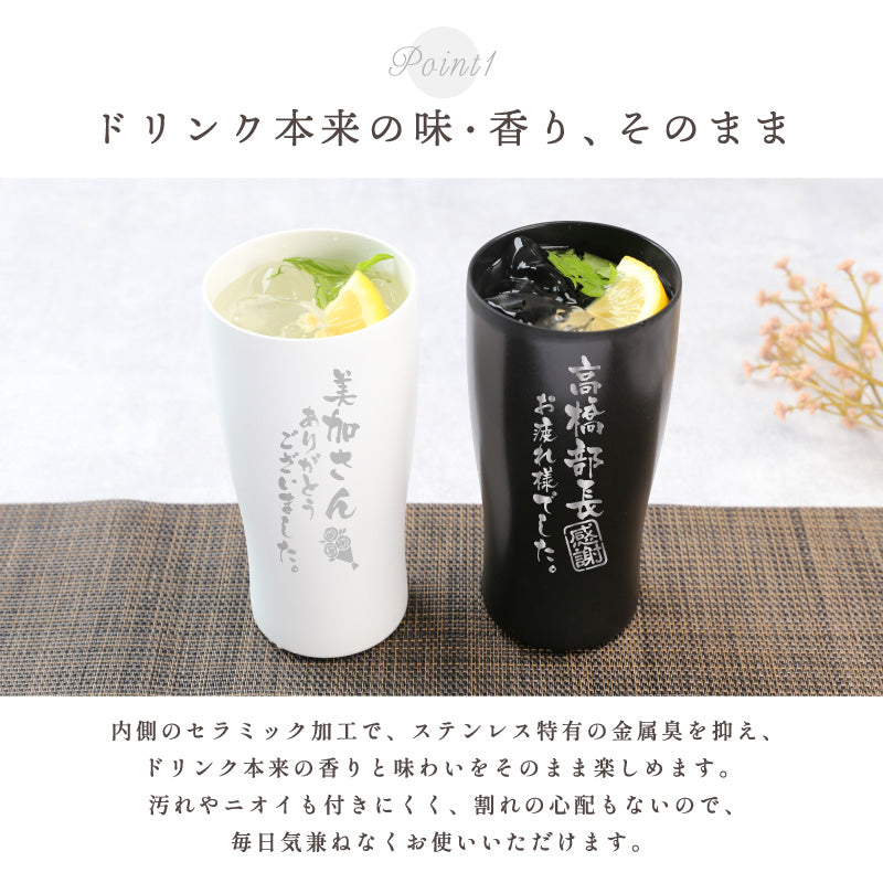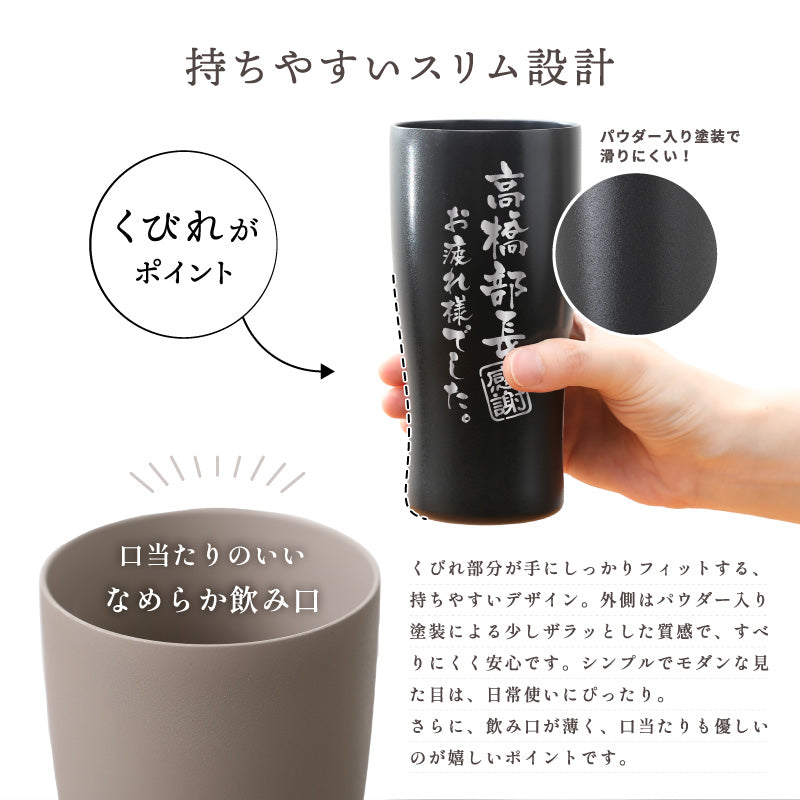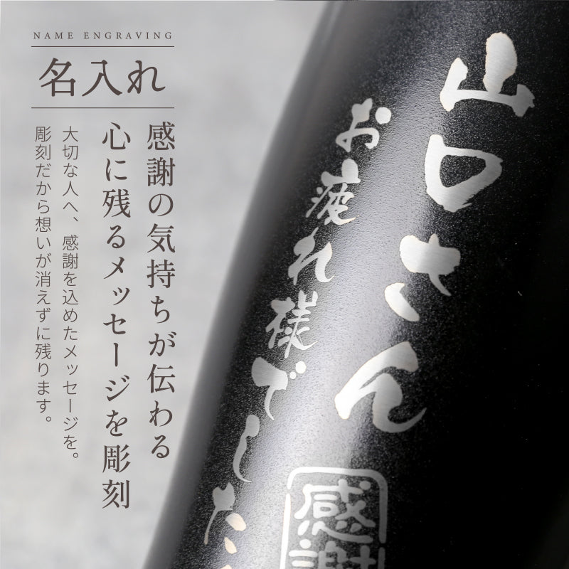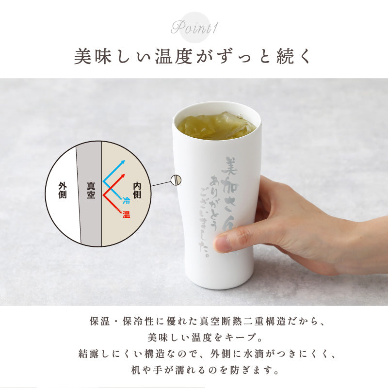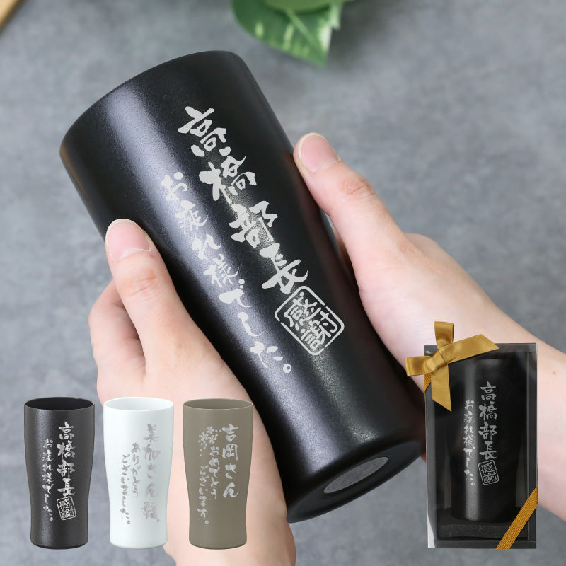 まるで陶器のような、温かみのある風合い。 それでいて、驚くほど高機能。 セラミック塗装を施した 陶器風 ステンレスタンブラー です。 おしゃれ で 実用的 、 シンプルながら上質なデザインだから、 日常に寄り添う“ちょっと贅沢なタンブラー”として 大切な方へのプレゼントに最適です。 1. 高機能な陶器調タンブラー ・陶器のような見た目と手触り マットな質感でざらっとした心地よい手触り、 一見すると本物の陶器に見間違えるほどの仕上がりです。 しかし実際は 軽量 で 割れない ので、落としても安心。 「 和モダン な雰囲気が好きだけど、実用性も重視したい」 そんな方にぴったりな一品です。 ・金属臭がなく、味・香りそのまま セラミックコーティング によって 金属臭が気になりにくいのも嬉しいポイント。 ビール や 焼酎 、コーヒー や お茶 など、 飲み物本来の風味を損なうことなくお楽しみいただけます。 ・保温・保冷 性抜群 素材はステンレスを使用し、 内側と外側の間に真空層を設けた 真空断熱 構造。 そのため、冷たい飲み物はしっかり冷たく、 温かい飲み物はしっかり温かく保つ、 季節を問わず使える万能なタンブラーです。 ・スリムで持ちやすい 胴部分にはさりげなくくびれが入り、指が自然とフィットする設計。 このスリムなくびれが持ちやすさを高め、 長時間使っても疲れにくいのが特徴です。 さらにスタイリッシュなフォルムで、 日常使いにも オフィス にもよく馴染みます。 2. カラーは選べる3色展開 ・ 落ち着いた大人の雰囲気を醸し出す「 ブラック 」 ・ 清潔感と柔らかさを感じる「 ホワイト 」 ・ 優しくナチュラルな印象の「 モカ 」 贈る相手の雰囲気や好みに合わせてお選びいただけます。 3.当店オリジナル名入れ・メッセージ彫刻 心からの感謝・お祝いの気持ちを メッセージ と イラスト で。 やさしく、落ち着いたデザインなので、目上の方への贈り物にも最適です。 相手への お祝 や 感謝の気持ち が伝わるよう、 当社専属クリエイターが思いを込めてデザインしました。 ぜひ、大切な方を思い浮かべながらお選び下さい。 〈 メッセージ 〉 ・お疲れ様でした。 退職祝い 定年退職 の記念品 など、節目 に贈るプレゼントにぴったり。 ・ありがとうございました。 ストレートに感謝 を伝えるメッセージ。 退職した方 への 退職祝 退職記念 や 顧問 指導者 の方に 卒団記念品 卒業記念 など に、 ・おめでとうございます。 目上の方 への お祝い 誕生日 還暦祝い 誕生日プレゼントに。 ・いつもありがとう。 日頃からお付き合いのある方へ感謝の気持ちを。 ・ずっと元気でね。 感謝を伝える元気になるメッセージ 〈 挿絵 〉 ・感謝 ハンコモチーフが幅広い年齢層に受け入れられやすいデザイン。 「お疲れさまでした」というメッセージに加え お礼 を伝えたい時に。 ・花束 昇進祝い 栄転祝い 転勤祝い など 会社の上司 先輩 同僚 への お別れ 、送別 に。 ・さくら シンプルなタンブラーに華やかさをプラス。 送別会 壮行会 送別式 お別れ会 などのシーンにも。 ・孫より 敬老の日に。 《 レーザー彫刻 》 名入れギフト専門店の当店では、熟練の技術者が一点一点 心を込めて 大切なお名前やメッセージを商品に刻み込みます。 ずっと消えない彫刻は、記念の贈り物として大変喜ばれています。 末永く、愛着を持ってお使いいただけることでしょう。 【 名入れ彫刻 】 「 どうして名前入りが喜ばれるの? 」 普段あまりにも身近にあるので、自分の名前のことを深く考えることはありませんが 贈られた商品に自分の名前が刻まれていたらどうでしょう。 しかも特殊な技法で彫り込まれていたり素敵なデザインとなってプリントされていたり・・ その瞬間、ただの“商品”ではなく“自分だけの大切なもの”に変化します。 そして贈ってくれた方の真心を感じ、自然に笑顔がこぼれることでしょう。 名前はその人にとって唯一無二、かけがえのないものです。 私たちはそのお名前を大切に、贈る人、贈られる人、両方の笑顔を想いながら商品を送り出します。 《 あんしんラッピング 》 専用のギフトボックスに入れてお届け。 ギフトバッグや選べるメッセージシールなど、ラッピングに必要なものは全て同梱します。 お渡しする前に仕上りを確認できるようにとの配慮から、ギフトボックスに封はいたしません。 もちろん大切な方へ直送する際は、当店の専門スタッフが丁寧にラッピングをしてお届けします。 〔こんなシーンでおすすめ〕 ・ お世話になった 上司 先輩 への 転職 転勤 退職 定年退職 祝い に ・ 祖父 祖母 の 還暦祝い 古希 米寿 喜寿 傘寿 など 長寿 のお祝いに ・ ご両親 の 銀婚 金婚 のお祝いに ・ 30代 40代 50代 60代 70代 の 男性 女性 に ・ お友達 の 結婚祝い 新築祝い に ・ 卒業 卒団 の 記念 に 先生 コーチ 顧問 の 先生 へ ・ お祝い 記念日 誕生日プレゼント 送別会 など |