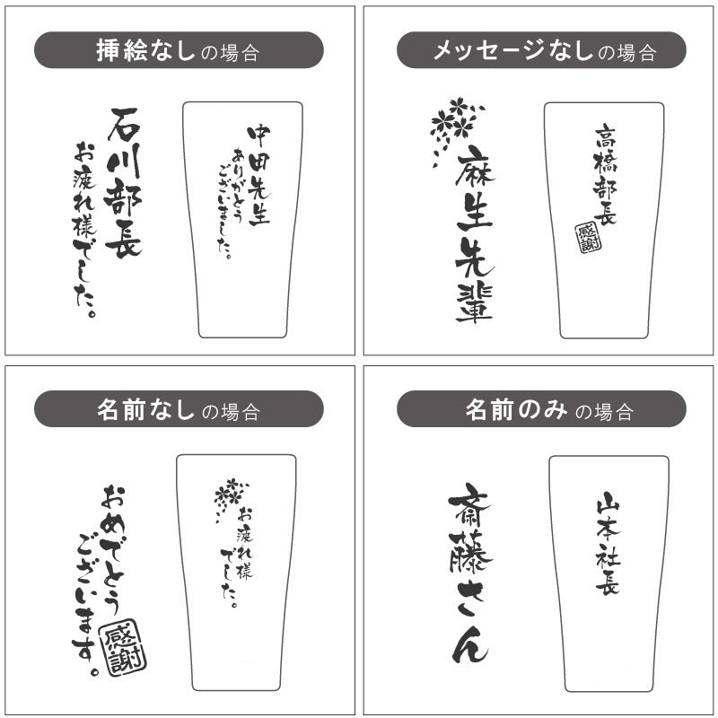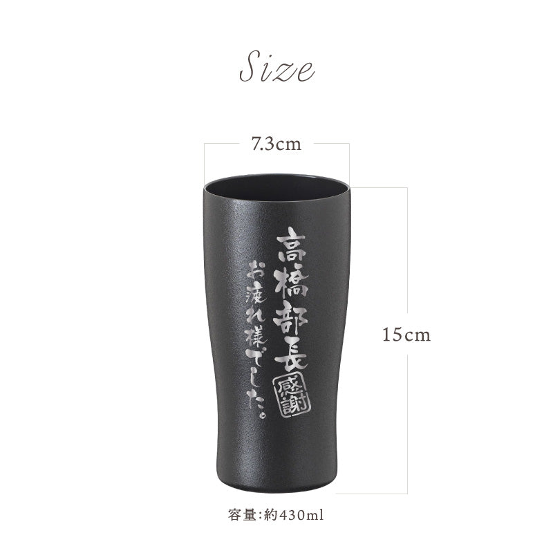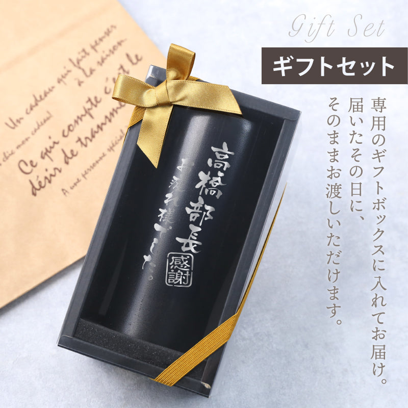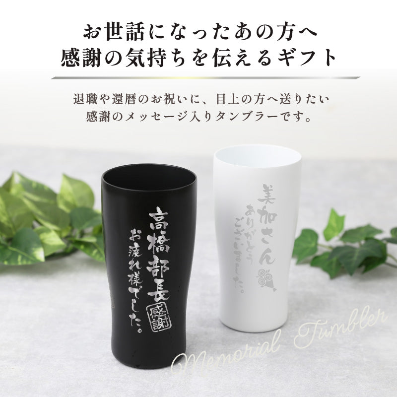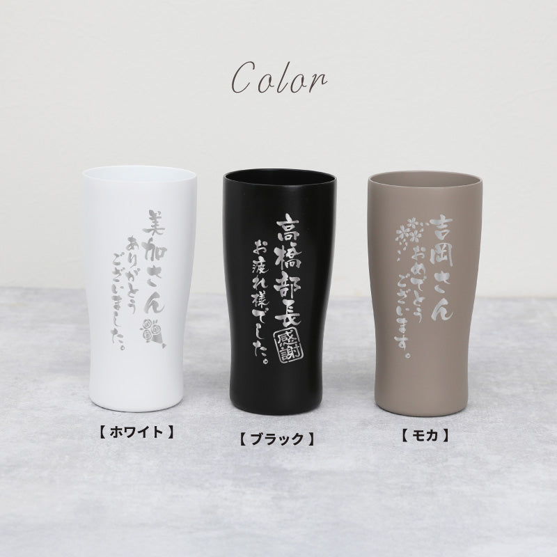 まるで陶器のような、温かみのある風合い。 それでいて、驚くほど高機能。 セラミック塗装を施した 陶器風 ステンレスタンブラー です。 おしゃれ で 実用的 、 シンプルながら上質なデザインだから、 日常に寄り添う“ちょっと贅沢なタンブラー”として 大切な方へのプレゼントに最適です。 1. 高機能な陶器調タンブラー ・陶器のような見た目と手触り マットな質感でざらっとした心地よい手触り、 一見すると本物の陶器に見間違えるほどの仕上がりです。 しかし実際は 軽量 で 割れない ので、落としても安心。 「 和モダン な雰囲気が好きだけど、実用性も重視したい」 そんな方にぴったりな一品です。 ・金属臭がなく、味・香りそのまま セラミックコーティング によって 金属臭が気になりにくいのも嬉しいポイント。 ビール や 焼酎 、コーヒー や お茶 など、 飲み物本来の風味を損なうことなくお楽しみいただけます。 ・保温・保冷 性抜群 素材はステンレスを使用し、 内側と外側の間に真空層を設けた 真空断熱 構造。 そのため、冷たい飲み物はしっかり冷たく、 温かい飲み物はしっかり温かく保つ、 季節を問わず使える万能なタンブラーです。 ・スリムで持ちやすい 胴部分にはさりげなくくびれが入り、指が自然とフィットする設計。 このスリムなくびれが持ちやすさを高め、 長時間使っても疲れにくいのが特徴です。 さらにスタイリッシュなフォルムで、 日常使いにも オフィス にもよく馴染みます。 2. カラーは選べる3色展開 ・ 落ち着いた大人の雰囲気を醸し出す「 ブラック 」 ・ 清潔感と柔らかさを感じる「 ホワイト 」 ・ 優しくナチュラルな印象の「 モカ 」 贈る相手の雰囲気や好みに合わせてお選びいただけます。 3.当店オリジナル名入れ・メッセージ彫刻 心からの感謝・お祝いの気持ちを メッセージ と イラスト で。 やさしく、落ち着いたデザインなので、目上の方への贈り物にも最適です。 相手への お祝 や 感謝の気持ち が伝わるよう、 当社専属クリエイターが思いを込めてデザインしました。 ぜひ、大切な方を思い浮かべながらお選び下さい。 〈 メッセージ 〉 ・お疲れ様でした。 退職祝い 定年退職 の記念品 など、節目 に贈るプレゼントにぴったり。 ・ありがとうございました。 ストレートに感謝 を伝えるメッセージ。 退職した方 への 退職祝 退職記念 や 顧問 指導者 の方に 卒団記念品 卒業記念 など に、 ・おめでとうございます。 目上の方 への お祝い 誕生日 還暦祝い 誕生日プレゼントに。 ・いつもありがとう。 日頃からお付き合いのある方へ感謝の気持ちを。 ・ずっと元気でね。 感謝を伝える元気になるメッセージ 〈 挿絵 〉 ・感謝 ハンコモチーフが幅広い年齢層に受け入れられやすいデザイン。 「お疲れさまでした」というメッセージに加え お礼 を伝えたい時に。 ・花束 昇進祝い 栄転祝い 転勤祝い など 会社の上司 先輩 同僚 への お別れ 、送別 に。 ・さくら シンプルなタンブラーに華やかさをプラス。 送別会 壮行会 送別式 お別れ会 などのシーンにも。 ・孫より 敬老の日に。 《 レーザー彫刻 》 名入れギフト専門店の当店では、熟練の技術者が一点一点 心を込めて 大切なお名前やメッセージを商品に刻み込みます。 ずっと消えない彫刻は、記念の贈り物として大変喜ばれています。 末永く、愛着を持ってお使いいただけることでしょう。 【 名入れ彫刻 】 「 どうして名前入りが喜ばれるの? 」 普段あまりにも身近にあるので、自分の名前のことを深く考えることはありませんが 贈られた商品に自分の名前が刻まれていたらどうでしょう。 しかも特殊な技法で彫り込まれていたり素敵なデザインとなってプリントされていたり・・ その瞬間、ただの“商品”ではなく“自分だけの大切なもの”に変化します。 そして贈ってくれた方の真心を感じ、自然に笑顔がこぼれることでしょう。 名前はその人にとって唯一無二、かけがえのないものです。 私たちはそのお名前を大切に、贈る人、贈られる人、両方の笑顔を想いながら商品を送り出します。 《 あんしんラッピング 》 専用のギフトボックスに入れてお届け。 ギフトバッグや選べるメッセージシールなど、ラッピングに必要なものは全て同梱します。 お渡しする前に仕上りを確認できるようにとの配慮から、ギフトボックスに封はいたしません。 もちろん大切な方へ直送する際は、当店の専門スタッフが丁寧にラッピングをしてお届けします。 〔こんなシーンでおすすめ〕 ・ お世話になった 上司 先輩 への 転職 転勤 退職 定年退職 祝い に ・ 祖父 祖母 の 還暦祝い 古希 米寿 喜寿 傘寿 など 長寿 のお祝いに ・ ご両親 の 銀婚 金婚 のお祝いに ・ 30代 40代 50代 60代 70代 の 男性 女性 に ・ お友達 の 結婚祝い 新築祝い に ・ 卒業 卒団 の 記念 に 先生 コーチ 顧問 の 先生 へ ・ お祝い 記念日 誕生日プレゼント 送別会 など |