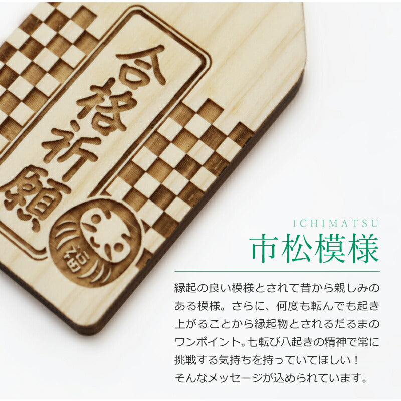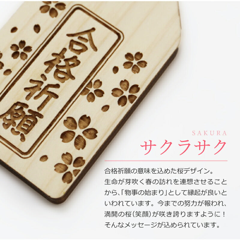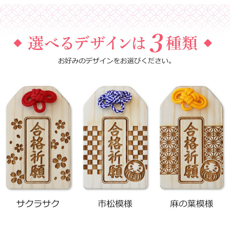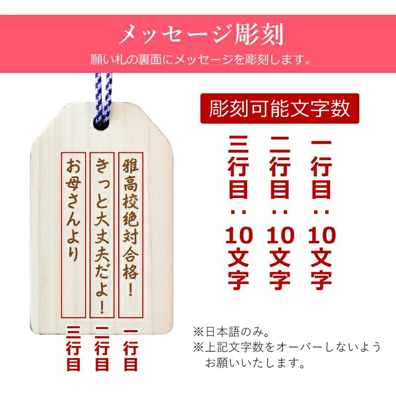 そばで見守ってきたお母さん、お父さんからの応援メッセージ。 受験生の不安や緊張をほぐすのは、 身近で応援する人からの言葉です。 受験生へのプレゼントにぴったり。 - 3つのおすすめポイント - 1. メッセージ彫刻 オモテ面には「 合格祈願 」の彫刻。 願い札ウラ面にはお好きなメッセージを彫刻可能です。 毎日頑張る姿を一番近くで見守ってきたご両親からのエール。ピリピリムードの受験生、身近にいるからこそ直接声を掛けることを控える親御さんも。口では上手く伝えられないけど、心から応援している気持ちを伝えたい。この 「 合格祈願 願い札 」はそんな気持ちを形にしたお守りです。 ・毎日応援しているよ。がんばって! お母さんより ・最後まであきらめないでね! 父・母より など、どんなメッセージでもOK。 受験生が言われて励みになる言葉をかけてあげたいですよね。ずっと頑張りを見てきた身近な人の想いは、きっとどんなお守りにも勝ります。 孤独・寂しさとの葛藤を経験する受験生 この願い札を手にメッセージを目にするたび、“ 自分一人じゃないんだ ”そんな気持ちになれるはずです。 当店専属デザイナーによる完全オリジナル。 どのデザインも受験生の緊張をほぐす優しい雰囲気です。 ・サクラサク 合格祈願の意味を込めた桜デザイン。 受験生を娘さんに持つ親でもあるデザイナーのGさん。 “桜デザイン”はその娘さんを想いながら作っていただきました。 満開の桜を連想して、良いイメージで受験日を迎えられそうです。 ・市松模様 縁起の良い模様とされて昔から親しみのある模様。 さらに、何度も転んでも起き上がることから 縁起物とされるだるまのワンポイント。 七転び八起きの精神で常に挑戦する気持ちを持っていてほしい! そんなメッセージがこもっています。 ・麻の葉模様 子供の成長・魔よけの意味を持つ麻の葉模様。 厄除け、学業成就などに適しているとされています。 こちらにもまた、小さなダルマのワンポイント。 諦めず最後までやり遂げる姿勢を忘れずに、 というメッセージを込めました。 受験生のこころをほぐすほっこりとしたフォルム。 自然素材である木製品は持つ人の心を鎮めてくれます。 ほのかな木の香り。 安らぎを与えてくれるとされるヒノキの癒し効果で 受験生のイライラした気持ちを解消。 受験日には、ポケットに忍ばせて。 不安になった時にギュッと握れば、天然素材ならではの木のぬくもりが手に伝わります。 緊張が和らぎ、きっと落ち着いて試験に臨めます。 コロナ禍の中、これまでの様に簡単に合格祈願の参拝でさえ気軽に行くことが出来ない状況。 頑張る受験生のために、私たちでできる事はないか…勇気づけられるような商品を作れないかな? そんな会話からはじまりました。 当店では長年、子供の成長を願う乳歯ケースなどの木の製品を自社で製造してきました。 私たちがずっと扱ってきた木の温かみを感じてほしい。 そんな想いもあり、木で出来たお守りを考えました。 “お守り”だからよりご利益のあるものを…そう考え、 学業成就で有名な神社に、ご祈祷をお願いできないかとご相談もしました。 しかしながら、宮司さんからこんなことを言われました。 「ご祈祷した御守は、神様の御分霊です。それはとてもおごそかなもの。 わざわざ足を運んでくれた方が参拝して初めて授与できるもの。 ネットで販売することでお守りの深みが無くなってしまう。」 大切に守ってきた伝統を壊してはいけない。そう思いました。 そこで改めて“どうしたら受験生を勇気づけられるだろう” もう一度考え直しました。 受験生だった頃の自分になった気持ちで思い返してみました。 私が真っ先に思い出したのは“お母さん”です。 受験前日に体調を崩してしまった私を心配する母の顔。 受験当日に心配そうに見送る母の表情。 結果発表の日、涙を流して喜んでくれた母。 何より「 頑張ってきたんだから、大丈夫! 」この言葉が私の背中を押してくれた。 身近な人が自分の頑張りを見ていてくれたからこそ、掛けられる言葉。 それがどんなお守りよりも、力になってくれる。 それに気が付きました。 神社のお守りは「神頼み」。 ご利益を信じて、持っているだけでやっぱり心強い気持ちになります。 それに対してこちらの“合格祈願 願い札”はご祈祷をしているものでもなく、 ご利益をお約束できるものではありません。 家族、先生、友達。 本人の頑張りを知る、すぐ近くにいる人からの言葉の力を信じて。 あなたの心から贈る、応援の言葉を刻み込みます。 |