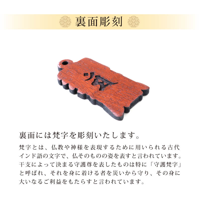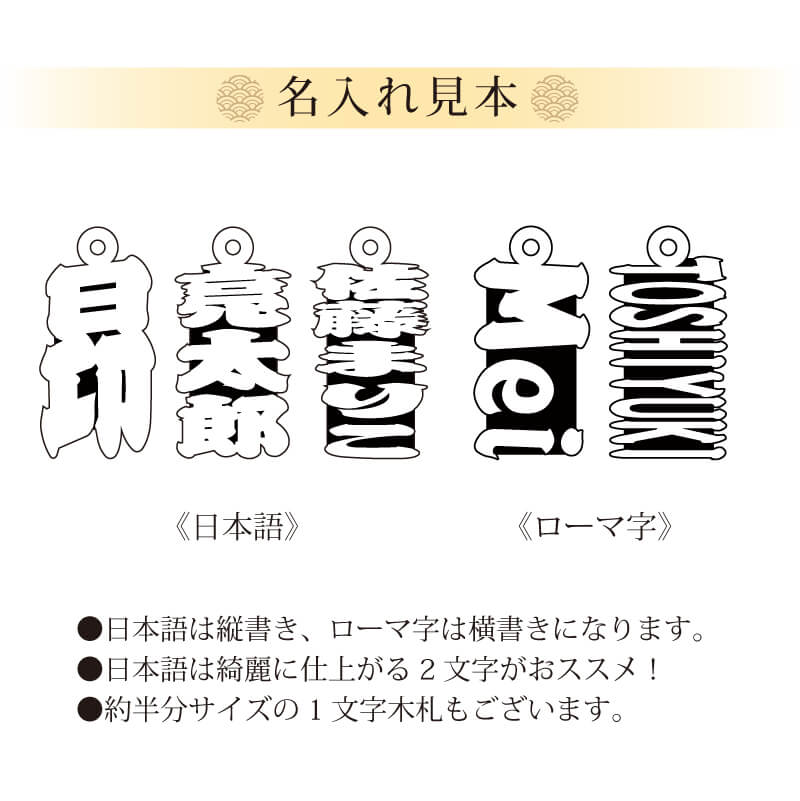 日本の伝統・文化を受け継いだ木札。 縁起物として古くからさまざまな用途に使われました。 あなたにきっとご利益あるかも♪ 大切な人への贈り物にも最適です! 1. 日本の伝統文化 木札の由来 木札は、日本人の暮らしの中で様々な場面に用いられていました。 その中でも、木札が縁起物とよばれるようになった理由には 以下のような由来があります。 一つ目は、江戸火消しの「消し札」。 「火事と喧嘩は江戸の華」と言われるほど江戸時代は火事が多く、 町火消しが火事を防いだ際に、組名が記された札を消し口に掲げていました。 以来、木札は火難、災厄を逃れる縁起物として今に伝わっています。 二つ目は、神社やお寺でも販売されている「身代わり札」。 名前が刻まれた木札は、その人の分身。 札が割れた際はお札が身代わりとなって守ってくれたという伝承が残っており、 古来よりお守りとして使われていました。 三つ目は、願い事を叶える「納札」。 お寺や神社を参拝する人が、祈願成就のために名前や出身地を書いて納める札のことで、千社札とも呼ばれています。 現在は紙のものが一般的ですが、昔は木札を納めていました。 どれも古くからの日本文化を感じられる由来となっておりますが、 現在ではおしゃれ感覚で身につける人も多く見られます。 キーホルダーやストラップのほか、 名札やボトルキープ用のネームタグなど、様々な用途で使われています。 男女年齢問わず、プレゼントにもおすすめのアイテムです。 2. こだわりの木材 当店で作る木札は全て自社製! 素材にこだわり、職人が一つ一つ丁寧に仕上げました。 温かみのある手触りとやさしい木の香りが、安らぎをもたらします。 また自然木は、時間が経つほどに風合いなどの深みが増していくので、 永く愛着を持ってお使いいただけます。 大切な思い出と共に経年変化を楽しめる逸品です。 花梨 ?カリン ? 木肌が美しく、綺麗な光沢が特徴的。赤みが強く、目を惹く存在感です。 主に、家具や床柱、楽器などに使用されている木材です。 3. 名前彫刻 当店自慢の技術で一つ一つ心を込めてお名前を刻みます。 名入れ専門店である当店の確かな技術力で細部までしっかりと彫刻! 自分の名前が入った木札は世界で一つの特別な逸品。 大切な家族や友人へのプレゼントとして贈れば、 喜ばれること間違いありません。 - 抜き文字 - 周りと差がつく当店の彫刻技術「抜き文字」だから、 他とは違う喧嘩札をお探しの方にもおすすめ。 シンプルながらかっこいい、ひと味違う粋な木札です。 木工職人の確かな技術をもって、細部にこだわり、丁寧に仕上げました。 木札を手にした時、その質感に感動と喜びを味わっていただけることでしょう。 - 梵字彫刻 - 裏面には梵字を一文字彫り込みます。 梵字は古代インド発祥の文字。 神仏一体を表しており、特別なパワーを秘めています。 自分の干支の守護梵字を身につけることによって 災いから身を守り、ご利益をもたらしてくれると言われています。 贈る相手の干支に合わせてお選びください。 大切な家族や友人、恋人へのプレゼントとして贈っても喜ばれる逸品です。 ≪こんなシーンにおすすめ≫ ・ 友達への 誕生日プレゼント に ・ 神輿 や 縁日 花火大会 に ・ 家族 やチーム・仲間同士でお揃いに ・ 父の日 敬老の日 のプレゼントに ・ 還暦 古希 喜寿 傘寿 米寿 卒寿 白寿 百寿 などの長寿のお祝いに ・ お子様のバッグや通学カバンに着けて名札代わりに ・ 卒業 卒団 卒部 などの 記念品 に ・ 創立記念 周年記念 のプチギフトに |