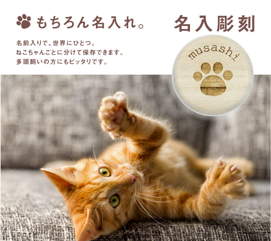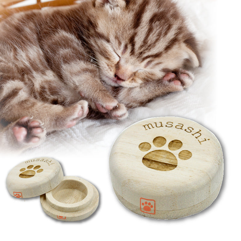 | \ 猫ちゃん ワンちゃんとの大切な想い出を保管 / かわいい愛猫 愛犬 の抜けた乳歯や爪、どのように保管していますか? 愛おしい成長の証だから、捨てられない!けどどうやって保管しよう?とお悩みの方も、この「ねこのつめ・乳歯ケース」ならスッキリ解消! 猫好きさん 犬好きさんへのギフトにもぴったり。 - だから、おすすめ。3つのポイント - 1. 保管に最適な「 桐製 」 とっておいた爪や乳歯、しっかりと収納していますか? 桐材は通気性が良く、防湿・抗菌効果があり、腐食に強いため長期保管には最適の素材。 防虫、殺虫効果があることでも知られています。 その桐材を滑らかになるまで職人が妥協を許さず丁寧に磨いています。 すべすべとした手触りを実際に手にしてみてください。 しっかりとケースにしまっておけば安心感が違います! 2. 可愛い肉球デザイン 猫 はもちろん 犬用 としてもお使いいただける、肉球デザイン彫刻。 ご購入いただきましたお客様からは、 「 飾っていてかわいい 」とのお声も多く、 インテリアとしてもご愛用いただいております。 男 女 問わずにお部屋に馴染むシンプルなデザインだから、 贈り物としても最適な逸品です。 3. 消えない名前彫刻 “思えば、あんなにちいさかったんだよなぁ…” 乳歯が抜けるのは思い出の大切な1ページ。 そんな思い出と一緒にずっと残しておきたい。 大切に保管していくものだからこそ、 お名前が「消えない」名前入れ 彫刻。 さらに、ひとつひとつ木目や色が異なるから世界にただ一つだけ。 だからプレゼントにぴったりです。 せっかく見つけた乳歯の収納に困っていたご主人様も、メモリアルグッズとして大事に飼っていた愛猫・愛犬の思い出をずっと大切に保管したい方にも。 この特別感のある桐製 名入りケースに入れたら、 とっておきの“たからもの”になります! |