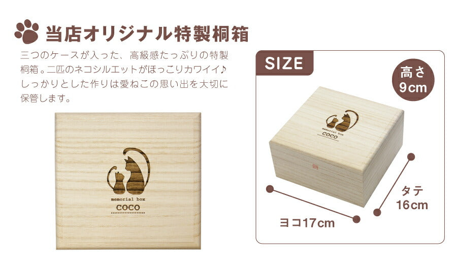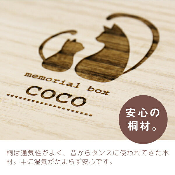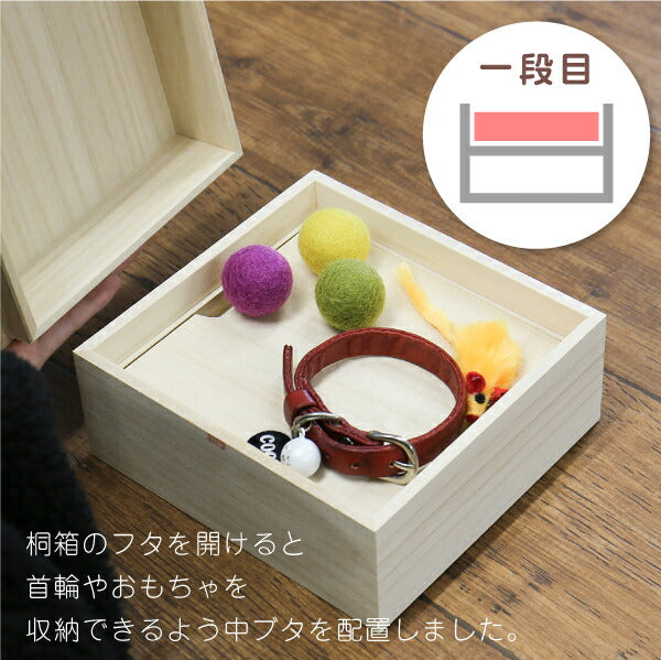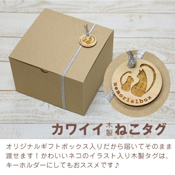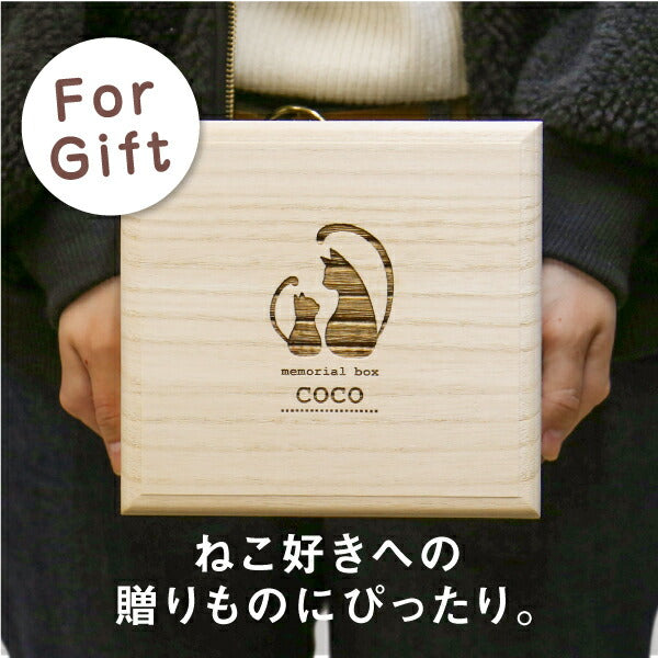 愛猫の毛玉・ひげ・爪・乳歯…ぜ〜んぶ愛おしい思い出。 さらにリードやおもちゃも収納できて、便利な収納ボックスです! 1. 保管に優れた「 桐製 」 愛猫の「毛玉・ひげ・爪・乳歯」を永く保管したい。 通気性の良い桐材は腐食に強く防湿・抗菌効果など長期保管に最適の素材。 また防腐、防虫、殺虫効果があるとも知られています。 その桐材を滑らかになるまで職人が妥協を許さず丁寧に磨いています。 すべすべとした手触りを実際に手にしてみてください。 しっかりとケースにしまっておけば安心感が違います! 2. 2段式収納 蓋を開けると2段式になっているこのボックス。 1段目にはお好きな猫ちゃんグッズを収納できます。 お気に入りの リード や 診察券 健康管理表 思い出の写真 爪切り などなど 細かなモノもこちらに入れておけば無くさず安心。 3. かわいい猫シルエット&消えない名前彫刻 ブラッシングしてあげた時の、幸せそうな表情… 嬉しい時はおひげがピンと伸びてたなぁ。。 そんな思い出と一緒にずっと残しておきたい。 大切に保管していくものだからこそ、 お名前が「消えない」名前入れ 彫刻。 さらに、ーつーつ木目や色が異なるから世界にただ一つだけ。 多頭飼いの方も、名入れ入りのボックスなら一目瞭然! 便利にお使いいただけます。 男 女 問わずにお部屋に馴染むシンプルなデザイン。 大事に飼っていた猫ちゃんの思い出をずっと大切に保管したい方にメモリアルグッズとしても。 愛猫のたからもの箱の様なこのメモリアルボックス、 猫ちゃんを大切に想う気持ちがきっと伝わります♪ オリジナルギフトボックスには木製ねこタグ付き。 キーホルダーとして持ち歩けば、いつでも愛猫と一緒な気分を楽しめます。 |