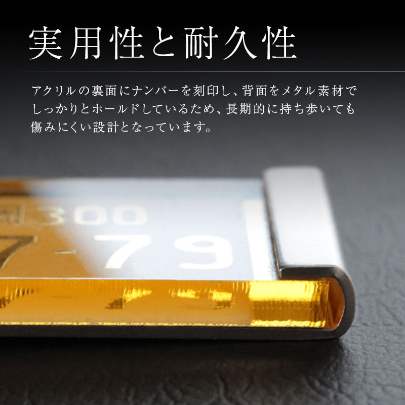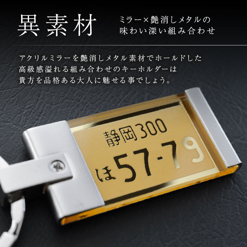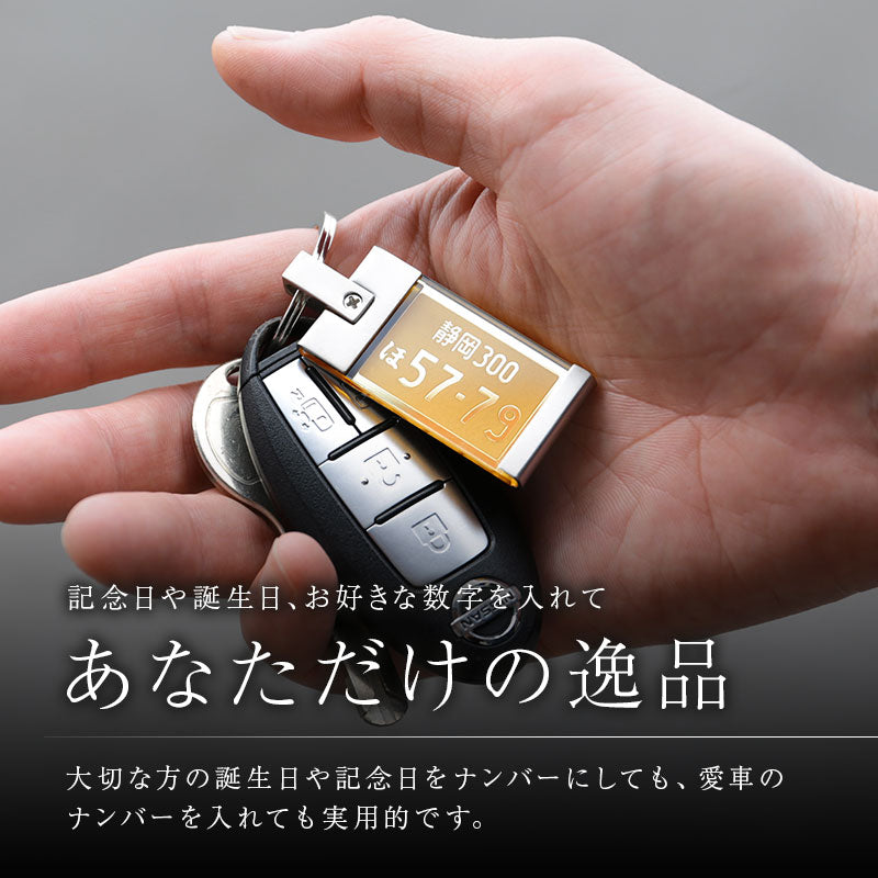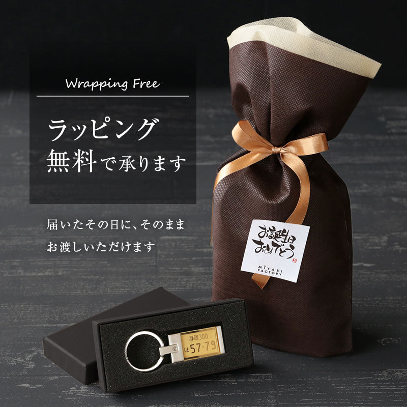 あなたの愛車のナンバーを刻印いたします。 オンリーワンのキーリングだから これ以上にない特別感。 大人の方へのギフトに喜ばれる 高級感あふれるナンバープレートキーホルダーです。 1. 高級感抜群のアクリルミラー エレガント ゴージャス な ゴールド クールモダンな シルバー 輝きを放つキーホルダーは、注目されること間違いなし。 だから、男性にも好まれやすく、目上の方にもぴったり。 高級感だけではなく、耐久性も追求しました。 アクリルの裏面にナンバーを刻印いたしますので、 擦れて文字が消えてしまう心配もありません。 背面はメタルで覆ってあるので、強度もバッチリ。 鏡面がアクリル越しに見えることで、 ギラギラしすぎず、落ち着きのある色合いになっています。 角度によって光沢が変化し、そのたびに色んな表情を見せてくれる 味わい深さのあるキーホルダーです。 愛着を持って永くお使いいただけます。 2. 本物そっくりそのまんま! ナンバーのレイアウトは、 ・ 自動車用 ・ バイク用 ・ 記念日・原付用 とそれぞれご用意してありますので、 実物のナンバープレートを忠実に再現した使用になっております。 まるで ミニチュア のような かわいさ。 「本物そっくり」「リアル」なクオリティにご満足いただけたと、 たくさんの嬉しい反響をいただいております。 ぜひ実物を手にしていただき、その感動を味わって下さい! 3. 名前入り ・お好きな数字も可能♪ 「記念日・原付用」をご選択いただければ、 お好きな文字をお入れすることが出来ます。 2人の名前を彫刻してペア キーホルダー としてお使いの方、 家族 で おそろい にしてお使いいただいている方も。 “ナンバープレート”は思い入れのある数字を選んでいる方も少なくありません。 だからこそもらったら絶対にうれしいプレゼント。 「こんなのあるんだ〜!」というサプライズをお届け。 さらにこの「ナンバープレートキーホルダー ミラー」なら他とは違う高級感。 お渡しするお相手に、きっと笑顔になってもらえるギフトです♪ [ ご利用シーンなど ] 男性にはもちろん女性にも 車 マイカー 単車 バイク が大好きなあの人へ… バレンタイン 父の日 敬老の日 バースデープレゼント 新車祝い 新車購入記念 納車祝い ご成約プレゼントに。 お父さん 旦那さん 彼氏 に誕生日プレゼントに キーケース とセットで、など 様々な 記念日に。 40代 50代 60代 お父さん 運転手 ドライバー の方 に 思いを込めて 交通安全 のお守りに、とお渡しいただくのもおすすめです。 |