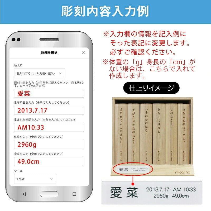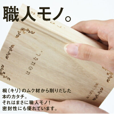 - 大切な人への出産祝いにおすすめ。3つのポイント - 1. 思い出をおしゃれに飾って置ける はじめてのえのはなし。 手がた足がたのはなし。 へそのおのはなし。 きおくのはなし。 はのはなし。 たからもののはなし。 以上6種のボックスを1つの本棚に収納したメモリアルボックスセットです。 ※2016年度グッドデザイン賞受賞商品。 大切な我が子の成長のものがたりを一冊の本に… 本棚に飾れる可愛いブック型ケースです。 インテリアとしていつでも手に取れる場所に置きやすい。 だから、ふとした時に開いて振り返ってみたり、 家族みんなで開いて楽しく会話したり。 子供の記念品はしまい込んでしまう事で無くしたり、 存在自体を忘れてしまう事も。 こちらのメモリアルボックスなら、 リビングなどみんなが集まる場所に置いておけるから無くすことなく、 思い出が記憶からも無くなることがありません。 大切な思い出を飾って置ける、特別なギフトになります。 素材にはこだわりたい。 「桐」は保管に優れた通気性の良い素材。 軽くて気密性が高く防腐・防虫効果があるとも知られています。 当店の職人が一つずつ手作業で磨く桐箱。 天然の桐だから、長い年月を経て表情が変わっていきます。 お子様が大きく成長していく過程を見る様に、経年変化をお楽しみいただけます。 お子様につけた大切なお名前 記念すべき誕生の出生日時 生まれた時の身長・体重 以上の内容をアクリルプレートに彫刻。 より一層特別感のあるギフトになります。 ご購入されたお客様の中には複数ご購入の方も。 きょうだいがいるご家庭で並べて飾っていただく際にもわかりやすい。 大切なこどもの成長の思い出がより一層愛おしく感じるギフトです。 専門店ならではの技術で、ギフトにお名前を彫刻します。 「名前」は我が子の幸せを願い考え抜くもの。 だからこそ名前が入ったギフトは特別です。 記念すべき、生まれて初めての名前入りギフトに。 思い出す、大好きなママとパパと過ごした日。 「 大切にしてくれてありがとう 」 こみ上げる感謝の気持ち。 たくさんの思い出を永い間しっかり保存します。 “ 大事に育ててくれたんだ ” 親が大切に想う気持ちが子どもにも伝わるギフト。 我が子を想うママがもらってうれしいギフト。 いつかママから子へ贈る事が出来る、素敵なおくりものです。 生まれたこどもの数だけある いのちの「はなし」。 本棚に本を並べるようにしまえる、 かけがえのない想い出を「文庫」のカタチの桐箱に。 |