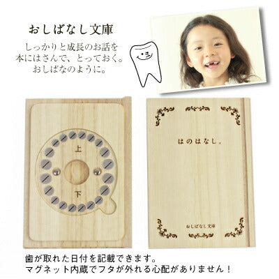- だからギフトにおすすめ。3つのポイント - 1. 飾っておきたくなるデザイン ※2016年度グッドデザイン賞受賞商品。 大切な我が子の成長のものがたりを一冊の本に… 本棚に飾れる可愛いブック型ケースです。 いつでも目の届く本棚にもスッキリ収納できるのはもちろん、 コンパクトだからインテリアとして飾っても。 ふとした時に開いて、我が子との思い出に浸る。 子供の成長を感じる、誰もがジーンとする瞬間。 大切な思い出をすぐ手に取れる場所におけば、 きっと、家族みんなが笑顔に。 ずっと大切にしまっておくものだから、 素材にはこだわりたい。 「桐」は保管に優れた通気性の良い素材。 軽くて気密性が高く防腐・防虫効果があるとも知られています。 当店の職人が一つずつ手作業で磨く桐箱。 天然の桐だから、長い年月を経て表情が変わっていきます。 お子様が大きく成長していく過程を見る様に、経年変化をお楽しみいただけます。 付属の脱脂綿をちぎって穴に詰め、抜けた歯を入れるだけ。 フタには抜けた日付を入れられるから、いつでも確認可能。 マグネット内蔵のフタだから、歯がこぼれ落ちる心配がありません。 小さい歯の場合も脱脂綿で調整していただく事が可能です。 当店は名入れギフト専門店です。 専門店ならではの技術で、ギフトにお名前を彫刻します。 「名前」は誰もが我が子の幸せを願い考え抜くもの。 だからこそ名前が入ったギフトは特別です。 記念すべき、生まれて初めての名前入りギフトに。 お友達への出産祝いとしてお選びのリピーター様多数。 ご自宅用としてご購入のお客様からは、 お子様もお喜び頂いているとのお声をいただいています! 「2人目の子供が生まれた友達への出産祝いで、 2人目にへその緒入れ、1人目にはこの乳歯入れにしました。 まだ渡してないのですが、喜んでくれたらいいな〜と。 気に入ってくれたら、自分で買い増やしていける良い商品ですね。」 「初めて歯が抜けた娘へプレゼントしました。 包みを開けるなり大喜び!毎日開けて眺めています。 商品もとても素敵で 名前を入れていただけたのもとても嬉しかったです。 親子共々 大満足です。」 「子供にいろいろ見せて選んでもらったところ、この商品がいいとなりました。 文庫本型になっているので収納しやすく、また大人な感じがするととても喜んでいました。」 いつかはお子様が大人になっても大切にしていくものだから、 ずっと飾って置けるようなものがいい。 そんな未来が楽しく想像できる、おしゃれなデザインです。 絵本を読み聞かせるように、いつかこの本を開いて話がしたい。 生え変わりの時期に「こわい!」と大泣きしたこと。 痛いからご飯を食べたくない、と大騒ぎしたこと。 抜けた乳歯を輝く瞳でこのトゥースケースに入れた日のこと。 “ 大事に育ててくれたんだ ” 親が大切に想う気持ちが子どもに伝わるギフトです。 生まれたこどもの数だけある いのちの「はなし」。 本棚に本を並べるようにしまえる、 かけがえのない想い出を「文庫」のカタチの桐箱に。 |