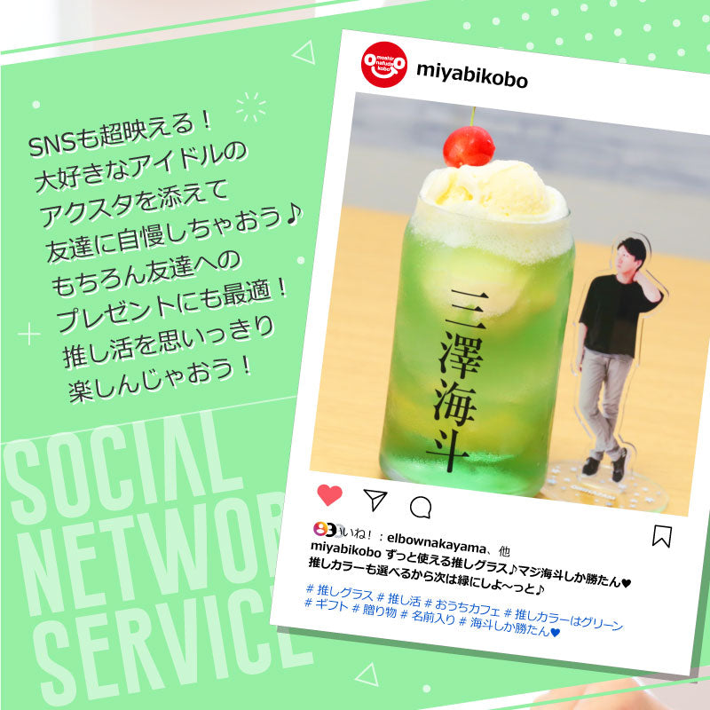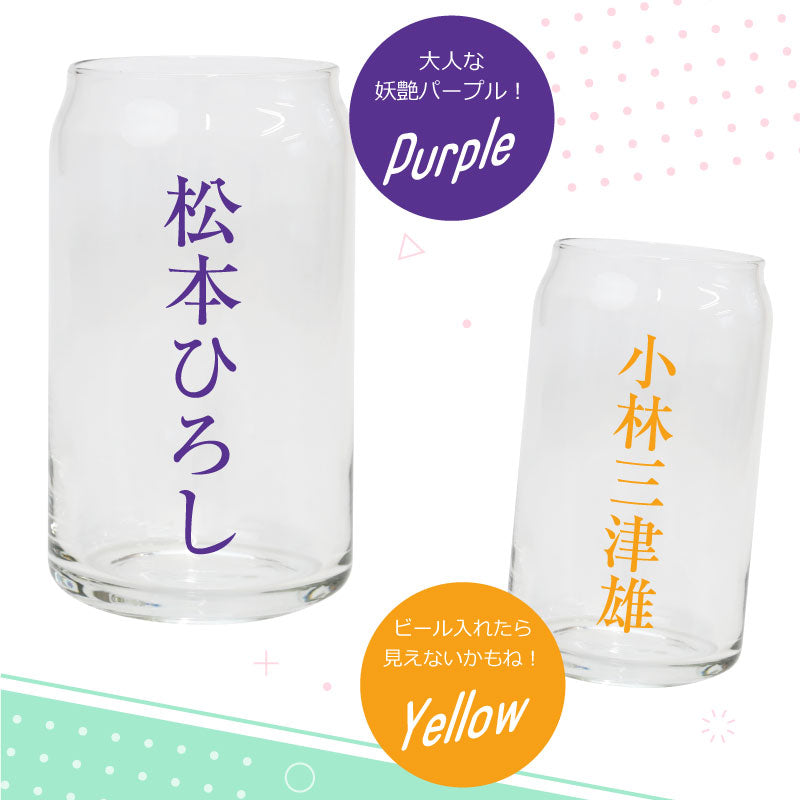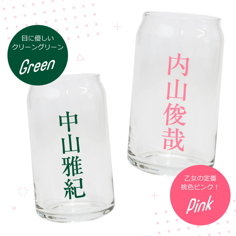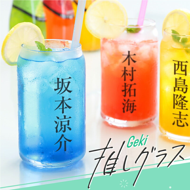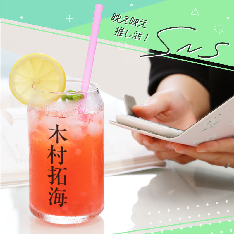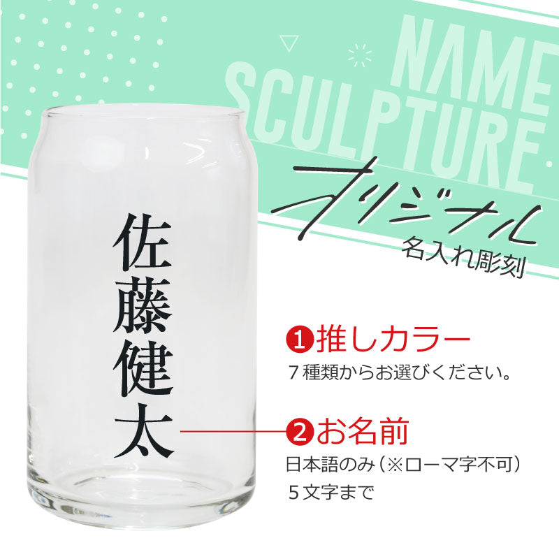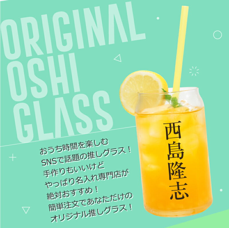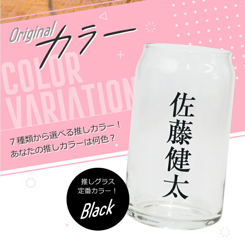 おうち時間で推しをアピール。 インスタ映え間違いなしの推しグラスで かわいく推し活しよう! 1) とにかく映える 推しグラス 推しグラスとは、グラスの表面に名前を入れたグラスのこと。 SNS上でも話題になって、 10代 20代 の間で瞬く間にトレンドになりました。 人気の秘訣はなんといってもこのインパクト。 グラスの真ん中に書かれたデカ文字は圧倒的存在感を放つので 動画や写真でもとにかく目立つ! 推しの布教にはもってこいのアイテムです。 2)おうち時間を充実に!楽しみ方それぞれの推し活 - おうちライブ - お菓子とDVDを持ち寄って、準備ができたら開演! 友だち同士で集まって、おうちライブで盛り上がろう♪ こんな時、なにより欠かせないのが"推しグッズ"。 推しグラスなら、あなたの 推しメン カラーのドリンクでアピールもばっちり。 メンカラが無い場合はかき氷シロップを炭酸で割って作るのも◎。 SNSでも バズる こと間違いなしの映えグラス。 アクスタや写真と一緒に撮ると、 推しへの愛もよりいっそう伝わってきますね。 ‐ おうちカフェ ‐ マイグラス なら、いつもよりおいしく飲める。 色んなドリンクを作っておうちカフェを開くのもおすすめです。 喫茶店の定番といえばやっぱりクリームソーダ。 カラフルポップな見た目で SNS映え 抜群です。 シンプルにコーヒー牛乳を注ぐだけでもカフェ風に。 明朝体のフォント文字がいい感じに昭和レトロ感を出しますよ。 推しをイメージしたドリンクを自作するのも楽しみ方の一つです。 ‐ おうち居酒屋 ‐ コロナ禍でなかなか外食が出来ないからこそ 家で居酒屋気分を楽しむ人も増えているんです。 居酒屋メニューを用意してグッズや写真を並べれば 推しと一緒に飲み会開催している気分。 缶型グラスだから、ビールもよく似合います。 韓国俳優 や K-POPアイドル 推しなら、韓国料理を並べるとそれらしくなりますね。 お品書きを手作りすればお店っぽさもUP。 大人感が一気に出て、おしゃれに推し活できますよ。 3)お名前彫刻 もちろんお名前も当店で彫刻いたします。 名入れ専門店だからできるレーザー彫刻の技術! 職人の手でひとつひとつ丁寧に施しております。 彫刻したお名前は消える事がございませんので、 贈り物としても大変喜ばれます。 フォントのカラーは全7色。 あなたのメンカラもきっと見つかるはず。 ・ 赤 ・ 青 ・ 黄色 ・ 緑 ・ 紫 ・ ピンク ・ 黒 ≪こんなシーンにおすすめ≫ ・ SNSネイティブな 10代 20代 の若者に ・ インスタやTikTok をやっている 男性 女性 に ・ オタ活 友だちへのサプライズプレゼントに |