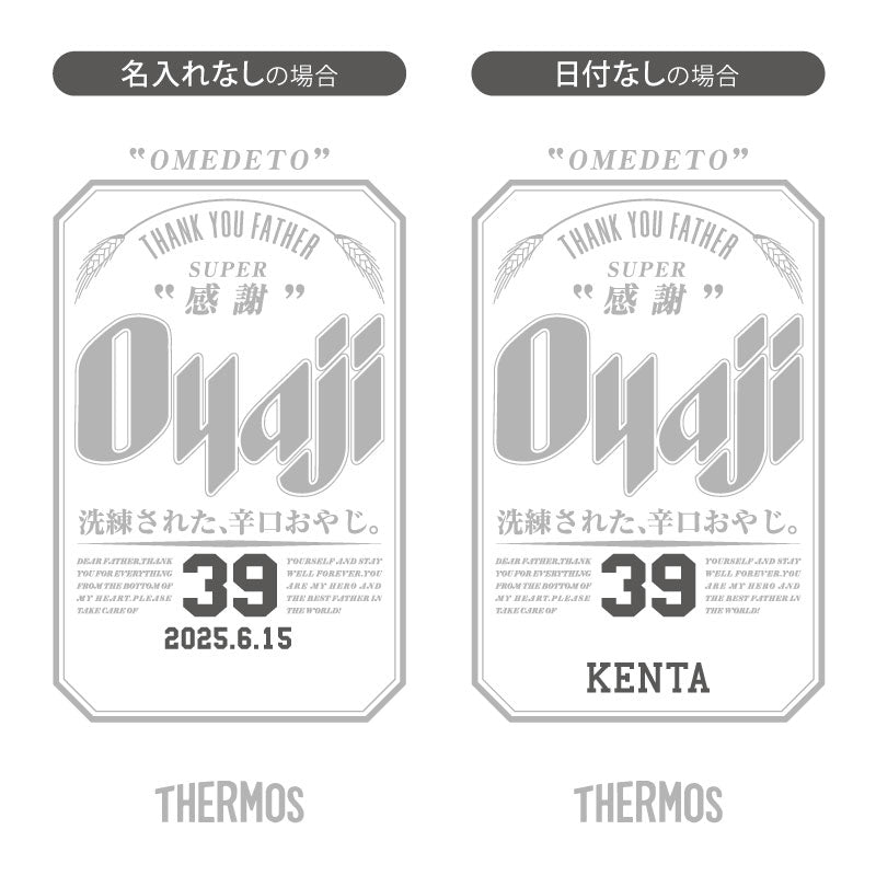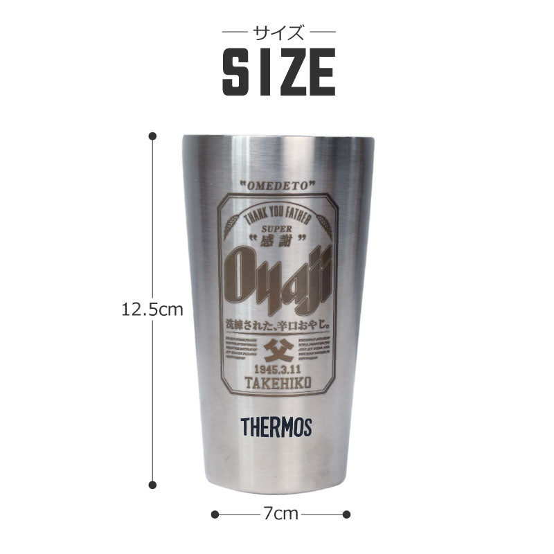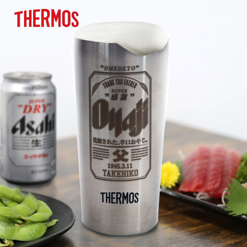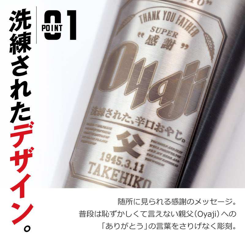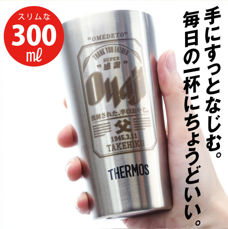 大人気の サーモスタンブラー から スタイリッシュなJDIシリーズが登場。 機能性抜群のビールタンブラーに 当店だけのとっておき!おもしろデザインを彫刻しました。 圧倒的なインパクトある父へのプレゼント、 思わず笑いがこみ上げるおもしろ グラス です。 1) 安心・信頼のサーモスブランド - 機能性 - キンキンに冷えたビールを楽しみたいなら、 タンブラー選びにもこだわりを! このタンブラーは、サーモスならではの ステンレス 製 真空断熱 構造で、 冷たい飲み物の温度をしっかりキープ。 注いだ直後の美味しさを損なわず、 飲みきるまでしっかり冷たさが感じられます。 「ちょっとだけ飲みたい」「冷たいうちに飲み切りたい」という方にもおすすめ。 氷を入れても溶けにくく、結露もしにくい設計なので、 テーブルが濡れる心配もなく、快適な晩酌タイムをサポートします。 普段使いにはもちろん、アウトドア や食事のお供にも便利な1本です♪ - 容量 - コンパクトでスマートなサイズ感ながら、300mlのしっかり容量。 ちょっと一杯にちょうどいい、“ちょい飲みサイズ”のタンブラーです。 缶ビール350mlはすべて注ぎきれないサイズですが、 継ぎ足しながらゆっくり味わいたい派にはむしろベスト。 時間をかけて飲んでも、真空断熱 構造で冷たさキープ。 最後の一口までしっかり冷たいのが魅力です。 冷たいお茶やアイスコーヒーにもぴったり。 食卓やデスクでも使いやすく、 省スペースで収納にも◎。 大きすぎず、でもしっかり実用的。 “ちょっと一杯”が似合う、大人のための ビールグラス です。 2)当店オリジナル!父に捧げるOyajiデザイン ビール好き なら誰もが知ってるこのデザイン。 かと思いきや、よくよく見ると真ん中に大きく刻まれた文字は “Oyaji” 親しみこもったこの愛称は、まさに子から父への贈り物。 思わず笑いがこみ上げてしまう、ユニークなデザインに仕上げました。 そのインパクトの大きさと、 気が付いた瞬間の驚きと感動は きっと忘れられないものになるはず! リモート飲みでも画面映えするから、みんなの視線を釘付けに。 仲間内でも話題になりますよ。 さりげなくデザインに馴染んだ「感謝」「THANK YOU FATHER」のメッセージは ユーモアを交えて感謝の気持ちを伝えることが出来るから、 直接言葉にするのが照れくさい人はこの ビールタンブラー を贈るのがおすすめ。 贈った側も贈られた側もこころ温まる サプライズギフトになるでしょう。 3)名入れ・日付 デザインの下部にはお好きな日付、 贈る相手のお名前を彫刻いたします。 - 日付 - 日付が入ることで目にするたびに記憶がよみがえる記念のプレゼントに。 思い出に残したい日付をご指定下さい。 - お名前刻印 - 当店自慢のレーザー加工による名入れサービスは、 職人の手でひとつひとつ丁寧に施しております。 彫刻したお名前は消える事がございませんので、 贈り物として大変喜ばれます。 世界でたった一つだけ!お父さん専用タンブラーが簡単に作れちゃいます。 名前入り だから愛着を持って永くお使いいただけます。 「自分の為に オーダー してくれたんだ」 そんな想いが伝わるから、 名入れプレゼント は贈り物にピッタリ! 私たちは、贈られた人も贈った人もみんなが笑顔になれる商品をお届けします。 ≪こんなシーンにおすすめ≫ ・ 父 義父への 父の日ギフト として ・ お父さん の 誕生日プレゼント に ・ アウトドア ビール好き のアクティブ パパ へ ・ 退職祝い 定年退職のお祝いギフトとして ・ 敬老の日のおじいちゃんのプレゼントに ・ 30代 40代 50代 60代 70代 の 男性 に |