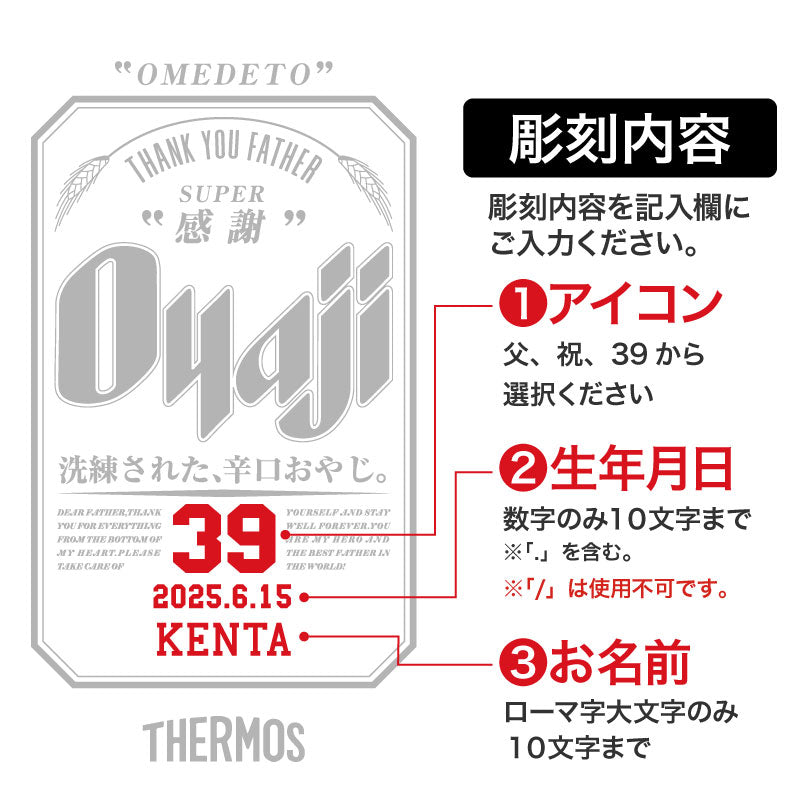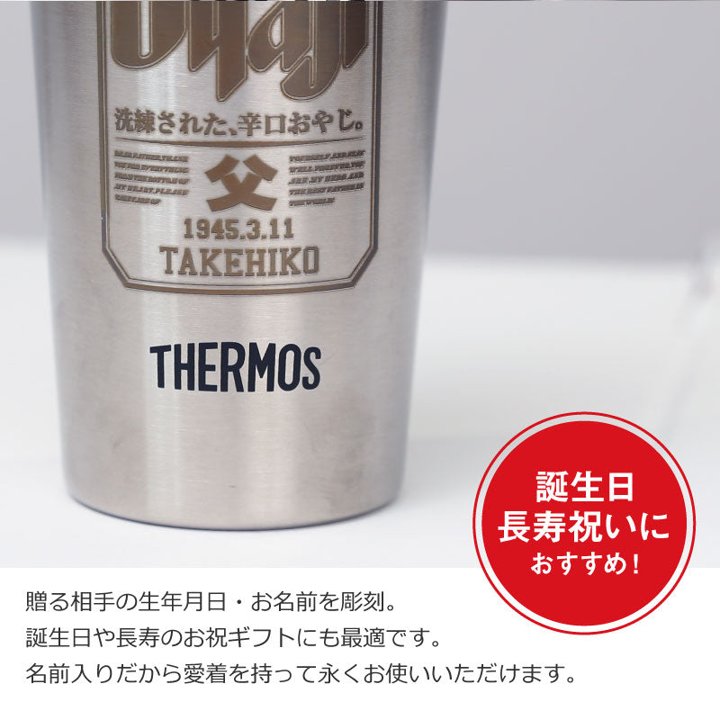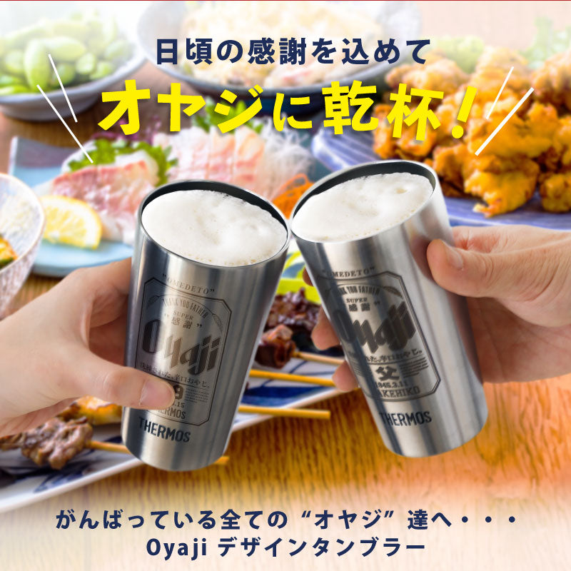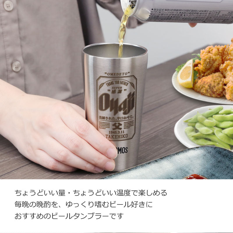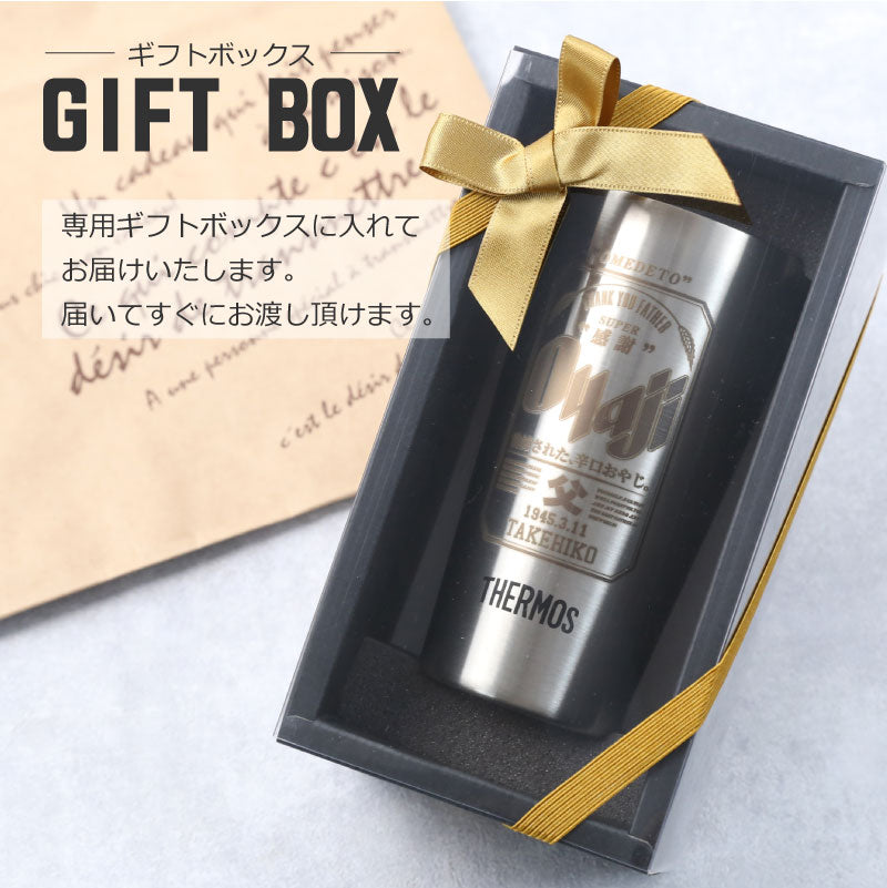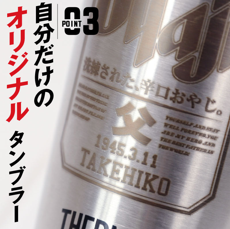 大人気の サーモスタンブラー から スタイリッシュなJDIシリーズが登場。 機能性抜群のビールタンブラーに 当店だけのとっておき!おもしろデザインを彫刻しました。 圧倒的なインパクトある父へのプレゼント、 思わず笑いがこみ上げるおもしろ グラス です。 1) 安心・信頼のサーモスブランド - 機能性 - キンキンに冷えたビールを楽しみたいなら、 タンブラー選びにもこだわりを! このタンブラーは、サーモスならではの ステンレス 製 真空断熱 構造で、 冷たい飲み物の温度をしっかりキープ。 注いだ直後の美味しさを損なわず、 飲みきるまでしっかり冷たさが感じられます。 「ちょっとだけ飲みたい」「冷たいうちに飲み切りたい」という方にもおすすめ。 氷を入れても溶けにくく、結露もしにくい設計なので、 テーブルが濡れる心配もなく、快適な晩酌タイムをサポートします。 普段使いにはもちろん、アウトドア や食事のお供にも便利な1本です♪ - 容量 - コンパクトでスマートなサイズ感ながら、300mlのしっかり容量。 ちょっと一杯にちょうどいい、“ちょい飲みサイズ”のタンブラーです。 缶ビール350mlはすべて注ぎきれないサイズですが、 継ぎ足しながらゆっくり味わいたい派にはむしろベスト。 時間をかけて飲んでも、真空断熱 構造で冷たさキープ。 最後の一口までしっかり冷たいのが魅力です。 冷たいお茶やアイスコーヒーにもぴったり。 食卓やデスクでも使いやすく、 省スペースで収納にも◎。 大きすぎず、でもしっかり実用的。 “ちょっと一杯”が似合う、大人のための ビールグラス です。 2)当店オリジナル!父に捧げるOyajiデザイン ビール好き なら誰もが知ってるこのデザイン。 かと思いきや、よくよく見ると真ん中に大きく刻まれた文字は “Oyaji” 親しみこもったこの愛称は、まさに子から父への贈り物。 思わず笑いがこみ上げてしまう、ユニークなデザインに仕上げました。 そのインパクトの大きさと、 気が付いた瞬間の驚きと感動は きっと忘れられないものになるはず! リモート飲みでも画面映えするから、みんなの視線を釘付けに。 仲間内でも話題になりますよ。 さりげなくデザインに馴染んだ「感謝」「THANK YOU FATHER」のメッセージは ユーモアを交えて感謝の気持ちを伝えることが出来るから、 直接言葉にするのが照れくさい人はこの ビールタンブラー を贈るのがおすすめ。 贈った側も贈られた側もこころ温まる サプライズギフトになるでしょう。 3)名入れ・日付 デザインの下部にはお好きな日付、 贈る相手のお名前を彫刻いたします。 - 日付 - 日付が入ることで目にするたびに記憶がよみがえる記念のプレゼントに。 思い出に残したい日付をご指定下さい。 - お名前刻印 - 当店自慢のレーザー加工による名入れサービスは、 職人の手でひとつひとつ丁寧に施しております。 彫刻したお名前は消える事がございませんので、 贈り物として大変喜ばれます。 世界でたった一つだけ!お父さん専用タンブラーが簡単に作れちゃいます。 名前入り だから愛着を持って永くお使いいただけます。 「自分の為に オーダー してくれたんだ」 そんな想いが伝わるから、 名入れプレゼント は贈り物にピッタリ! 私たちは、贈られた人も贈った人もみんなが笑顔になれる商品をお届けします。 ≪こんなシーンにおすすめ≫ ・ 父 義父への 父の日ギフト として ・ お父さん の 誕生日プレゼント に ・ アウトドア ビール好き のアクティブ パパ へ ・ 退職祝い 定年退職のお祝いギフトとして ・ 敬老の日のおじいちゃんのプレゼントに ・ 30代 40代 50代 60代 70代 の 男性 に |