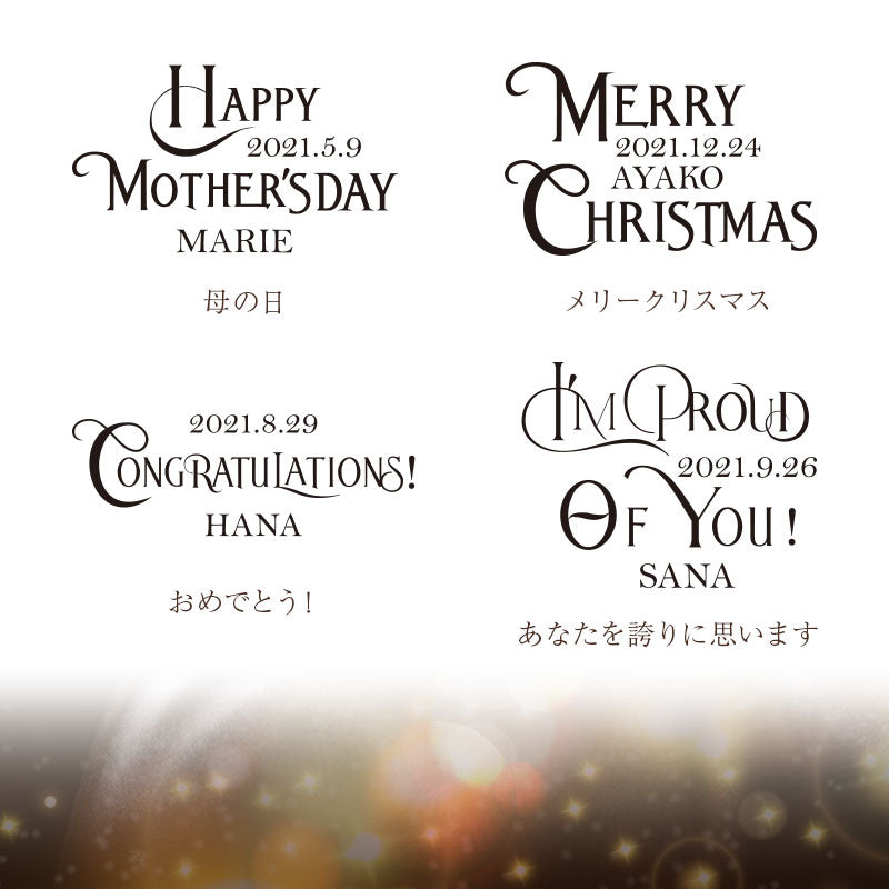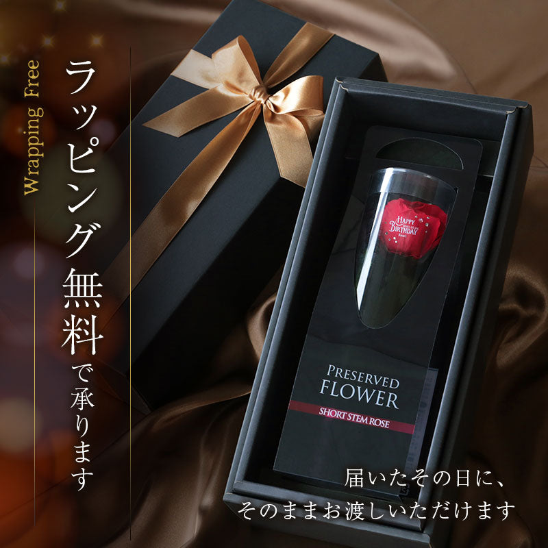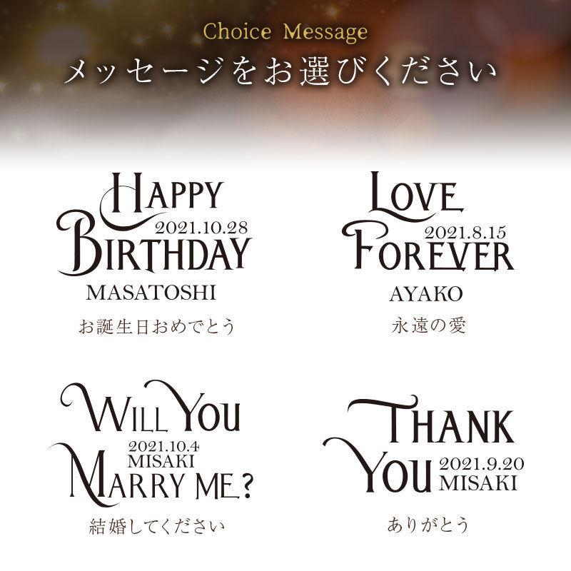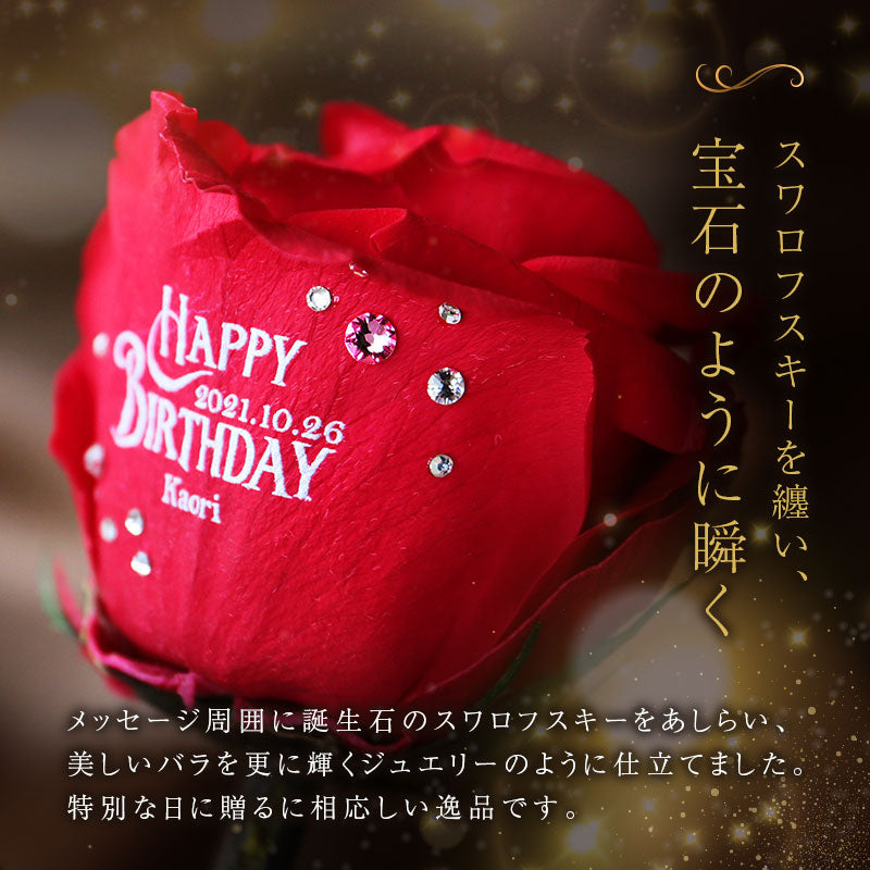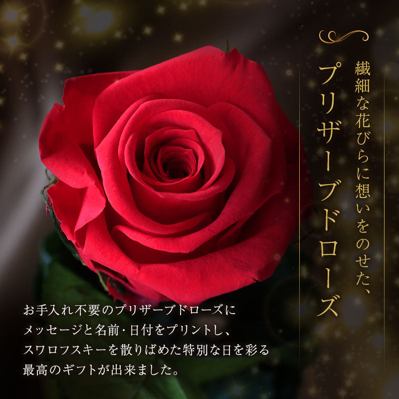 お祝いの定番であるプリザーブドフラワーに、 記念に残るメッセージと日付、特別感のある名入れを施します。 1. プリント入りプリザーブドフラワー - プリザーブドフラワー - 生花に特殊な加工を施したプリザーブドフラワーは、枯れることがなく水やりの必要もないことが大きな特徴です。 瑞々しい質感と柔らかさを長い間保つことができる、生花とドライフラワーの両方の良さを兼ね備えた 花材 です。 - 一輪の赤いバラ - 「花の女王」とも呼ばれ、愛と美の象徴となっているバラは、 愛の告白や、お祝いのシーンでは欠かせない立役者です。 薔薇は、色や贈る本数によって花言葉が変わる、ということはご存じでしょうか? 赤い薔薇の花言葉は「情熱・永遠の愛」 そして、一輪を贈ることを意味するのは「あなたしかいない」 まさに、大切な人へと想いを伝えるためにある花なのです。 - 名入れフラワーギフト - 今やフラワーギフトとして圧倒的な人気を誇るプリザーブドフラワー。 アレンジメントで独創性を表現したり、 名前を刻印したケースに収めて サプライズ を演出したりと、 さまざまなカタチで取り扱われております。 そんなプリザーブドフラワーをもっともっと特別なものに…と、 究極のオリジナリティを追及して誕生したのが、当店自慢のプリザーブドローズです。 花そのものに名入れするという斬新な発想は、他では見られない特別感を演出。 プリントの周囲に施した スワロフスキー の装飾は、まるでジュエリーのような高級感溢れる印象に。 名入れフラワーなら、ケースから取り出して飾っても特別感を損なわず、 生花のように直に触れながら、その美しさを堪能することができます。 スタッフの情熱と、繊細な花びらに細かな文字を印刷する、当店の高い技術を織りなして仕上げられたプリザーブドローズは、 ”あなただけに贈るプレゼント” このキャッチフレーズを謳うにふさわしい逸品です。 2. 記念に残るプリント 〔 日付プリント 〕 “この日の記憶をずっと残したい” そんな気持ちを叶える日付プリント。 目にする度に特別な日の思い出がよみがえります。 〔 選べる12種のメッセージ 〕 特別なギフトシーンにぴったりなメッセージが12種類。 大切な相手の事を想いながらお選びください。 ・ Happy Birthday お誕生日おめでとう ・ Love Forever 永遠の愛 ・ Will you marry me? 結婚してください ・ Thank You ありがとう ・ Just For You あなただけのために ・ Happy Wedding 結婚おめでとう ・ Anniversary 記念日 ・ Happy White Day ホワイトデー ・ Happy Mother's Day 母の日 ・ Merry Christmas メリークリスマス ・ Congratulations! おめでとう! ・ I'm proud of you! あなたを誇りに思います 〔 選べる12誕生石 〕 豪華に散りばめたスワロフスキーの中に、ひときわ目を惹く輝きを。 誕生石 を一粒アクセントに加え、デコレーションいたします。 ・ 1月 - ガーネット - ・ 2月 - アメシスト - ・ 3月 - アクアマリン - ・ 4月 - ダイアモンド - ・ 5月 - エメラルド - ・ 6月 - パール - ・ 7月 - ルビー - ・ 8月 - ペリドット - ・ 9月 - サファイア - ・10月 - トルマリン - ・11月 - シトリン - ・12月 - タンザナイト - 3. お名前プリント 名入れギフト専門店の当店が、気持ちを込めてお名前をプリントいたします。 「 どうして 名前入り が喜ばれるの? 」 自分の名前が入った商品は世界にただ一つだけ。 “ 自分の事を考えながら選んでくれたんだ ” そんな風に感じさせてくれます。 だから、相手を大切に想う気持ちがより伝わります。 さらにお名前プリントはずっと消えずに残るから、永く愛着を持って飾っていただけます。 だから、「名入れギフト」は大切な人に感謝の気持ちを伝えるのにぴったりなおくりもの。 私たちは、贈った人も受けとった人もみんなが笑顔になれる商品をお届けします。 〔こんなシーンでおすすめ〕 ・ 婚約者 彼女 奥様 恋人 女友達 への プレゼント に ・ 20代 30代 40代 50代 60代 女性に ・ 好きな人 への プロポーズ 告白 に合わせて ・ 友人の 結婚祝い 開店祝い に ・ 記念日 結婚記念日 入学祝い 卒業祝い に ・ 退職祝い 誕生日プレゼント に |