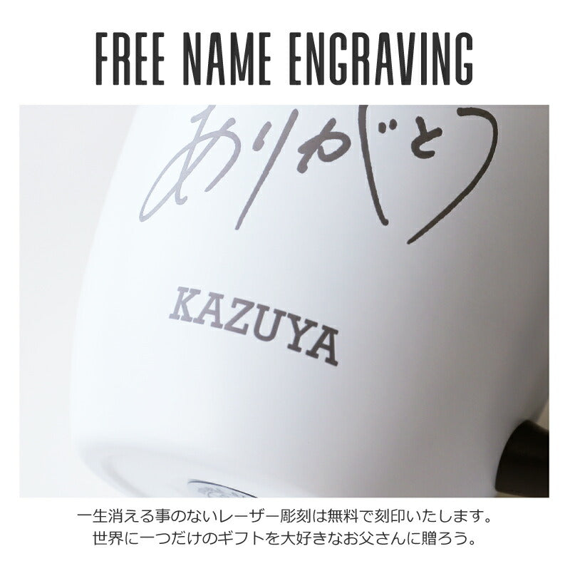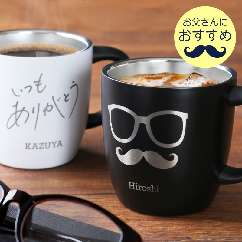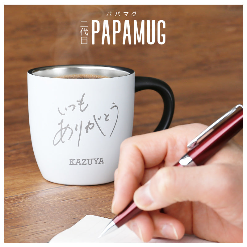 大人気マグカップ『パパマグ』がリニューアル! 感謝の気持ちがダイレクトに伝わるメッセージデザインと、 お父さんのアイコンでお馴染みのひげメガネ!! デザインだけじゃない!機能性もリニューアル! コーヒー好きのためのふた付きコーヒーマグカップは 長時間美味しい温度でコーヒーを楽しめます! もちろん、ジュースやお茶、お酒でもOK! ご自宅でも会社でも、お洒落で機能的なパパマグは使う場所や、使う人を選びません。 全てのお父さんに「 心からのありがとう 」が伝わるギフトです。 ・・・パパがもらってうれしい!2つのおすすめポイント・・・ [1.デザイン] 会社でパパも思わず「これ、子供にもらったんだよ〜」とみんなに自慢したくなる、 おしゃれなデザイン♪ 【選べるデザインは2種類!】 1.お父さんのアイコンと言ったら、かわいいひげメガネ♪POPでキュートなデザインはお父さんを笑顔にする事間違いなし! 2.想いがダイレクトに伝わるメッセージデザイン!マグカップのフロントに大胆に彫刻された「いつもありがとう」ちょっと照れくさくて言えない感謝の気持ちを伝えよう! [2.機能性] <リニューアルPoint> 1.汚れやニオイも抑えるクリーンミラー加工。 表面の凸凹が少なくニオイや汚れが付きにくい、クリーンミラー加工でお手入れも簡単。 2.ワイドな飲み口が飲みやすさUP! 専用フタの飲み口が、従来より大きくなって飲みやすい!スライド式だから開閉も楽々♪ もちろん真空断熱構造だから、保温・保冷機能も搭載!空調が効きすぎてしまうオフィスですぐ冷めてしまうコーヒーも最適温度をキープ。結露しないからオフィスでの使用にとっても最適です。 落としても割れないステンレス製はどこで使っても安心、 専用のフタ付きではホコリも防ぎます! コロンとかわいいフォルムは安定感抜群!男性の大きな手でも持ちやすい、取っ手も幅広で使いやすさを重視しています。 【名入れ無料サービス。】 お名前を彫刻致します。 当店自慢のレーザー加工による名入れサービスは、 職人の手でひとつひとつ丁寧に施しております。 彫刻したお名前は消える事がございませんので、 贈り物として大変喜ばれます。 オリジナルBOXだから贈り物に最適。 オリジナルのギフトボックスに入れてお届けいたします。 たとえばこんなシーンに・・・ お父さんの 誕生日 退職祝い 還暦祝い 古希 喜寿 米寿 父の日など、 20代 30代 40代 50代 60代 70代 80代 年代を問わずお喜びいただけます。 |