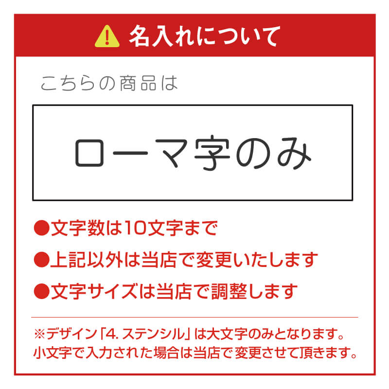 プリントする文字は「入力欄」へご記入下さい。 【お名前】ローマ字(大文字)のみ ※日本語不可 文字数は10文字までとさせていただきます。 ・上記以外は当店で変更します ・文字サイズは当店で調整します |