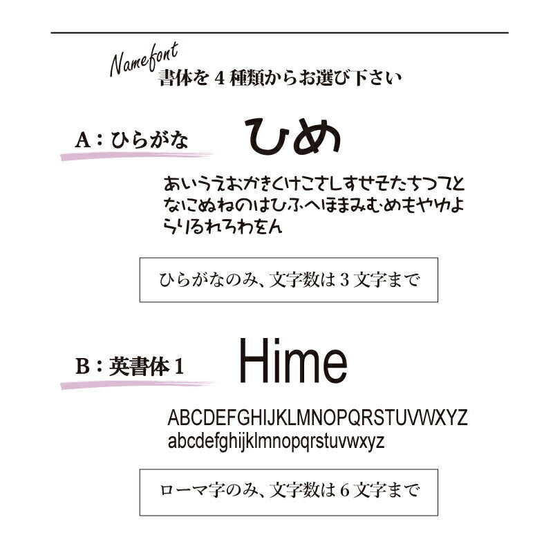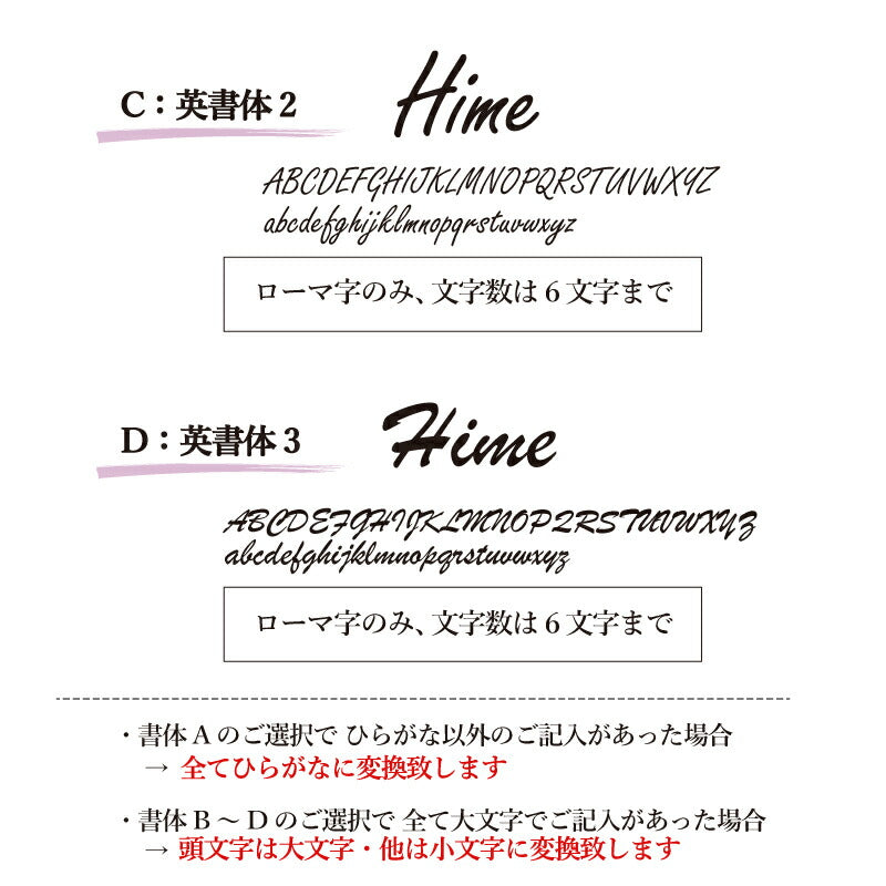 彫刻する文字は「入力欄」へご記入下さい。 【お名前】日本語・ローマ字OK 文字数は【日本語】3文字まで【ローマ字】6文字までとさせていただきます。 ・上記以外は当店で変更します ・文字サイズは当店で調整します |