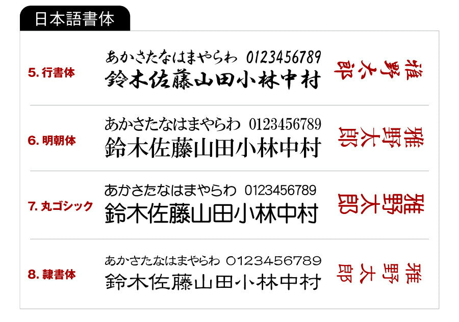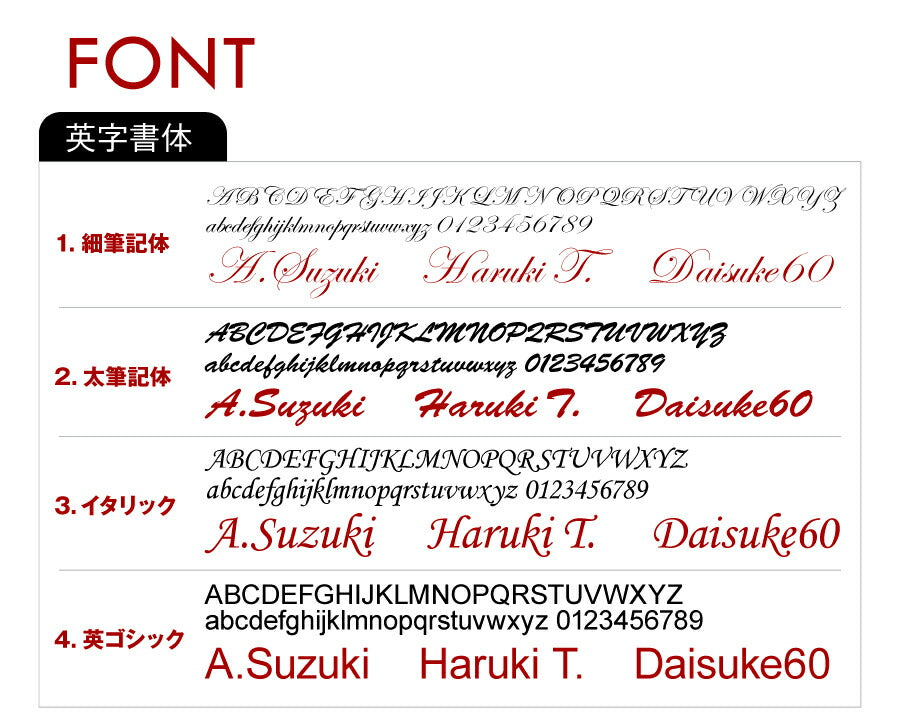| 名入れ | 彫刻する文字は「入力欄」へご記入下さい。 【お名前】日本語・ローマ字OK 文字数は【日本語】6文字まで【ローマ字】12文字までとさせていただきます。 【日本語とローマ字 混合の彫刻内容】の場合は日本語書体に合わせて彫刻します。書体は日本語書体からお選びください。 1.細筆記体・2.太筆記体は 全て大文字で記載の場合は、頭文字大文字+小文字になります。 3.イタリックはお客様から頂いた表記のままになります。 ・上記以外は当店で変更します ・文字サイズは当店で調整します |