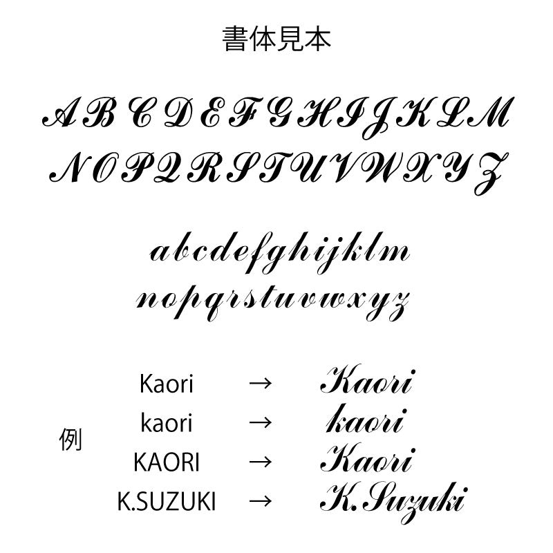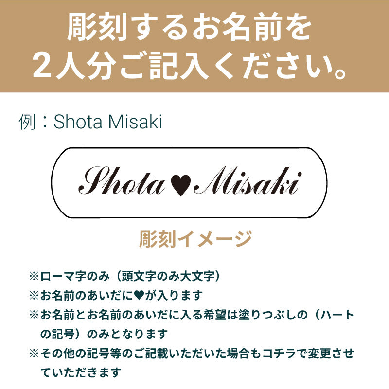 彫刻する文字は「入力欄」へご記入下さい。 【お名前】ローマ字のみ ※日本語不可 文字数は14文字までとさせていただきます。 ※お名前の間にハートマークがはいります。 ・上記以外は当店で変更します ・文字サイズは当店で調整します |