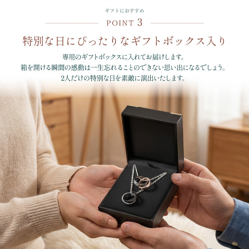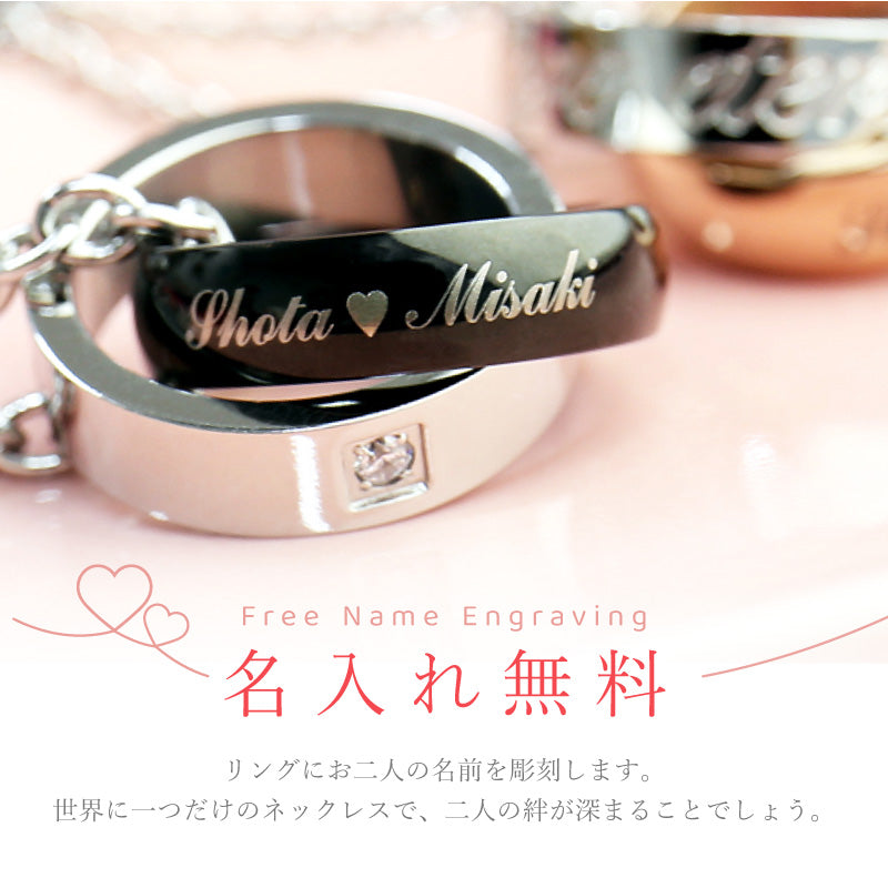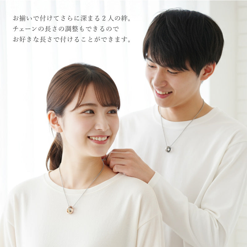 さりげないお名前彫刻デザイン。 ふたりの絆がより一層深くなるペアギフト。 二人の大切な記念日にふさわしい、ペアネックレス。 - 3つのおすすめポイント - 1. シンプルデザイン どんな服装にも合う、シンプルなデザイン。 埋め込まれたクリスタルが高級感溢れる仕上がり。 シルバーのチェーン・リングをベースに 色違いの名入りリングがそれぞれに連なります。 男性はブラック、女性はピンクゴールドと ファッションを選ばないカラーリング。 シルバーのリングには イタリア語で「永遠の愛」を意味する 【amore eterno】の刻印入り。 2人の結びつきがより強くなるメッセージ。 未来を約束するような言葉にきっと2人の絆が深まります。 人気 の ダブルリング はおしゃれで洗練された印象。 普段使いにもぴったりです。 仕事上指輪を付けられない方でもサッと身に着けることが出来ます。 彼女から彼氏へ サプライズプレゼント、 喜んでもらえるかな?と不安な方も。 こちらのネックレスなら、恥ずかしがりやさんでも大丈夫。 さりげない 名前入り デザインだから、悪目立ちせず上品な印象。 お客様からは「喜んでもらえました!」と嬉しいお声が届いています♪ もちろん、男性 から 女性 へのギフトとしても喜ばれています! 直接身に着けるものだから、金属アレルギーに対する不安も。 こちらはステンレス316を使用。 金属アレルギーに強い素材です。 さらに、メンテナンス不要。さびや変色も無くずっとご愛用いただけます。 お客様からご満足の声をいただいている、当店のギフトラッピング。 ・高級感のあるジュエリーボックス ・ゴールドリボン ・手提げ袋 豪華3点セット付き! だから届いてすぐにお渡しいただけます。 箱を見た瞬間、何か特別な贈り物が入っているのかな・・・?と 期待に胸が膨らむ瞬間です。 パカッと開けて、愛の言葉と共に手渡し。 中には「泣くほど喜んでくれました」というお客様も。 特別なラッピングでより一層の感動をお届けします。 ・ 彼氏 から 彼女 への 誕生日プレゼント に ・ 旦那さん への 結婚記念日 のギフトとして ・ バレンタイン に 彼女 から 彼氏 へ ・ ホワイトデー のお返しに 恋人 へ ・ 初めての ペアアクセサリー をお探しの カップル に ・ 愛を確かめ合う 夫婦 恋人 パートナー でおそろいに ・ なかよしの 友達 と おそろい で ・ 10代 20代 30代 40代 男性 女性 への プレゼントに |
