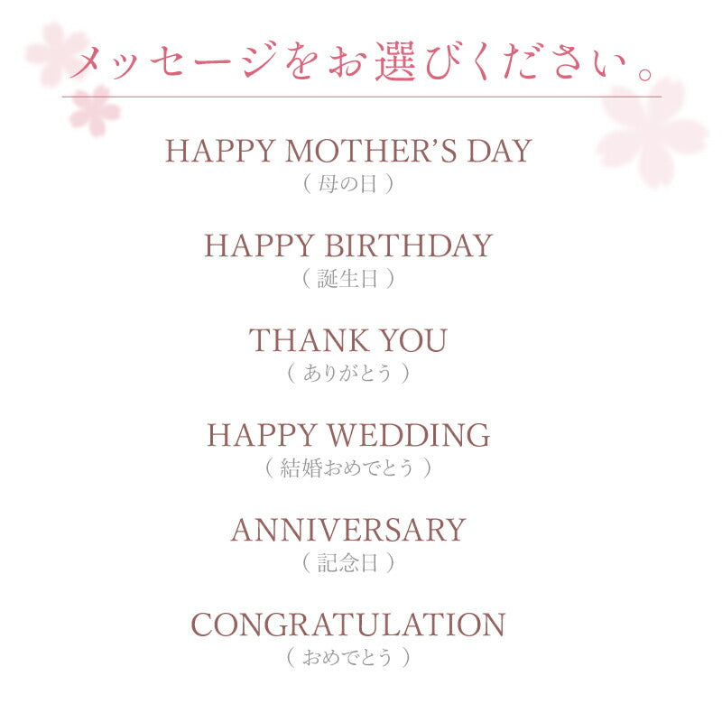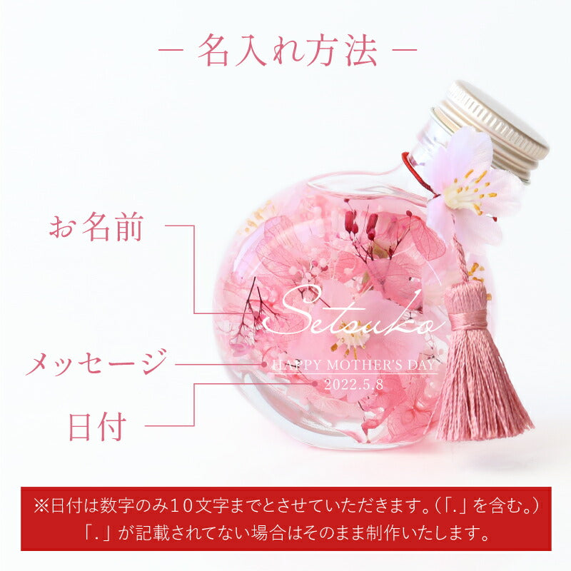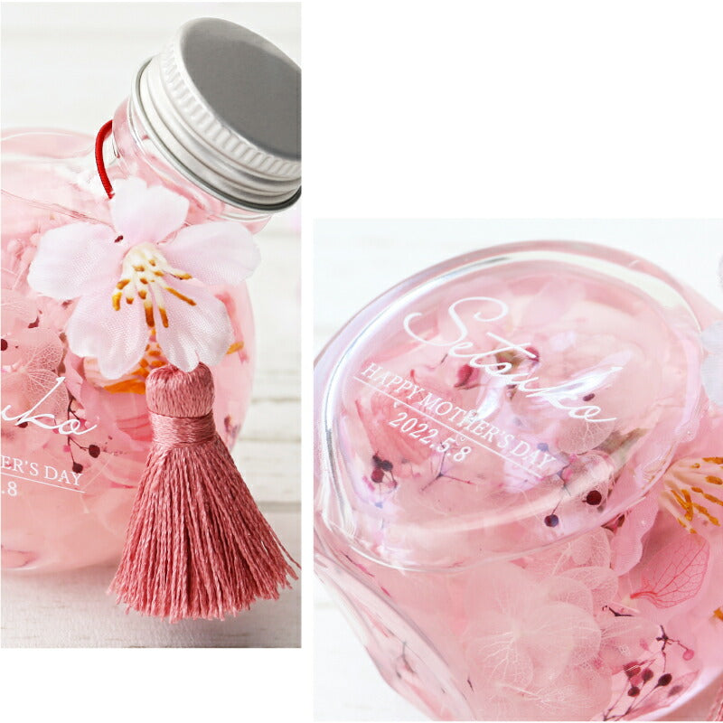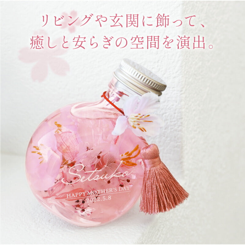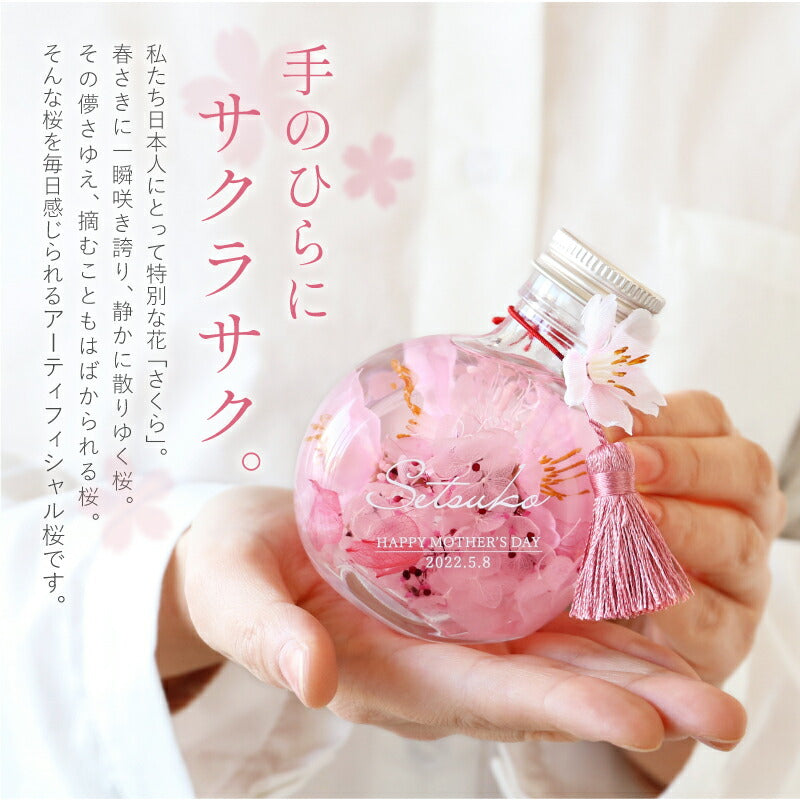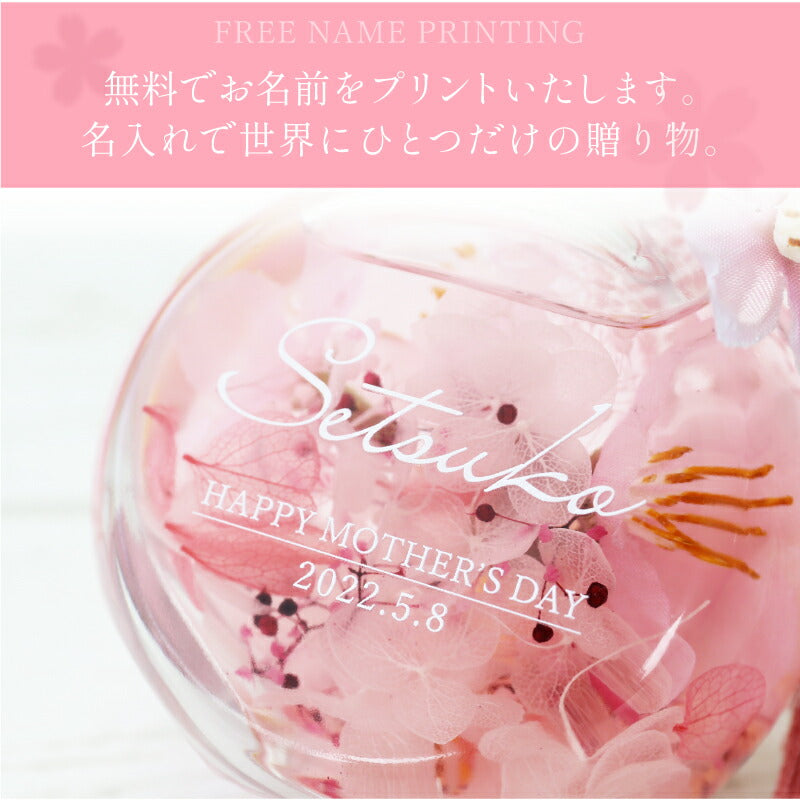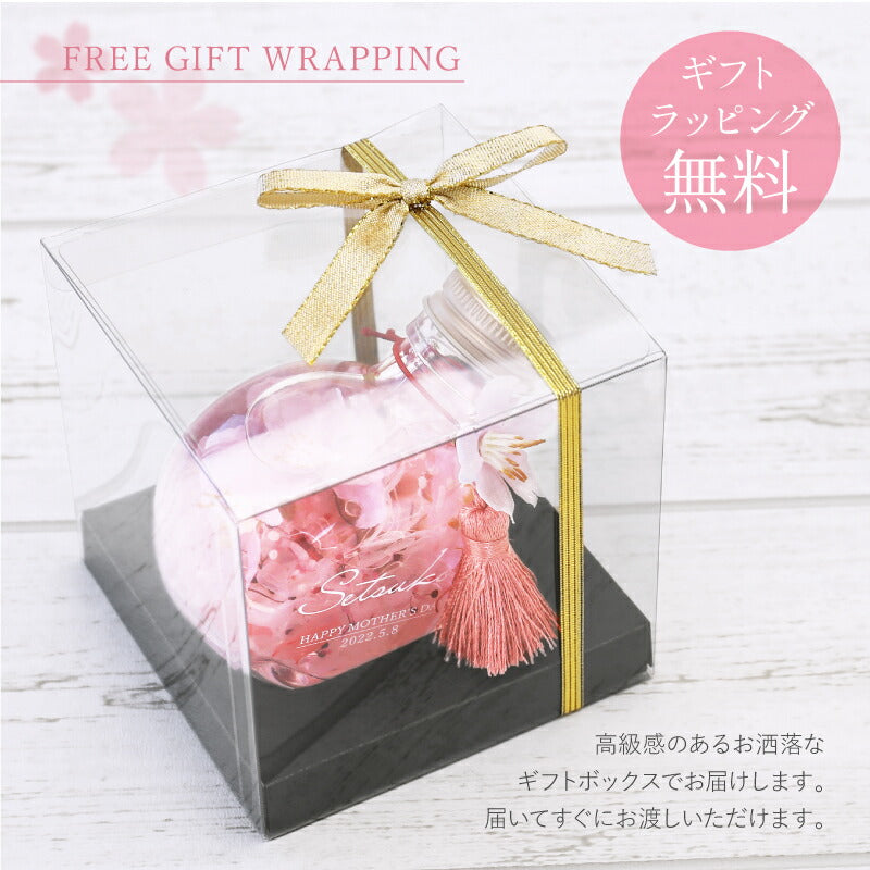 ふんわり優しい春の香りをつれてくる桜のハーバリウム。 リビングや玄関に飾って、癒しと安らぎの空間を演出。 1. 癒しのフラワーインテリア ハーバリウム お花ギフトは女性へのマストアイテム! しかもハーバリウムはお手入れ簡単でなが〜く楽しめるから大変喜ばれます。 ハーバリウムとはドライフラワー や プリザーブドフラワー を ガラス瓶に入れて楽しむフラワーインテリアです。 もともとハーバリウムは「 植物標本 」という意味もあるように 専用のオイルに浸すことで、独特の透明感と浮遊感が出て、 水の中をひらりと舞う幻想的な お花 の姿を楽しむことが出来ます。 そして近頃話題になっているのが アーティシャルフラワー(造花)を使ったハーバリウムで、 その名もアーティリウム!! 光に溶けて透き通る姿が美しく、見ているだけで癒される♪ リビングや玄関に飾るだけでお家が華やかになります。 いつも家庭を守ってくれているお母さんへ、母の日 にプレゼントしてみるのはいかがでしょうか? お花や植物鑑賞が好きな方にはもちろん、 小物 や インテリア にこだわる方にも おすすめ ! お手入れ不要で、一年以上綺麗が持続するお手ごろさも 人気 のポイントです。 2. アーティフィシャル桜 私たち日本人にとって特別な花「さくら」。 入学式にお母さんと一緒に校門前で撮った写真に映り込む桜。 新しい場所へ旅立つ卒業生を見守るかのように咲くサクラ。 春さきに一瞬咲き誇り、静かに散りゆく桜。 その儚さゆえ摘むこともはばかられる桜。 このハーバリウムに使用しているのは、“アーティフィシャルフラワー”。 アーティフィシャルフラワーとは文字通り「芸術的な花」。 品質や表現にこだわり、本物の桜に最大限近づけた造花とは思えない人工の花です。 実際わたしも【 SAKURAハーバリウム 】を観たとき本物としか思えませんでした。 天然の花よりも耐久性があり、長く鑑賞を楽しめるのも特徴です。 コロンとかわいい 丸型 のガラス瓶に満開のさくらを閉じ込め、和風のタッセルをアクセントに 手のひらに乗るコンパクトなサイズでありながら華やかな雰囲気をまとっています。 桜の花があるだけで、いつものお部屋がほっと安らぐ空間に。 一年中春の麗らかな雰囲気に包まれてお過ごしいただけます。 おうち花見 や ひな祭り にもぴったり♪ さまざまなお祝いごとの贈り物としてはもちろん、 海外でお住いの方へのプレゼントとしても喜ばれることでしょう。 3. お名前・日付・メッセージ プリント ハーバリウムの瓶には 贈る相手のお名前と、記念になる日付、贈る方に伝えたいメッセージを焼き付けます。 和柄にしがちなサクラに、あえてスタイリッシュな筆記体フォントを使用。 お花に溶け込むようなさりげないデザインです。 〔 名入れプリント 〕 名入れギフト専門の当店スタッフが心を込めてお名前をプリントいたします。 「 どうして名前入りが喜ばれるの? 」 普段あまりにも身近にあるので、自分の名前のことを深く考えることはありませんが 贈られた商品に自分の名前が刻まれていたらどうでしょう。 しかも特殊な技法で彫り込まれていたり素敵なデザインとなってプリントされていたり・・ その瞬間、ただの“商品”ではなく“自分だけの大切なもの”に変化します。 そして贈ってくれた方の真心を感じ、自然に笑顔がこぼれることでしょう。 名前はその人にとって唯一無二、かけがえのないものです。 私たちはそのお名前を大切に、贈る人、贈られる人、両方の笑顔を想いながら商品を送り出します。 当店の名前プリントはずっと消えずに残り、永く愛着を持ってお使いいただけることでしょう。 〔 日付 〕 日付が入ることで目にするたびに記憶がよみがえる記念のプレゼントに。 思い出に残したい日付をご指定下さい。 〔 選べるメッセージ5種類 〕 ・ HAPPY MOTHER'S DAY(母の日) ・ HAPPY BIRTHDAY(お誕生日おめでとう) ・ THANK YOU(ありがとう) ・ HAPPY WEDDING(結婚おめでとう) ・ ANNIVERSARY(記念日) ・ CONGRATULATION(おめでとう) ≪こんなシーンにおすすめ≫ ・ 桜の季節に生まれた方への 誕生日プレゼント として ・ おかあさん ママ 母親 母 義母 お義母さん への 母の日ギフト に ・ 友達 の 結婚祝い 結婚記念日 出産祝い に ・ 彼女への クリスマス ホワイトデー のプレゼントに ・ お花 が好きな 20代 30代 40代 50代 60代 70代 80代 の女性へ ・ 上司 先輩 後輩 の 転勤祝い 昇進祝い 定年退職 退職祝い の ギフトとして ・ 就職祝い 新築祝い 引越し祝い 開店祝い などの門出のお祝いに ・ 学生さんの 合格祝い 卒業祝い 入学祝い ギフトとして ・ お見舞い や 快気祝い の花として |