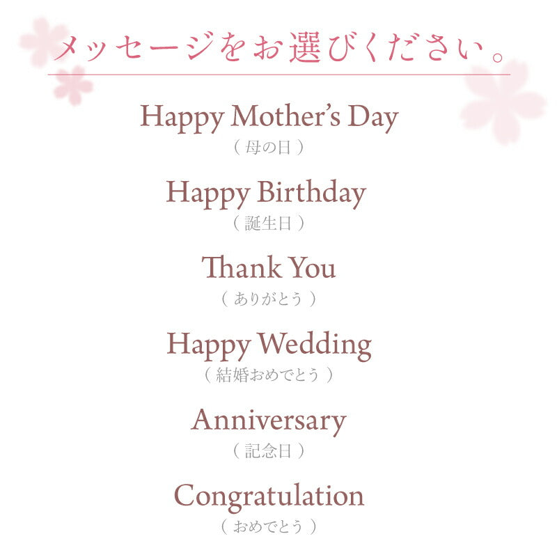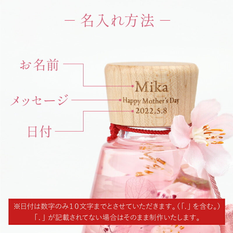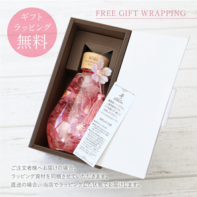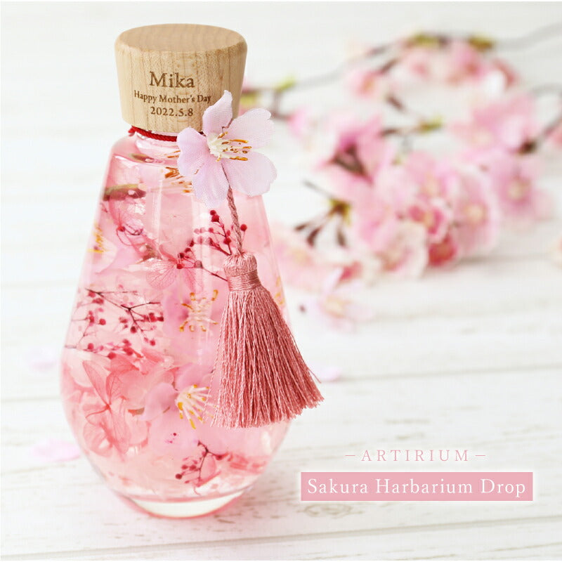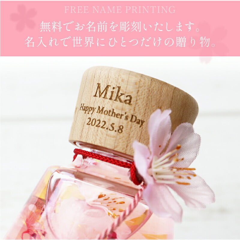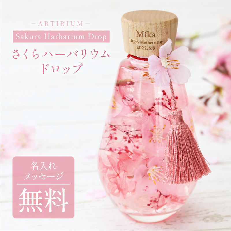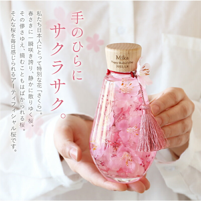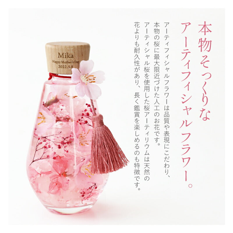 ふんわり優しい春の香りをつれてくる桜のハーバリウム。 リビングや玄関に飾って、癒しと安らぎの空間を演出。 1. 癒しのフラワーインテリア ハーバリウム お花ギフトは女性へのマストアイテム! しかもハーバリウムはお手入れ簡単でなが〜く楽しめるから大変喜ばれます。 ハーバリウムとはドライフラワー や プリザーブドフラワー を ガラス瓶に入れて楽しむフラワーインテリアです。 もともとハーバリウムは「 植物標本 」という意味もあるように 専用のオイルに浸すことで、独特の透明感と浮遊感が出て、 水の中をひらりと舞う幻想的な お花 の姿を楽しむことが出来ます。 そして近頃話題になっているのが アーティシャルフラワー(造花)を使ったハーバリウムで、 その名もアーティリウム!! 光に溶けて透き通る姿が美しく、見ているだけで癒される♪ リビングや玄関に飾るだけでお家が華やかになります。 いつも家庭を守ってくれているお母さんへ、母の日 にプレゼントしてみるのはいかがでしょうか? お花や植物鑑賞が好きな方にはもちろん、 小物 や インテリア にこだわる方にも おすすめ ! お手入れ不要で、一年以上綺麗が持続するお手ごろさも 人気 のポイントです。 2. アーティフィシャル桜 私たち日本人にとって特別な花「さくら」。 入学式にお母さんと一緒に校門前で撮った写真に映り込む桜。 新しい場所へ旅立つ卒業生を見守るかのように咲くサクラ。 春さきに一瞬咲き誇り、静かに散りゆく桜。 その儚さゆえ摘むこともはばかられる桜。 このハーバリウムに使用しているのは、“アーティフィシャルフラワー”。 アーティフィシャルフラワーとは文字通り「芸術的な花」。 品質や表現にこだわり、本物の桜に最大限近づけた造花とは思えない人工の花です。 実際わたしも【 SAKURAハーバリウム 】を観たとき本物としか思えませんでした。 天然の花よりも耐久性があり、長く鑑賞を楽しめるのも特徴です。 コロンとかわいい 丸型 のガラス瓶に満開のさくらを閉じ込め、和風のタッセルをアクセントに 手のひらに乗るコンパクトなサイズでありながら華やかな雰囲気をまとっています。 桜の花があるだけで、いつものお部屋がほっと安らぐ空間に。 一年中春の麗らかな雰囲気に包まれてお過ごしいただけます。 おうち花見 や ひな祭り にもぴったり♪ さまざまなお祝いごとの贈り物としてはもちろん、 海外でお住いの方へのプレゼントとしても喜ばれることでしょう。 3.ドロップ型ガラス瓶 コロンしたフォルムが可愛いしずく型の瓶を使用。 ガラスの丸みによって中のお花が膨張して見えるため、華やかな雰囲気に♪ 置く角度を変えればいろんな表情を楽しむことが出来ます。 高さのないボトルなので省スペースでどこでも置ける。 玄関先、キッチン、リビングなどどんな場所にも彩りを添え、ほっと一息つく空間に。 4. お名前・日付・メッセージ 彫刻 木製のボトルキャップには 贈る相手のお名前と、記念になる日付、贈る方に伝えたいメッセージを焼き付けます。 ハ—バリウムの自然な雰囲気に合わせたさりげなく控えめな刻印が、 どんな女性にも喜ばれるデザインとなっております。 〔 名入れ彫刻 〕 名入れギフト専門の当店スタッフが心を込めてお名前を彫刻いたします。 「 どうして名前入りが喜ばれるの? 」 普段あまりにも身近にあるので、自分の名前のことを深く考えることはありませんが 贈られた商品に自分の名前が刻まれていたらどうでしょう。 しかも特殊な技法で彫り込まれていたり素敵なデザインとなってプリントされていたり・・ その瞬間、ただの“商品”ではなく“自分だけの大切なもの”に変化します。 そして贈ってくれた方の真心を感じ、自然に笑顔がこぼれることでしょう。 名前はその人にとって唯一無二、かけがえのないものです。 私たちはそのお名前を大切に、贈る人、贈られる人、両方の笑顔を想いながら商品を送り出します。 当店の名前彫刻はずっと消えずに残り、永く愛着を持ってお使いいただけることでしょう。 〔 日付 〕 日付が入ることで目にするたびに記憶がよみがえる記念のプレゼントに。 思い出に残したい日付をご指定下さい。 〔 選べるメッセージ5種類 〕 ・ HAPPY MOTHER'S DAY(母の日) ・ HAPPY BIRTHDAY(お誕生日おめでとう) ・ THANK YOU(ありがとう) ・ HAPPY WEDDING(結婚おめでとう) ・ ANNIVERSARY(記念日) ・ CONGRATULATION(おめでとう) ≪こんなシーンにおすすめ≫ ・ 桜の季節に生まれた方への 誕生日プレゼント として ・ おかあさん ママ 母親 母 義母 お義母さん への 母の日ギフト に ・ 友達 の 結婚祝い 結婚記念日 出産祝い に ・ 彼女への クリスマス ホワイトデー のプレゼントに ・ お花 が好きな 20代 30代 40代 50代 60代 70代 80代 の女性へ ・ 上司 先輩 後輩 の 転勤祝い 昇進祝い 定年退職 退職祝い の ギフトとして ・ 就職祝い 新築祝い 引越し祝い 開店祝い などの門出のお祝いに ・ 学生さんの 合格祝い 卒業祝い 入学祝い ギフトとして 