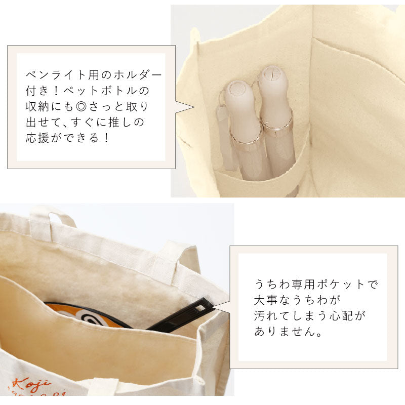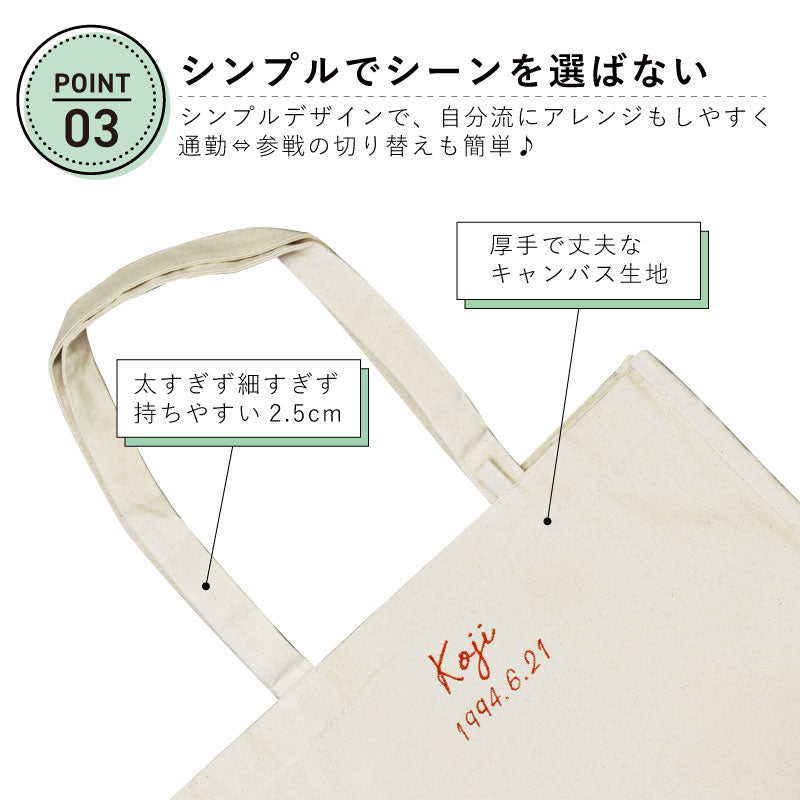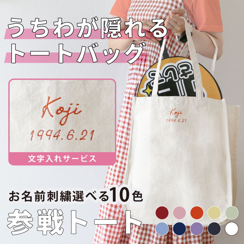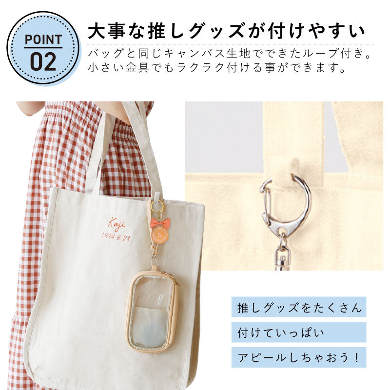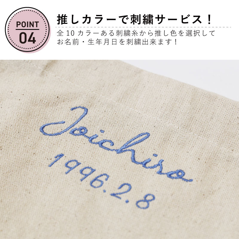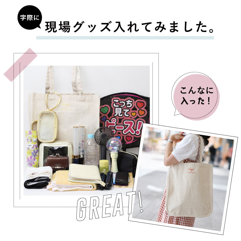 おすすめポイント3つと共にご紹介します♪ ポイント1:丁度良い参戦バッグできました! 参戦バッグ、何を入れてますか? 季節によって多少の変動はあるかと思いますが、 うちわ タオル ペンライト ポーチ お財布 ペットボトル 日傘 スマホ 双眼鏡 ハンドクリーム ぬいぐるみ などなど・・・ ここには書ききれないほど 大荷物になることも多いと思います。 分かります。 推しに会うのに妥協はできないですからね! そんな時に使っていただきたいトートが完成しました! - 大容量 - 約17Lの大容量バッグなので、 あれもこれも! にも対応できます! 厚手のキャンバス生地でできているので、 破れる心配もありません。 ガバッと開くので出し入れも簡単♪ - うちわ専用の収納ポケット - 推し活に欠かせないうちわ。 でも、仕事終わりの参戦まで、 しっかりしまっておきたい人もいるはず。 そんな時に、うちわの取っ手まですっぽり入る 収納が活躍します! - ペンライト用収納 - 同じく必需品である ペンライト 。 こちらも立ててしまえる収納スペースがあります! ペンライト以外にも、ペットボトルの収納としても◎ - キャンバス地のループ付き - お気に入りのキーホルダーや ぬいポーチを付けられるループ付きです♪ バッグと同じキャンバス地でできているので、 普段使い時にキーホルダーを付けていなくても 目立ちません。 ポイント2:推しカラーのお名前刺繍 全10カラーある刺繍糸から推し色を選択して、 お名前・生年月日を刺繍することが出来ます♪ 専属のスタッフが1文字1文字丁寧に刺繍いたします。 さりげないローマ字のお名前刺繍なので、 通勤⇔現場の切り替えも簡単にできます♪ ポイント3:メッセージカード付きでギフトにもおすすめ! メッセージカードを無料でお付けできますので、 推し活仲間やお友達へのギフトとしても おススメです! ≪こんなシーンにおすすめ≫ ・ 推し活 のお供に ・ オタ活 友だちへ の サプライズプレゼント に ・ 好きな アイドル アーティスト の ライブ コンサート 用 バッグ として |