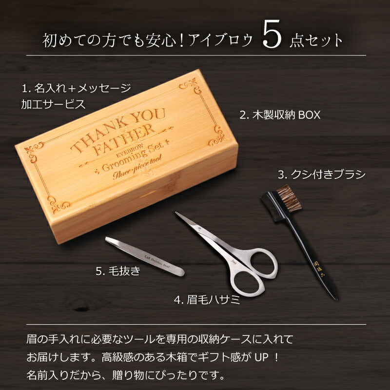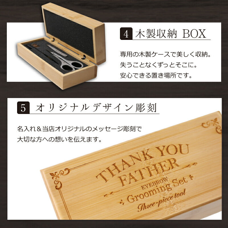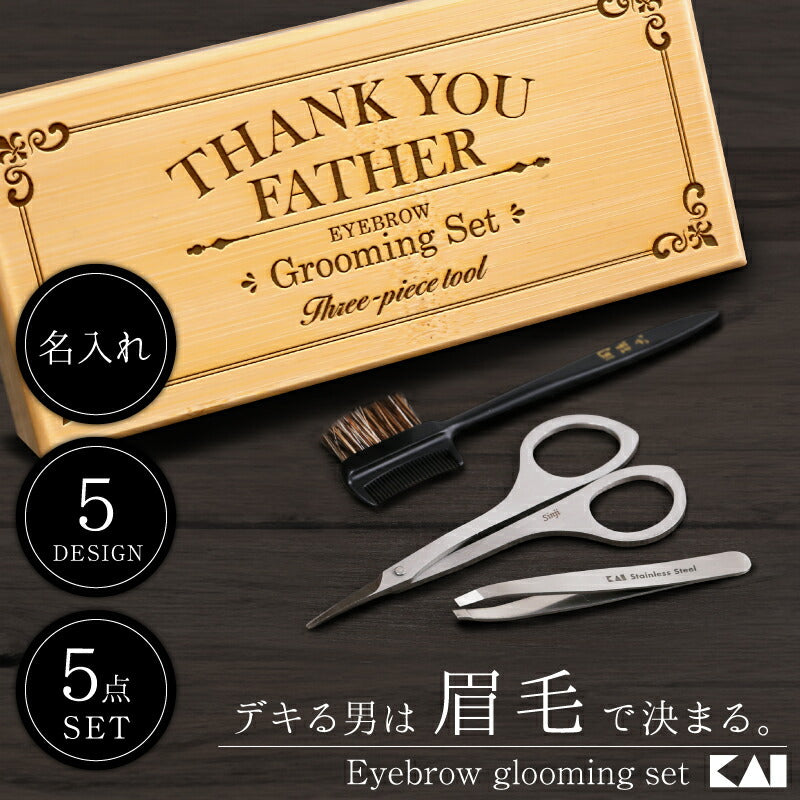 同じ年代なのにすごく若々しい。 なぜか洗練された印象がある。 一体何が違うんだろう・・・? その秘訣は、整った眉毛。 自分に似合った形にするだけで、周りに与える印象が変わります。 「いつまでもカッコいい お父さん でいて欲しい」 そんな気持ちを込めて贈りたい 特製の 収納ケース に入れた大人の 身だしなみ セット! メッセージ 入りだから、感謝の気持ちがより伝わります。 1, これだけあれば安心! 眉毛ケア 5点セット ・ 眉毛はさみ ・ 毛抜き ・ 眉毛 コーム ・ 木製 収納ケース ・ 名入れ・メッセージ 彫刻 眉毛 カット をする際に使う 「 眉毛 はさみ 」「 毛抜き 」「 クシ付き 眉毛ブラシ 」 の基本アイテムを セット にしました。 初めて眉の セルフケア をする方や まゆげ の お手入れ 方法に自信が無い方でも 安心の 眉毛 手入れ セット です。 専用の収納木箱には 想いの伝わるメッセージを刻印。 高級感 と特別感がグッと上がり、ギフトに最適です。 眉はさみ には贈る相手のお名前を彫刻いたします。 当店自慢のレーザー加工による名入れは消えることがございませんので 贈り物として大変喜ばれます。 2, 受け継がれる伝統 関孫六 ブランド 刃物メーカーで 人気 のブランド 「関孫六」。 その歴史は、鎌倉時代までさかのぼります。 日本刀の5大産地 美濃国 では、刀剣作りが伝わってから、数多くの名刀を生み出してきました。 なかでも、美しく切れ味のよい最上の刀を作り上げるとして、高く評価された刀匠が「関孫六」です。 【 関孫六 アイブロウ グルーミング セット 】は、 そんな関孫六の伝統が受け継がれた、高い加工技術を活かし作られました。 【 眉 ハサミ 】 鋭い切れ味で 眉毛カット に最適。 細く薄いカーブ刃なので肌にあてやすく、 短い毛のお手入れも簡単です。 【 毛抜き ピンセット 】 軽いステンレススチール製で、快適な使い心地。 精密に先端の合わせが調整されているので、 うぶ毛や細かい毛もしっかり掴みます。 【 ブラシ&コーム 】 櫛 で眉毛の流れを整えた後、 理想のラインからはみ出た毛を鋏でカット。 切った毛はブラシでサッと落とし、すっきりと仕上げます。 3, 男前眉毛で好感度バツグン 「顔の印象の8割は、眉毛が決める」 ということをご存じでしょうか? 仕上がり一つで顔の印象が変わると言っても過言ではないほど、 眉毛はとても重要なパーツです。 きりっと凛々しい眉に整えることで、清潔感がアップ。 周囲に好感を持ってもらえるというメリットも得られます。 仕事やプライベートを、より充実に過ごせることでしょう。 今や 男性 も アイブロウ で眉を整える時代。 特に、年齢が顔に出てくる 40代 からは眉毛で大きく差がつきます。 男らしい眉毛を手に入れて、ダンディな男を目指しましょう! 【オリジナル収納BOX】 メッセ—ジ彫刻無料サービス 専用の収納ボックスにメッセージを無料で彫刻します。 5種類のメッセージの中からお選びいただけます。 ※フリーのメッセージは不可となります。 ●THANK YOU FATHER(お父さんありがとう) ●THANK YOU(ありがとう) ●HAPPY BIRTHDAY(お誕生日おめでとう) ●HAPPY ANNIVERSARY(記念日) ●Congratulations(おめでとう) 気持ち伝わるオリジナルBOXだから 贈り物に最適です。 【 名入れ 】 お名前を彫刻致します。 当店自慢のレーザー加工による名入れサービスは、 職人の手でひとつひとつ丁寧に施しております。 彫刻したお名前は消える事がございませんので、 贈り物として大変喜ばれます。 「 どうして名前入りが喜ばれるの? 」 自分の名前が入った商品は世界にただ一つだけ。 贈った人に大事に使ってほしい、想いが伝わります。 だから、「名入れギフト」は大切な人に感謝の気持ちを伝えるのにぴったりなおくりもの。 私たちは、贈られた人も贈った人もみんなが笑顔になれる商品をお届けします。 ≪こんなシーンにおすすめ≫ ・ 初めて まゆげカット まゆげケア をする 男性 へ ・ 父 義父 お父さん おとうさん 父親 への 父の日ギフト として ・ 旦那 への 誕生日プレゼント バレンタイン クリスマス プレゼント に ・ 退職祝い 定年退職 の お祝い ギフト として ・ 敬老の日 の おじいちゃん のプレゼントに ・ 還暦祝い 古希 喜寿 米寿 の お祝い の プレゼント として ・ 20代 30代 40代 50代 60代 70代 80代 の方へのお祝い 記念品 に |