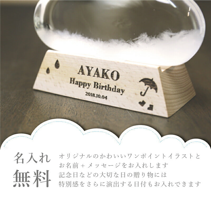 19世紀初頭・ヨーロッパでの航海時の気象予測ツールとして 使われていた「ストームグラス」。 これをヒントにして、天気や気温などによって液体内の結晶が ユニークに変化する様を楽しめるインテリア。 ガラスと液体、そして木という異素材ミックスが新鮮な かわいらしいデザインの自然派オブジェです。 木の台座部分にお名前とメッセージと日付と オリジナルワンポイントイラストを彫刻いたします。 (こちらは「あり」「なし」の選択ができます) 不思議なインテリアは誰もが目をひくギフトになるでしょう。 |