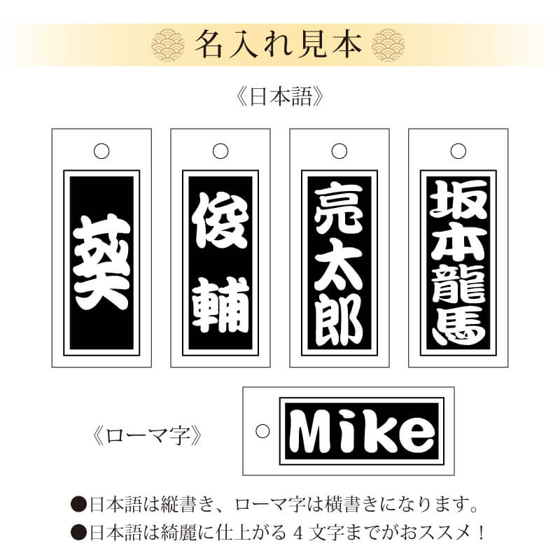 日本の伝統・文化を受け継いだ木札。 縁起物として古くからさまざまな用途に使われました。 あなたにきっとご利益あるかも♪ 大切な人への贈り物にも最適です! 1. 日本の伝統文化 木札の由来 木札は、日本人の暮らしの中で様々な場面に用いられていました。 その中でも、木札が縁起物とよばれるようになった理由には 以下のような由来があります。 一つ目は、江戸火消しの「消し札」。 「火事と喧嘩は江戸の華」と言われるほど江戸時代は火事が多く、 町火消しが火事を防いだ際に、組名が記された札を消し口に掲げていました。 以来、木札は火難、災厄を逃れる縁起物として今に伝わっています。 二つ目は、神社やお寺でも販売されている「身代わり札」。 名前が刻まれた木札は、その人の分身。 札が割れた際はお札が身代わりとなって守ってくれたという伝承が残っており、 古来よりお守りとして使われていました。 三つ目は、願い事を叶える「納札」。 お寺や神社を参拝する人が、祈願成就のために名前や出身地を書いて納める札のことで、千社札とも呼ばれています。 現在は紙のものが一般的ですが、昔は木札を納めていました。 どれも古くからの日本文化を感じられる由来となっておりますが、 現在ではおしゃれ感覚で身につける人も多く見られます。 キーホルダーやストラップのほか、 名札やボトルキープ用のネームタグなど、様々な用途で使われています。 男女年齢問わず、プレゼントにもおすすめのアイテムです。 2. こだわりの木材 当店で作る木札は全て自社製! 素材にこだわり、職人が一つ一つ丁寧に仕上げました。 温かみのある手触りとやさしい木の香りが、安らぎをもたらします。 また自然木は、時間が経つほどに風合いなどの深みが増していくので、 永く愛着を持ってお使いいただけます。 大切な思い出と共に経年変化を楽しめる逸品です。 檜 ?ひのき? 森を連想するような清々しい香りが癒しをもたらします。 また、耐久性が高く、防虫 防腐 効果もある優れた木材です。 寿命が長い木が多いことから、縁起がよいとも言われています。 3. 名前彫刻 当店自慢の技術で一つ一つ心を込めてお名前を刻みます。 名入れ専門店である当店の確かな技術力で細部までしっかりと彫刻! 自分の名前が入った木札は世界で一つの特別な逸品。 大切な家族や友人へのプレゼントとして贈れば、 喜ばれること間違いありません。 - 裏面デザイン - 裏面彫刻は10種類の模様からお選びいただけます。 いずれも縁起がいいとされる日本の伝統模様。 和柄には健康や長寿、学業や商業の成功など様々な願いや祈りが込められています。 贈る相手のことを想い、ぴったりな模様をお選びください。 ≪全10種類日本の伝統紋様≫ ・ 麻の葉 - 魔除け・子供の健やかな成長 - ・ 観世水 - 健康祈願・心願成就 - ・ 青海波 - 平和な暮らし・永く続く幸せ - ・ 荒波青海波 - 平和な暮らし・永く続く幸せ - ・ さくら - 繁栄・豊かさ - ・ 亀甲花菱 - 長寿 - ・ かごめ - 魔除け・邪気を祓う - ・ 紗綾 - 不断長久・吉祥 - ・ 水紋 - 苦難や災難を流す - ・ 毘沙門亀甲 - 長寿 - ≪こんなシーンにおすすめ≫ ・ 友達への 誕生日プレゼント に ・ 神輿 や 縁日 花火大会 に ・ 家族 やチーム・仲間同士でお揃いに ・ 父の日 敬老の日 のプレゼントに ・ 還暦 古希 喜寿 傘寿 米寿 卒寿 白寿 百寿 などの長寿のお祝いに ・ お子様のバッグや通学カバンに着けて名札代わりに ・ 卒業 卒団 卒部 などの 記念品 に ・ 創立記念 周年記念 のプチギフトに |