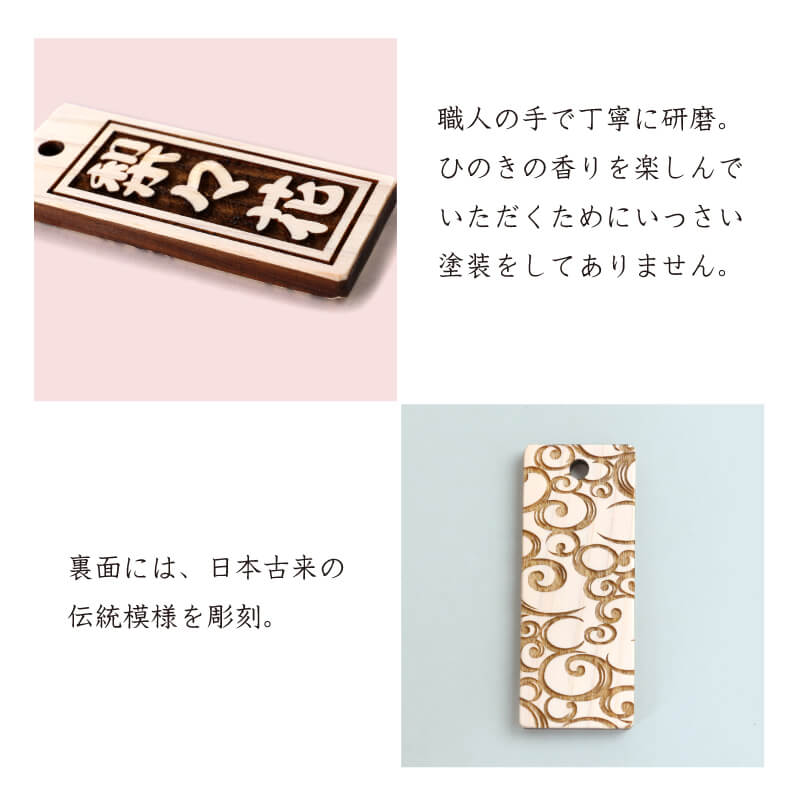 | 素材・成分 | 木札:檜(ヒノキ) 組紐:レーヨン |