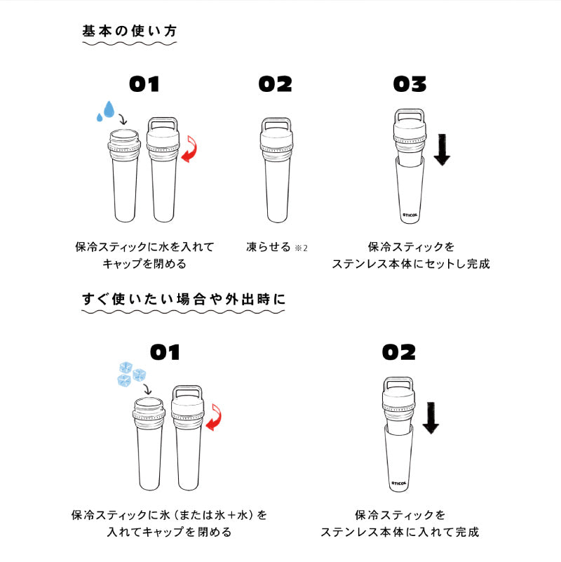 ステンレスボトル本体:ステンレス鋼(食器洗い×) 保冷スティック:シリコーンゴム・蟻 (食器洗い〇) フタ・飲み口・氷止め:保留 (食器洗い〇) パッキン:シリコーンゴム (食器洗い〇) |