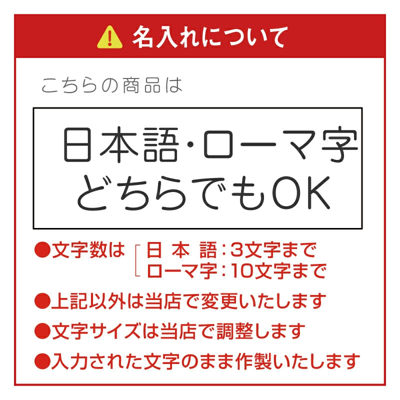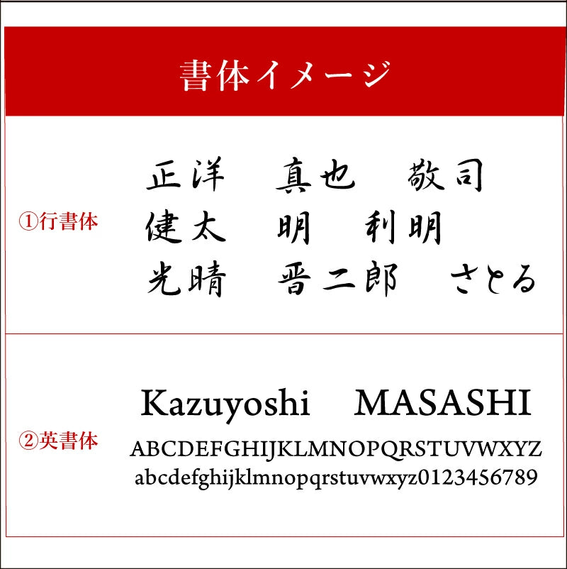 | 名入れ | 彫刻する文字は「入力欄」へご記入下さい。 【お名前】 行書は日本語のみ、文字数は3文字迄 英書体はローマ字のみ、文字数は10文字迄 ・上記以外は当店で変更します ・文字サイズは当店で調整します |