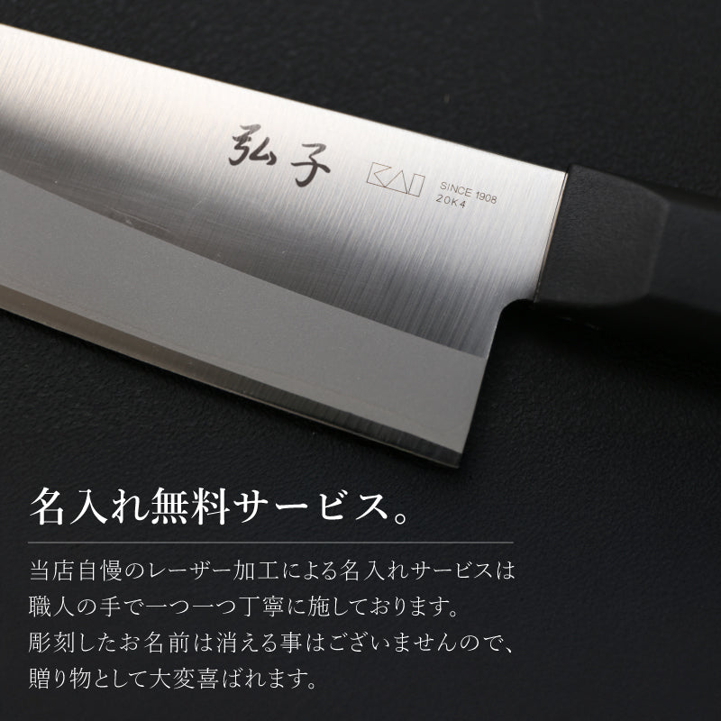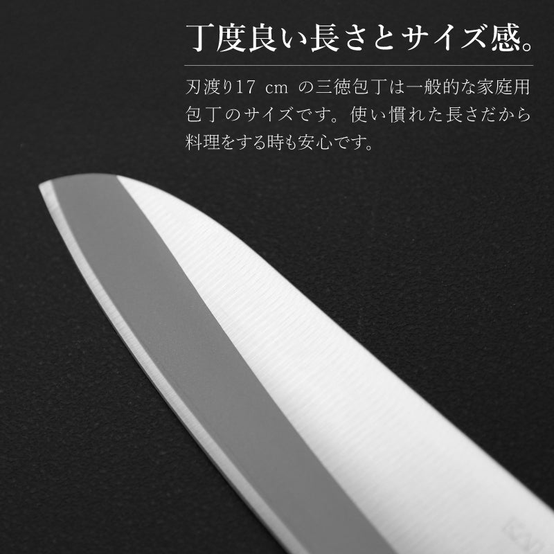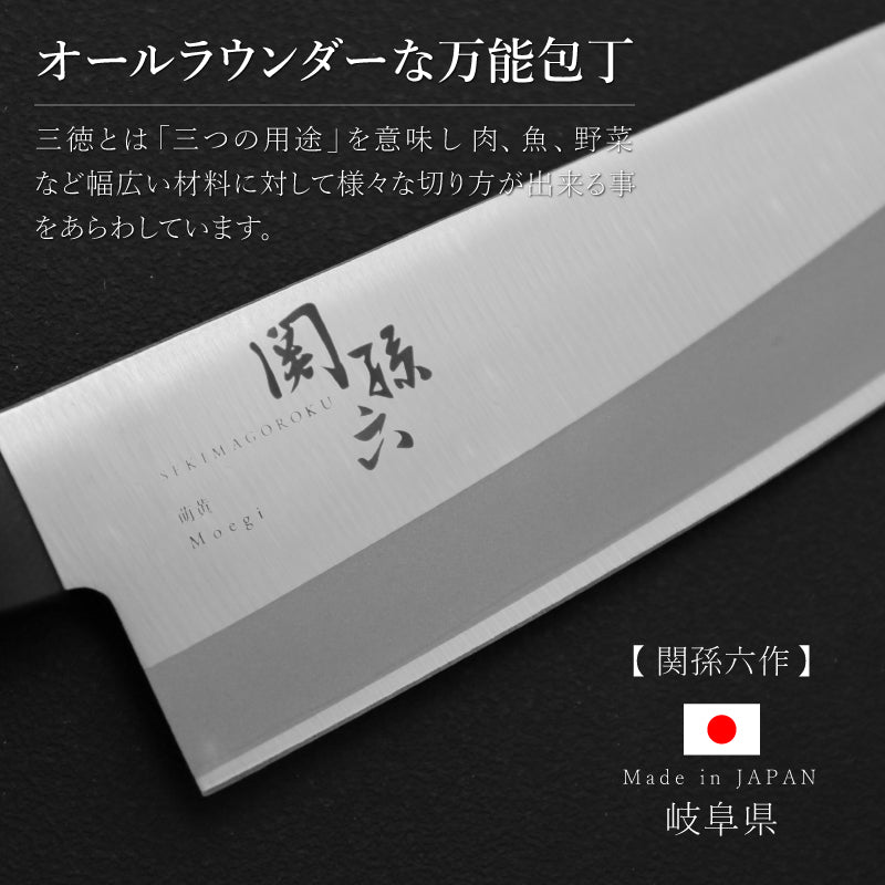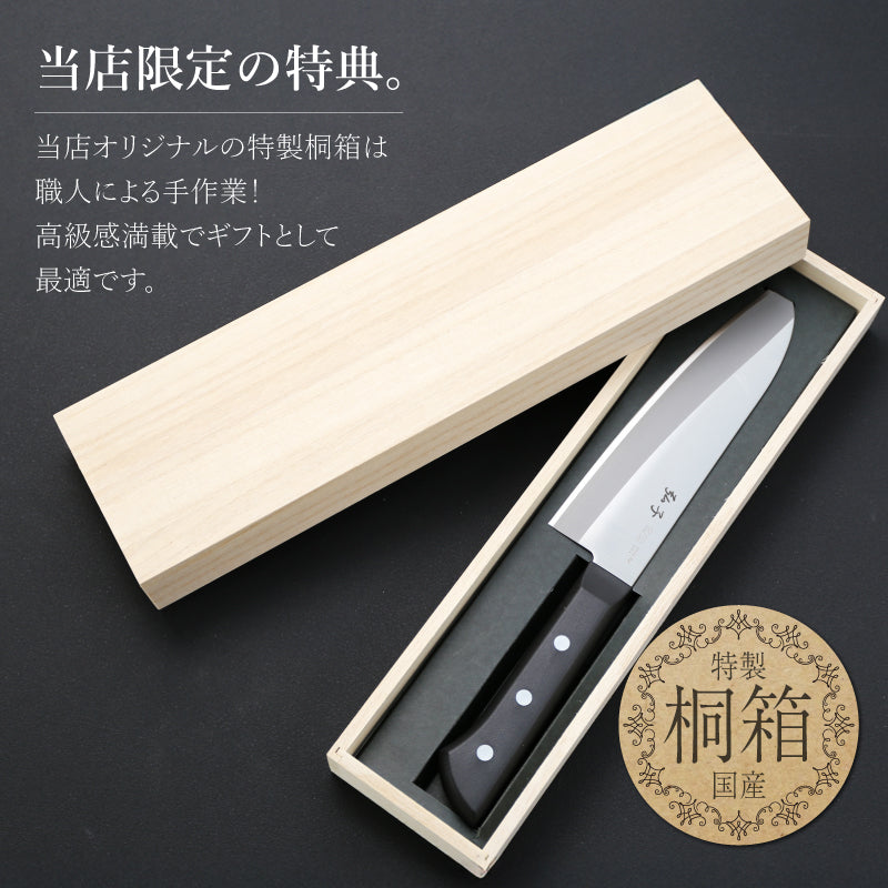 | 毎日のお料理をもっと楽しく♪ 自分へのご褒美に♪ 自分だけのマイ包丁で気分を上げてもよし↑↑ いつも作ってくれてありがとう♪ 料理好きなあの人に名入れでプレゼントしても良し♪ 当店の三徳包丁は、握りやすさ、使いやすさを追求した太め のハンドルの包丁です。 樹脂ハンドルのため、汚れにくく衛生的です。 自社製造の特性桐箱に入れて、お客様の元へお届けします。 高級感や特別感があり、贈り物にも最適です。 また外国人の方へのギフトにも大変喜ばれます。 三徳包丁は、肉、野菜、魚など幅広い用途に使える万能包丁で 家庭用として使用されています。 もともとは西洋包丁の牛刀を万能として使われてきましたが、 日本の菜切り包丁と牛刀の特徴を生かして作られた包丁が この三徳包丁になります。 近年は海外でも「Santoku」で日本の包丁として使用される方が 増えてきました。 とても使い勝手のいい包丁なので毎日のお料理に 重宝すること間違いなし! |