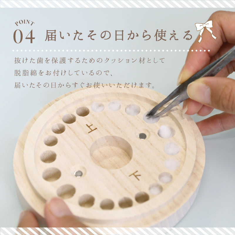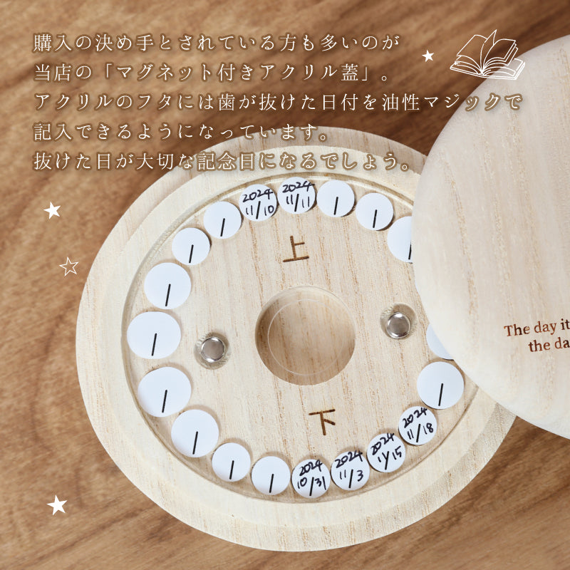 ※天然の桐材を使用しているため、それぞれ木目、色等が異なります。 ※木の収縮の関係でフタはあらかじめゆるめに設計されており、歯がこぼれないために内蓋をお付けしています。 ※ひび割れ、変形の原因になりますので、直射日光、冷暖房の送風があたる場所に保管しないでください。 ※濡らしたり湿度の高い場所に保管すると、膨張してふたが開きづらくなることがございます。 ※桐は経年により黒や赤に変色することがございます。 ※本製品は手作業で仕上げられているため、多少の寸法違いはご容赦ください。 ※仕様、価格デザイン等は予告無く変更する場合がございます。 ※上記理由における返品、交換は一切受け付けておりませんので、あらかじめご了承いただきますよう、よろしくお願いします。 ※中フタのアクリルへの記入は、油性マーカーをお使いください。 ※脱脂綿を使うことで歯を固定しやすくなります。必要に応じてちぎってお使いください。 |