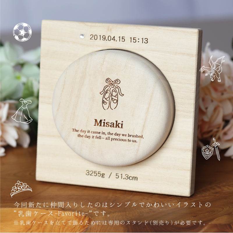 昔は屋根や床下に投げていた乳歯も、今は「大切に保管」するご家庭が増えています。 favoriteシリーズの乳歯ケースなら、お子さまの“好き”を選んで、名前や想いを刻める特別な記念品に。 ●だからおすすめ3つのポイント 1)桐製で安心・長期保管に最適 ・Aランク桐材を使用(ノンホルムアルデヒド) ・防湿・防虫・抗菌性に優れ、乳歯の長期保管にぴったり ・職人が丁寧に磨き上げ、子どもが触っても安心 2)使いやすい工夫 ・マグネット付きアクリルふたで歯がこぼれ落ちない ・日付や位置を記録できるシート付き ・脱脂綿で小さな歯もしっかり固定 3)選べる45種 favoriteデザイン ・ティアラやドレス、バレエシューズなど女の子がときめくデザイン ・ドラゴンやサッカーボール、剣と盾など男の子があこがれるデザイン ・ストローマグで人気のfavoriteシリーズに乳歯ケースが登場! - 名入れ&メッセージ彫刻で贈る特別感 - ・お名前をプリントして世界にひとつの乳歯ケースに ・「いつか大人になった時に伝えたい想い」を彫刻可能 ・親から子へ、想いを未来に残すメモリアルギフト ・出産祝い・誕生日・入園・卒園などのギフトにおすすめ 《こんなシーンで選ばれています》 ・お子さまの乳歯の成長記録に ・出産祝いの記念ギフトとして ・誕生日や七五三のお祝いに ・孫の日の贈り物に ・ママ・パパからお子さまへのファーストギフトに ・いつか大人になった時に渡す“未来への贈り物”として |