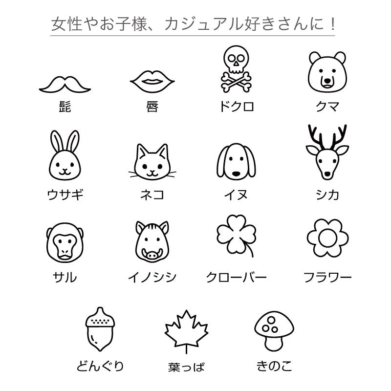 髭 / くちびる / ドクロ / くま / ウサギ / ネコ / 犬 / シカ / サル / イノシシ / クローバー / フラワー / どんぐり / 葉っぱ / きのこ