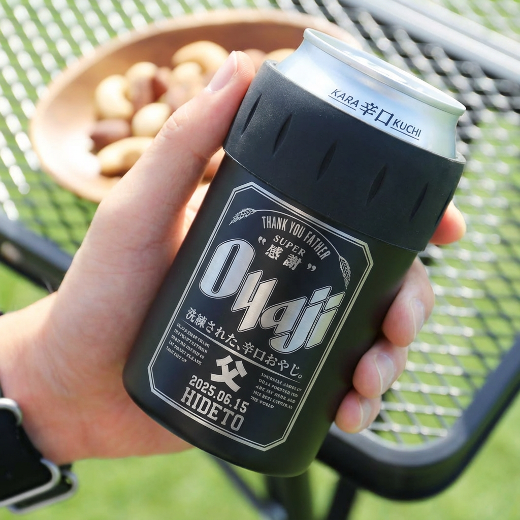 \ 缶ビール を最後の一口までおいしく / アウトドア キャンプ BBQ… 開放的なシチュエーションの中で飲むビールは格別の美味さ! そんな醍醐味にマストなアイテムが「 缶ホルダー 」。 真空断熱 で冷たさキープ!最後の一口でキンキンに♪ 機能性抜群の Thermos 缶ホルダー に 当店だけのとっておきなデザインを彫刻しました。 圧倒的なインパクトで、 思わず笑いがこみ上げる おもしろ ギフト です。 1. 機能性抜群の サーモス 缶ホルダー 軽いから日常使いにも。 使い方は冷たく冷やした 350ミリ 缶をこちらの保冷缶ホルダーにスポッと入れるだけ。 たったそれだけで、美味しい温度をなが〜くキープ。 アウトドア派にはもちろん、家飲みのインドア派にも ビールが最後の一口までおいしく飲めるから、 快適な時間をお過ごしいただけます。 2)当店オリジナル!父に捧げるOyajiデザイン おしゃれ なデザインの缶ホルダーなら、 美味いビールがさらに最高に! ビール好き ならみんなお馴染み?のあのデザインを 缶ホルダーに彫刻しました。 そして、よくよく見ると真ん中に大きく刻まれた文字は “Oyaji” 親しみこもったこの愛称は、まさに子から父への贈り物。 思わず笑いがこみ上げてしまう、ユニークなデザインに仕上げました。 気が付いた瞬間に思わず笑いがこぼれます♪ リモート飲みでも画面映えするから、みんなの視線を釘付けに。 仲間内でも話題になりますよ。 さりげなくデザインに馴染んだ「感謝」「THANK YOU FATHER」のメッセージは ユーモアを交えて感謝の気持ちを伝えることが出来るから、 直接言葉にするのが照れくさい人はこの缶ホルダーを贈るのが おすすめ 。 インパクト抜群だから サプライズ ギフト にもってこい! 受けとった相手も、その瞬間の驚きと感動はきっと忘れられないものになるはず♪ 3)名入れ・日付刻印 デザインの下部にはお好きな日付、 贈る相手のお名前を彫刻いたします。 - 日付 - 日付が入ることで目にするたびに記憶がよみがえる記念のプレゼントに。 思い出に残したい日付をご指定下さい。 - お名前刻印 - 当店自慢のレーザー加工による名入れサービスは、 職人の手でひとつひとつ丁寧に施しております。 彫刻したお名前は消える事がございませんので、 贈り物として大変喜ばれます。 世界でたった一つだけ!お父さん専用缶ホルダーが簡単に作れちゃいます。 名前入り だから愛着を持って永くお使いいただけます。 「自分の為に オーダー してくれたんだ」 そんな想いが伝わるから、名入れプレゼント は贈り物にピッタリ♪ 私たちは、贈られた人も贈った人もみんなが笑顔になれる ギフト をお届けします。 〜 愛用者の声 スタッフエピソード 〜 こちらのサーモス保冷缶ホルダーは当店でも使用しているスタッフが数名。 愛用するスタッフの一人、Mさんに話を聞きました! --------------------------------------- 「はじめて使った時は冷たさキープ力に驚きと感動。 それからはバーベキューにはもちろん家でも使っています。 最後まで冷たく飲めるというのが本当にうれしいです。 アウトドアでは夫が運転のため、私が 缶ビール を保冷缶ホルダーで。 夫の方はというと、これを使うためにわざわざ缶のジュースを買うほどです。 今年5月に友達への誕生日プレゼントにこちらを贈りました。 インドアな子ですが、毎日の晩酌に使ってくれているとのことでした。 --------------------------------------- 実用的だからこそ、プレゼントに喜ばれるこちらの保冷缶ホルダー。 名入れが入ることでより一層喜んでもらえるギフトに。 《こんなシーンで選ばれています》 ・ キャンプ用品 で プレゼント をお探しの方 へ ・ お父さん への 父の日 敬老の日 ギフト など ・ アウトドア キャンプ でお使いになる ビールホルダー 保冷缶ホルダー として ・ サーモス 缶 の ホルダー を 名前 入りでギフトに ・ コロナの影響での自粛期間中 家キャンプ おうちキャンプ リモート飲み会 家飲み グッズとして ・ ビール が大好き ビール好き な お父さん への 退職祝い や バースデープレゼント に ・ 缶ビール 缶チューハイ 缶ジュース を キンキンに冷えた状態で飲みたい方へ Oyajiシリーズ商品 |