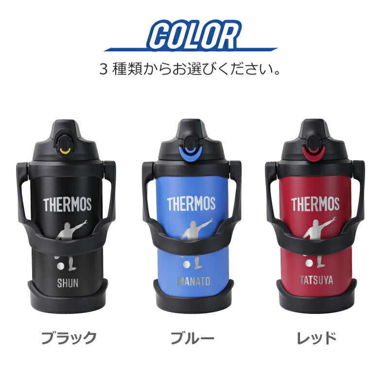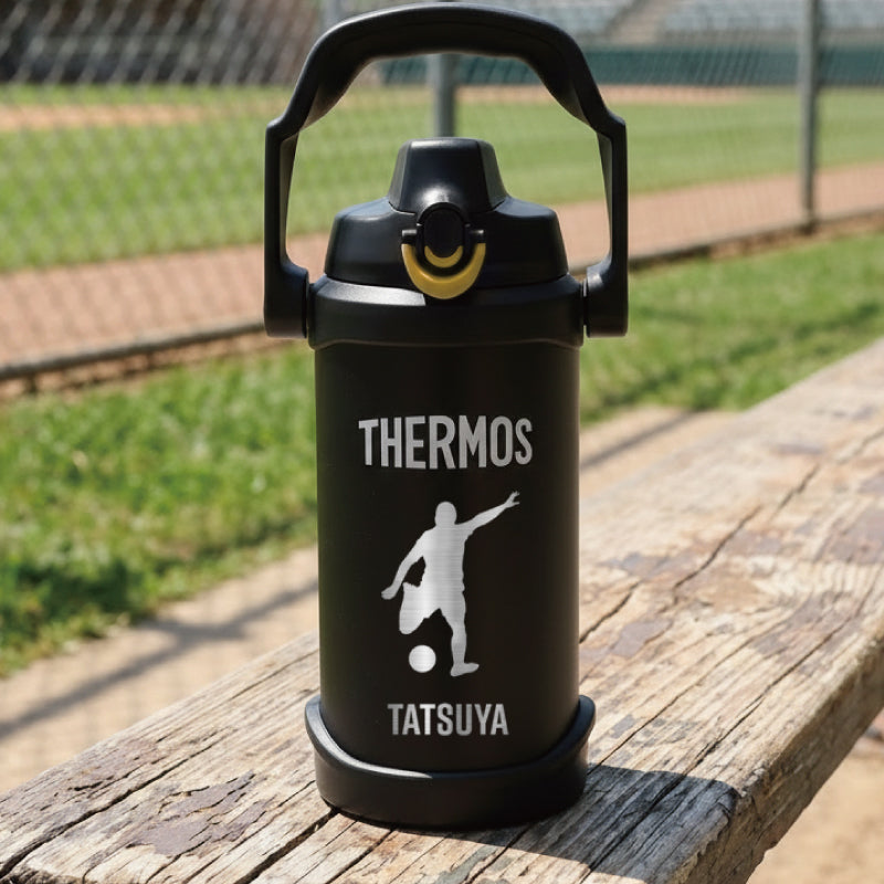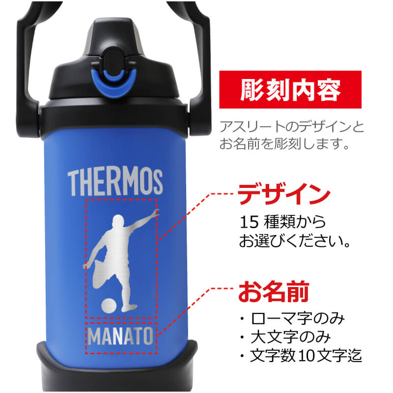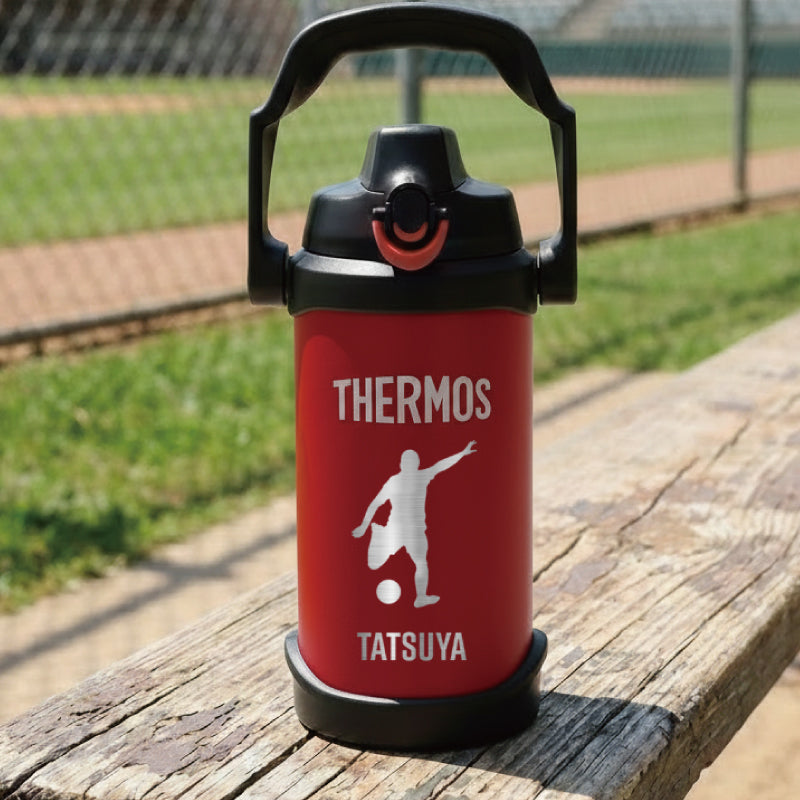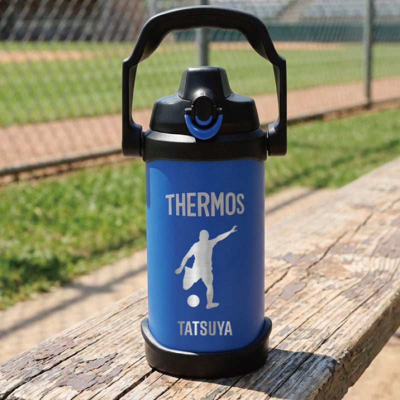うだるような暑さの続くこの季節。 こまめに水分補給して熱中症対策をきっちりしよう! サーモス2lジャグならいつでもつめた〜いスポーツドリンクが ごくごく飲める♪ さらにボディにはアスリートのシルエットデザインを彫刻。 カッコいいアスリートジャグなら スポーツ 部活 サークル活動 でも、 この夏手放せない相棒になること間違いなし! 1) 安心安全の サーモス ブランド サーモスといったら抜群の保冷力 ! もちろんこちらの スポーツジャグも ステンレス 魔法びん 構造だから、ばっちり冷たさキープ! 口径が大きいから、大きい氷がそのまま入って、 長時間溶けることはありません。 保冷 効力は最大6時間! 朝から夕方までずっと冷た〜いから、 激しいスポーツシーンに最適♪ スポーツをする方にとって、水分補給は大切。 部活動をする 学生 たちや、 顧問の 先生 監督 コーチ にとっても、 大会や練習で強い味方になってくれることでしょう。 仲間たちとの青春の日々を思い出に! 卒団 卒部 記念品にもおすすめです。 ・中まで丸洗い可能のワイドな口径 大人の手でもすっぽり入るから、 底まで綺麗に洗えてお手入れ簡単。 ずっと清潔にご使用いただけます。 衛生的に長く使えて 洗いやすい ♪ お母さん にも嬉しい仕様。 現場仕事をしている お父さん や 部活をしている 子供 への プレゼント にも 人気 です。 ・ 大容量の 2L スッキリとしたデザインのボトルですが、 その容量はなんと 2.0L! 部活男子・女子にはこのサイズ!スポーツにおいて水分補給はコンディションを保つのに必須! たっぷり 2リットル だから、継ぎ足し無しでノンストレス! 激しく汗をかく運動時や、猛暑日の続く夏。 通常サイズのボトルでは足りないなんてよくあること。 このスポーツジャグなら、 何本も 水筒 や ケータイマグ を用意する必要なくこれ一本でOK! 通勤 通学 に便利なのはもちろん、 キャンプ や アウトドア などのすぐに飲料が手に入らない場所でも安心です。 ・ ワンタッチ・オープンで素早く給水 ワンタッチでふたを開閉できるから、 飲みたいときにすぐに飲める! 素早い給水「 直飲み 」タイプ。 給水口が大きいから一度にたくさん水分補給できる。 あつ〜い炎天下でも豪快にゴクゴク飲めて気持ちいい♪ キャップユニットにはボタンロックが付いているので、 中身が零れることなく、砂ぼこりもシャットアウト! ツートンカラーのロックリングで ロックされているのがわかりやすい、 シンプル構造のキャップユニットです。 本体も丸洗いできてお手入れ簡単♪ ・ 安定感あるボディデザイン コンパクト かつ、軽量 設計のボディデザインだから、 両手でしっかりホールド出来て飲みやすい! 女性 にも使いやすく、安定性のある ボトル です。 一体型の取っ手が付いているので、片手で簡単に持ち運び♪ カーブしたハンドルが持ち手にフィットするから 指に負担をかけません。 ゴルフ や レジャー 遠征 に行くときにも大活躍します。 アスリートのシルエットを彫刻いたします。卒業記念品におすすめ! かっこいいアスリートデザインは、みんなの目を惹くこと間違いなし! ・ 野球A ・ 野球B ・ サッカー ・ バスケットボール ・ バレーボール ・ テニス ・ バドミントン ・ ラグビー ・ 陸上 ・ 空手 ・ 柔道 ・ 剣道 ・ 卓球 ・ 体操 ・ 水泳 さらに、アスリートデザインの下にはお名前を刻印。 特別感もグッと増す、自分だけのオリジナルボトルが作れちゃいます。 友達と同じメーカーの水筒でも、これなら間違えない! 部活やクラブ活動時、一か所に飲料ボトルが集められていても、 自分のものが一目瞭然! 学校生活でも欠かせない相棒になること間違いなしの 名前入り ジャグ。 新生活 を応援したい! 大好きな部活動がさらに楽しくなれるように! そんな想いを込めて、 入学祝い に贈ってみるのはいかがでしょうか? 彫刻するジャグのカラーは ・ブラック ・ブルー ・レッド の3種類からお選びください。 |