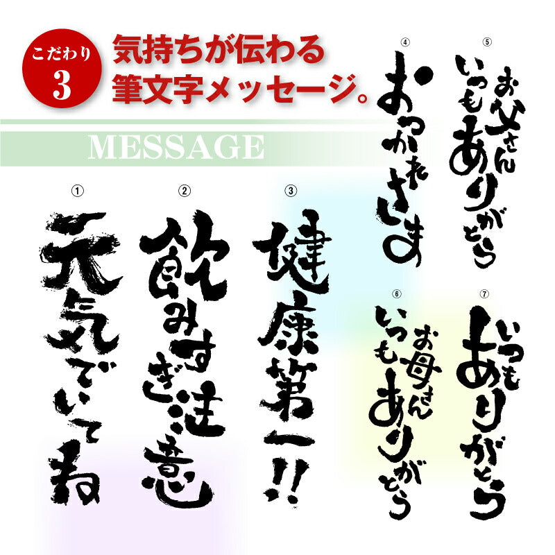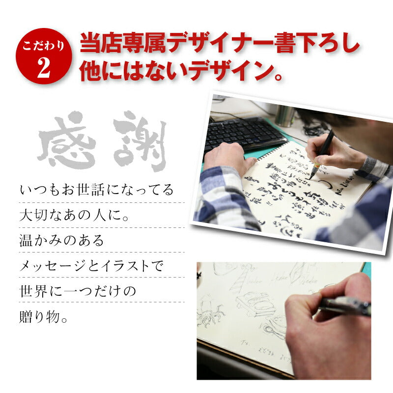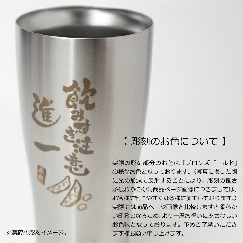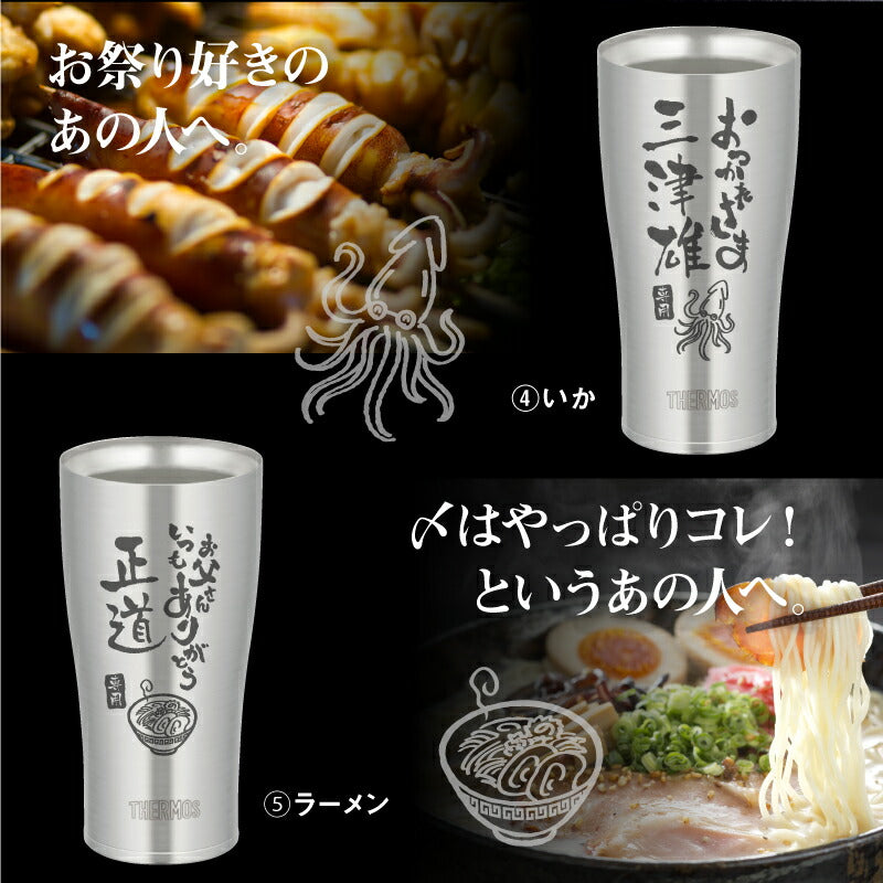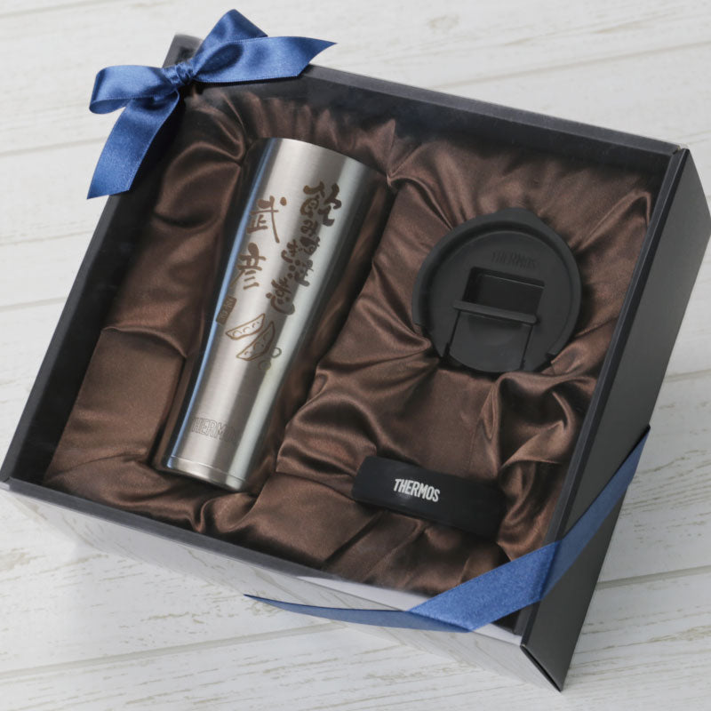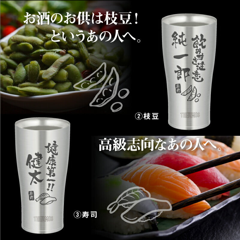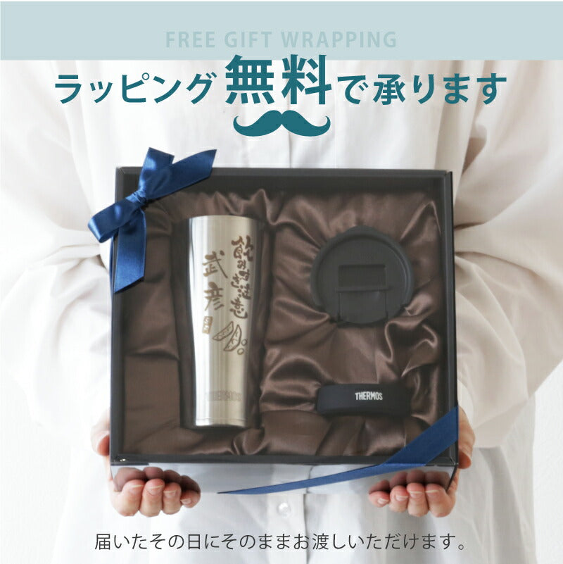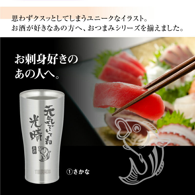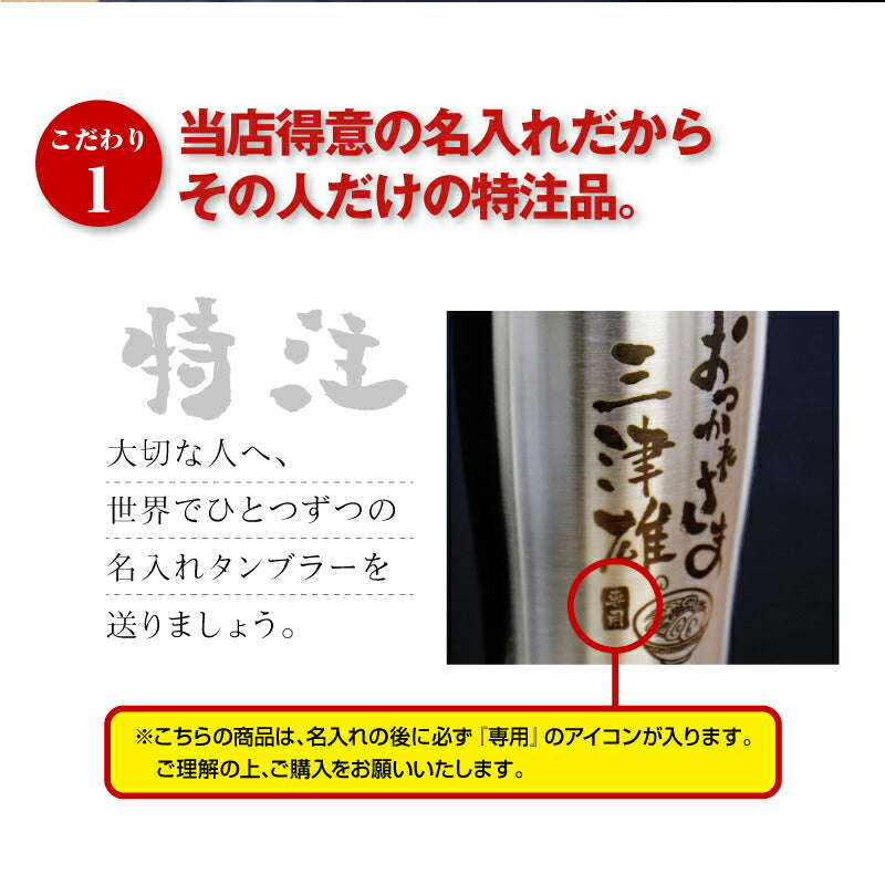 使った誰もがその使い勝手に驚く サーモス ステンレス タンブラー 。 専属デザイナーによる、手書き文字とイラストを彫刻。 あなたの気持ちが伝わる様、思いを込めて描きました。 日本人の心に響く和テイストな筆文字デザイン。 さらに専用のフタ・底をセットにして、オリジナルギフトBOXでお届け! もらった瞬間笑みがこぼれる『 絶対喜ばれるギフト 』にオススメです。 ・・・だから人気!大切な人へのギフトに最適なワケは3つ。・・・ 1. 機能性抜群のサーモスタンブラー 6時間経っても氷が溶けない! 美味しいビールを最後の一口まで。 ず〜っと冷たい!氷が溶けない!なのに結露ゼロの理由は、ステンレス魔法瓶構造で保温・保温力に優れているから。 当店スタッフも声をそろえて「これを使ったら、今まで使っていたグラスには戻れない!」と言うほど、機能性に優れています。 軽いのに満足な容量が入る、落としても割れないタフなステンレスタンブラー。 毎日の生活に欠かせない存在になること間違いなしです。 2. 選べるデザイン&メッセージ 箱を開けた時、「好きなもの、分かってくれてるんだ!」と嬉しくなる瞬間。 すっきりとしたスタイリッシュなフォルムに味のある手書き文字・イラスト。 ぜひ、大切な人の好きなものをお選びください。 《 それぞれ5種類から選べる イラスト と メッセージ 》 〔 イラスト5種類 〕 1. 釣り好き には「 さかな 」 2. つまみの定番「 枝豆 」 3. 酒と言ったら 「 寿司 」 4. お祭り好きに 「 いか 」 5. 食歩き 好きに「 ラーメン」 〔 メッセージ7種類 〕 1. 長生き を願う「 元気でいてね 」 2. お酒好き には「 飲み過ぎ注意 」 3. 身体 を気遣う「 健康第一 」 4. 退職祝い には「 おつかれさま 」 5. おとうさん へ「 お父さん いつも ありがとう 」 6. おかあさん へ「 お母さん いつも ありがとう 」 7. 感謝 を伝える 「 いつもありがとう 」 日々の空間に馴染む、落ち着いた印象が50代・60代のお父さんお母さんにピッタリです。 お名前の下には「専用」の文字が入るから、より一層大切にしたくなる気持ちに。 自分専用のタンブラーなら、毎日がより快適になります。 3. 快適・清潔・安全のサーモス専用蓋・底セット 保冷 保温 効果の高い サーモスタンブラー。 蓋 を付ければさらにその効果を持続させることが出来ます。 ずっと美味しい温度をキープするから、飲み物片手に集中したいシーンにも嬉しい。 ほこりや虫もシャットアウトできるから、常に清潔! スライド式だからワンアクションですぐ飲めて、飲んだらすぐに閉じることが出来て衛生的なんです。 机の上で作業するときは、 滑り止め があれば安心。 シリコン製の底カバーがあれば、タンブラーの底の傷を防いだり、滑りにくくします。 さらに、テーブルに置いた時の音が付けていない時と比較して静かなのでストレスフリー! 使い方は簡単!タンブラーにぎゅっと押し込むだけ! ギフトにするなら サーモス フタソコ を一緒に。 「 喜んで欲しい 」気持ちがより一層伝わります! 〔 カラーバリエーションは全5色 〕 ・ ブラック ・ ライトグレー ・ ピンク ・ イエロー ・ グリーン 【 名入れ彫刻 】 「 どうして名前入りが喜ばれるの? 」 自分の名前が入った商品は世界にただ一つだけ。 贈った人に大事に使ってほしい、想いが伝わります。 さらにお名前彫刻はずっと消えずに残るから、永く愛着を持って使っていただけます。 だから、「名入れギフト」は大切な人に感謝の気持ちを伝えるのにぴったりなおくりもの。 私たちは、贈られた人も贈った人もみんなが笑顔になれる商品をお届けします。 ≪ こんなシーンにおすすめ ≫ ・ 友達 への 誕生日プレゼント に ・ 父親 お父さん 母親 お母さん への 父の日 母の日 ギフト に ・ 上司 先輩 同僚 の 転勤祝い 栄転祝い 退職祝い 定年退職 送別会 の 記念品 として ・ 敬老の日 の おじいちゃん のプレゼントに ・ 還暦祝い 古希 喜寿 米寿 の お祝い の プレゼント として ・ 20代 30代 40代 50代 60代 70代 80代 の方へのお祝い 記念品 に |