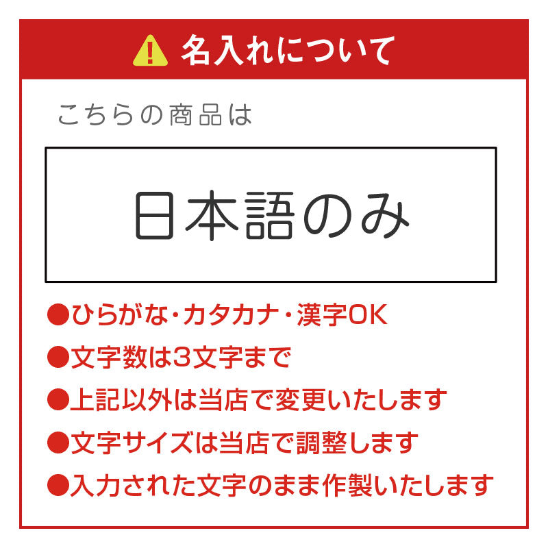 彫刻する文字は「入力欄」へご記入下さい。 【お名前】日本語のみ※ローマ字不可 文字数は3文字までとさせていただきます。 ・上記以外は当店で変更します ・文字サイズは当店で調整します |