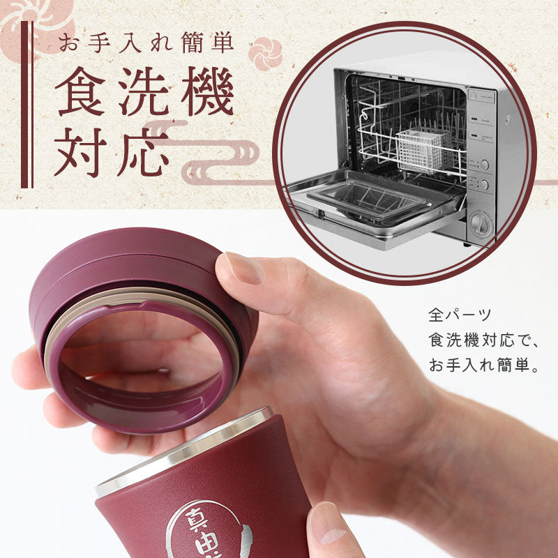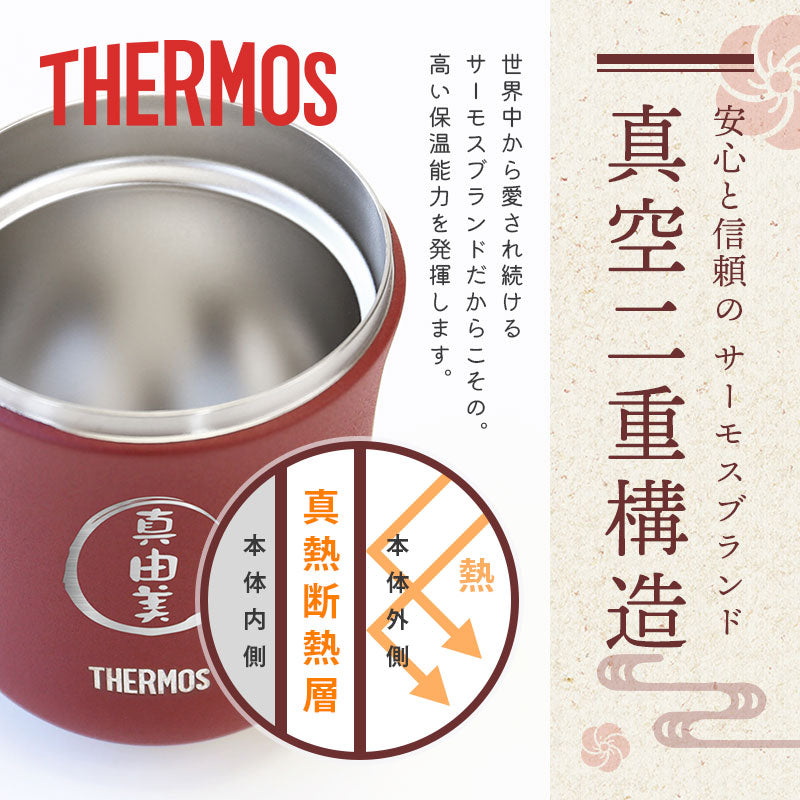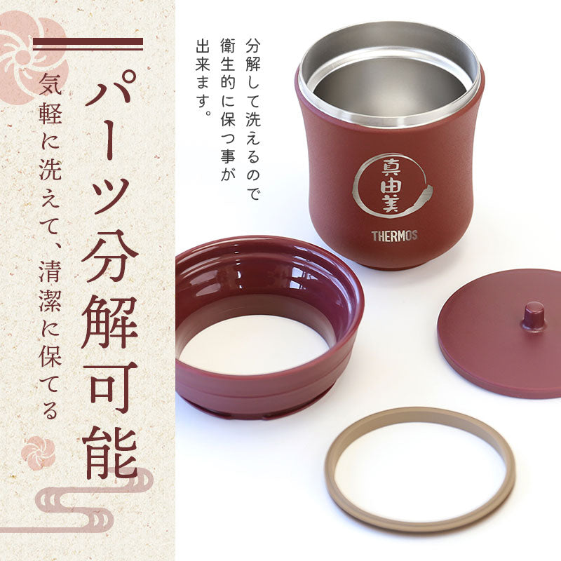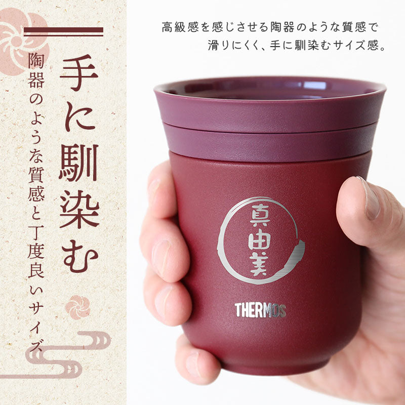 魔法びんのパイオニア サーモス から まさかの湯呑みが登場! 一年中飲んでいる、温かい緑茶。 いつものお湯呑みだとすぐにぬるくなってしまう。 そんなお悩みをばっちり解決。 毎日使えて実用的! 日常にホッと安らぐひとときをもたらしてくれる モダンで新感覚の和食器です。 1. 安心と信頼のサーモス - THERMOS - 誰もがその使い勝手の良さに驚くサーモス ブランド。 当店スタッフも声をそろえて 「これを使ったら、今まで使っていたグラスには戻れない!」 と言うほど支持を集めています。 その人気の理由は優れた機能性にあります! - 魔法びん構造 - 1時間経っても60度以上をキープし続ける保温力! 最後の一口まで飲みごろ温度が持続します。 真空二重構造 で内側の熱を逃がさず器が熱くなるのを防ぐので、 湯呑みを持つ時にやけどをする心配もありません。 保冷 効果もバッチリだから、冷たいドリンクを入れてもOK! お茶だけでなく、コーヒー・スープ・麦茶など… 季節を問わずにいつでも使えてとっても便利♪ - 耐久性抜群 - 落としても割れないタフな ステンレス 製。 「湯呑みは欲しいけど割って壊すかも…」 という悩みも解決! お年寄りでも安心してお使いいただけます。 - 食洗機対応 - 湯呑みは飲み物を入れる本体の他に、飲み口・蓋の3つのパーツに分かれます。 飲み口を取り付けることで金属部分が口に触れず、滑らかな口当たりに! 飲まない時は蓋をしておけば、さらに冷めにくく、ホコリが入らず衛生的にお使いいただけます。 全パーツ食洗機対応なのでお手入れ簡単です。 2.デザイン性 湯のみのカラーは2色からお選びいただけます。 ・ 栗 ・ あずき 趣のある和の色合いは、高級感を感じさせる佇まい。 手に持ちやすい丸いフォルムに陶器のようなさらりと優しい質感で 滑りにくく、手触りの良さも抜群です。 おしゃれで使いやすい湯呑みがあれば 暮らしの満足度もグッと上がることでしょう。 3. お客様も大満足!高評価レビュー多数 (レビュー一部抜粋) 「義父に無事届いたようです。とても嬉しかったようで写真を撮って送られてきました。」 「母にプレゼントしたところ、「こういうのが欲しかった!」とすごく喜んで毎日使っています。 お茶が冷めにくいのと、自分の名前が入っているのがうれしいみたいです♪」 「「これいいわぁ、もったいなくて使われへん」と言うので「ガンガン使わな1回も使わんうちに死んでまうで!(笑)」と伝えました。使ってくれているのかな(笑)」 このほかにも多数、お客様から嬉しいお声をいただいております。 相手に喜んでほしいという真心が伝わるから、 サーモス湯呑みは大切な人へのプレゼントにおすすめです。 4. 名入れサービス無料 湯呑みの中央には贈る相手のお名前を彫刻いたします。 自分専用の湯呑みで飲むお茶は格別の味。 ほっこりとした雰囲気の筆文字に心が和みます。 「 どうして名前入りが喜ばれるの? 」 普段あまりにも身近にあるので、自分の名前のことを深く考えることはありませんが 贈られた商品に自分の名前が刻まれていたらどうでしょう。 しかも特殊な技法で彫り込まれていたり素敵なデザインとなってプリントされていたり・・ その瞬間、ただの“商品”ではなく“自分だけの大切なもの”に変化します。 そして贈ってくれた方の真心を感じ、自然に笑顔がこぼれることでしょう。 名前はその人にとって唯一無二、かけがえのないものです。 私たちはそのお名前を大切に、贈る人、贈られる人、両方の笑顔を想いながら商品を送り出します。 当店の名前プリントはずっと消えずに残り、永く愛着を持ってお使いいただけることでしょう。 ≪こんなシーンにおすすめ≫ ・ご年配の方への 誕生日プレゼント として ・お父さん お母さん に 父の日 母の日 ギフトとして ・おじいちゃん おばあちゃん への 敬老の日 の贈り物に ・退職祝い 定年退職 の 記念品 として ・還暦 古希 喜寿 傘寿 米寿 卒寿 白寿 百寿 の 長寿祝い に ・お世話になった 上司 や 先生 への お礼 に |