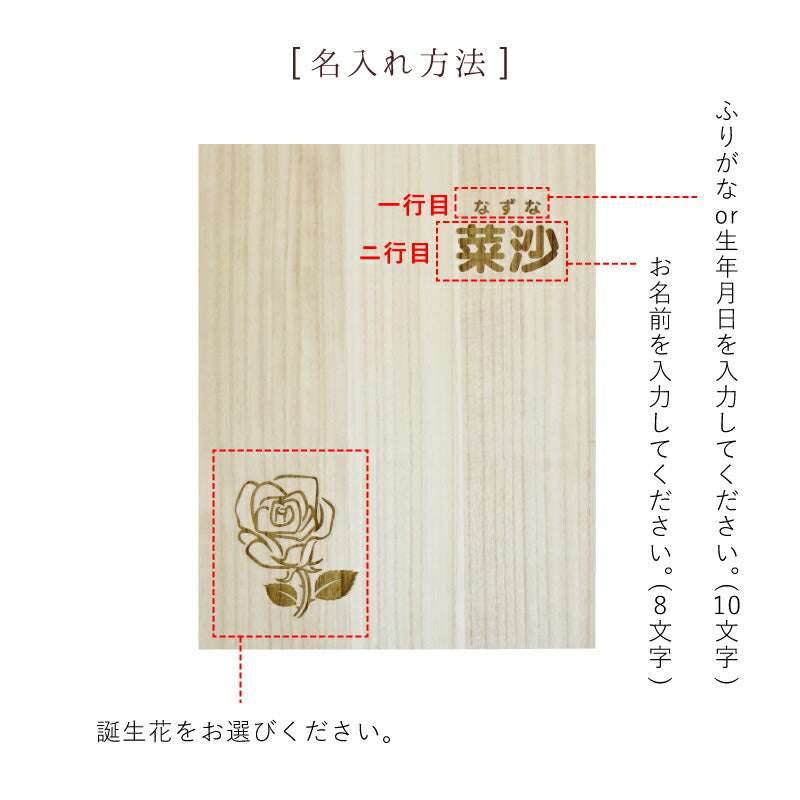 桐箱にはお名前と誕生花のイラストを彫刻いたします。