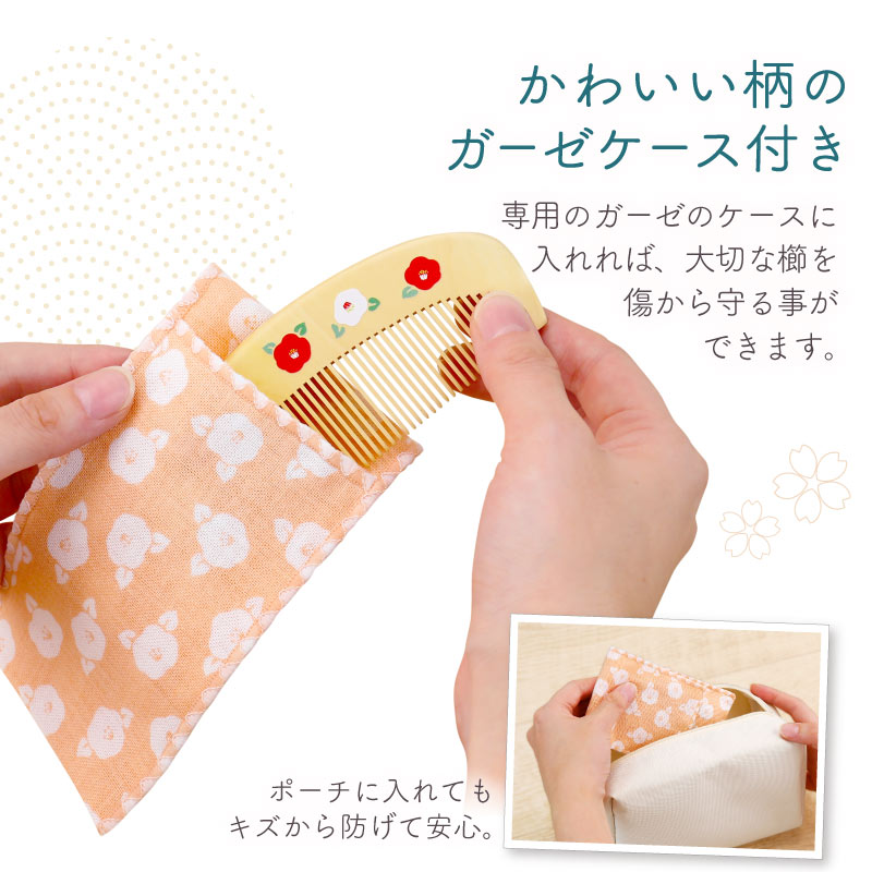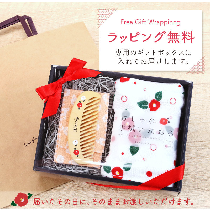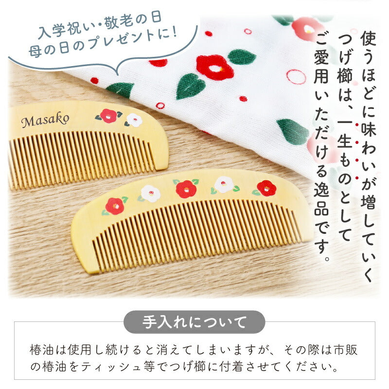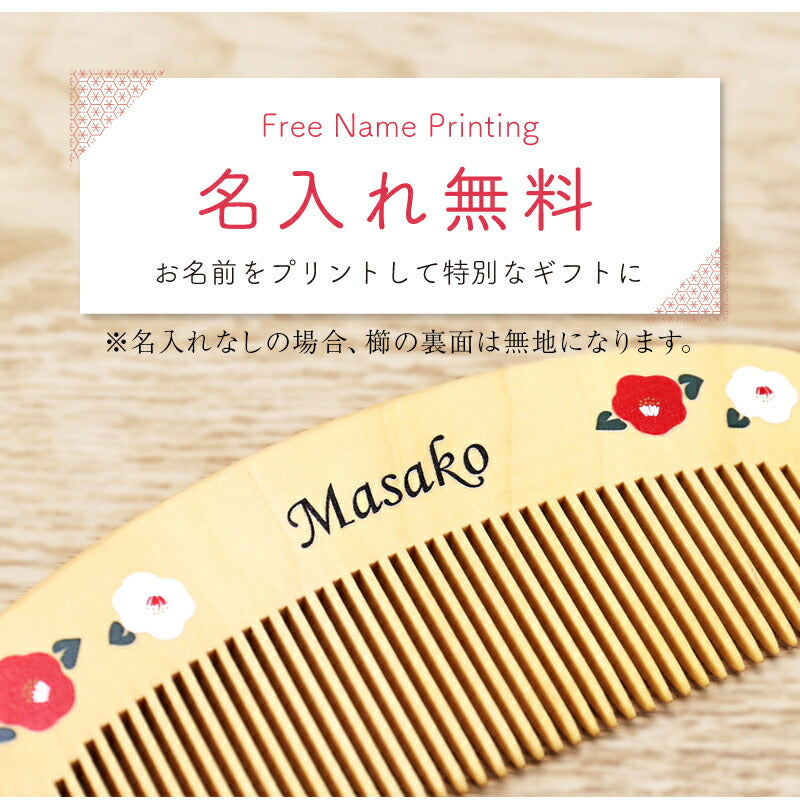 日本古来から愛用されてきたつげ櫛。 天然の椿油で髪に潤いを与えます。 丁寧にお手入れをすれば 一生使えるヘアケア道具になりますよ。 女性へのプレゼントにおすすめです 友達同士や親子でお揃いも可愛い♪ 1. 美髪をつくる つげ櫛 つげ櫛とは、日本に古くから伝わる伝統工芸品で、 柘植(つげ)の木を材料にして作られた櫛のことを指します。 奈良時代の『万葉集』に登場するほどその歴史は長く、 現代まで受け継がれてきました。 その装飾の美しさも人気の秘訣ですが、 つげ櫛には 美髪効果 もあると言われています。 髪の大敵となるのが静電気。 ブラッシングによる摩擦で静電気が起きると、 抜け毛や枝毛、切れ毛の原因になることも・・・。 つげ櫛は一般的な ヘアブラシ よりも静電気が発生しにくいという特徴があり、 髪の毛が痛むのを防ぐ効果があります。 また、つげ櫛は椿油を染み込ませて作られています。 髪をとかすと、椿油の栄養分や潤いが髪に行きわたり、パサついた髪に自然なツヤを与えるので、 髪質改善の効果も期待できることでしょう。 - つげくし は 縁起の良い 贈り物 - 櫛は髪をキレイに梳かしてくれるように、 問題ごとが起こった時も「解きほぐしてくれる」ということで、縁起物とも言われています。 昔は、娘が嫁に行く時の嫁入り道具として、つげ櫛を持たせる風習がありました。 また、緻密な木肌を持ち堅くねばり強い柘植の木は、 固く変わらない絆を表す縁起の良い木と言われ、 夫婦円満、家内安全のお守りとして珍重されてきました。 身も心も解きほぐし、穏やかに過ごせるように・・・ 大切な人の幸せを願って、つげ櫛を贈ってみてはいかがでしょうか。 2. 椿柄 手ぬぐい タオル つげくし とおそろいの椿柄がかわいい♪ 和テイストの 手ぬぐいタオル をセットでお届けいたします。 椿の花言葉は、 『控えめな素晴らしさ』『気取らない優美さ』。 日本女性の奥ゆかしさを惹きたてるのにぴったりのアイテムです! ガーゼ地とパイル地の二重仕立てで、 吸水性がよく、肌触りも心地よい一品。 安心・安全の 日本製 だから 贈り物におすすめです。 3. 名入れ 無料 デザインの中央に、贈る相手のお名前をプリントいたします。 名前入り ギフトは特別感たっぷり! 愛着を持って永くお使いいただけます。 「 どうして名前入りが喜ばれるの? 」 自分の名前が入った商品は世界にただ一つだけ。 “ 自分の事を考えながら選んでくれたんだ ” そう感じさせてくれます。 だから、相手を大切に想う気持ちがより伝わります。 さらにお名前彫刻はずっと消えずに残るから、 永く愛着を持って使っていただけます。 だから、「名入れギフト」は大切な人に感謝の気持ちを伝えるのにぴったりなおくりもの。 私たちは、贈られた人も贈った人もみんなが笑顔になれる商品をお届けします。 ≪こんなシーンにおすすめ≫ ・ 20代 30代 40代 50代 60代 の 女性 に ・ 女友達への 誕生日プレゼント に ・ 母親 お母さん への 母の日 ギフト に ・ 自分へのご褒美 に ・ 美容グッズ のプレゼントとして ・ 彼女 への クリスマス ホワイトデー のプレゼントとして |