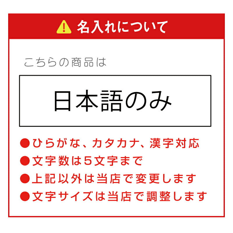 | 名入れ | プリントする文字は「入力欄」へご記入下さい。 【お名前】日本語のみ※ローマ字不可 文字数は5文字までとさせていただきます。 ・上記以外は当店で変更します ・文字サイズは当店で調整します |