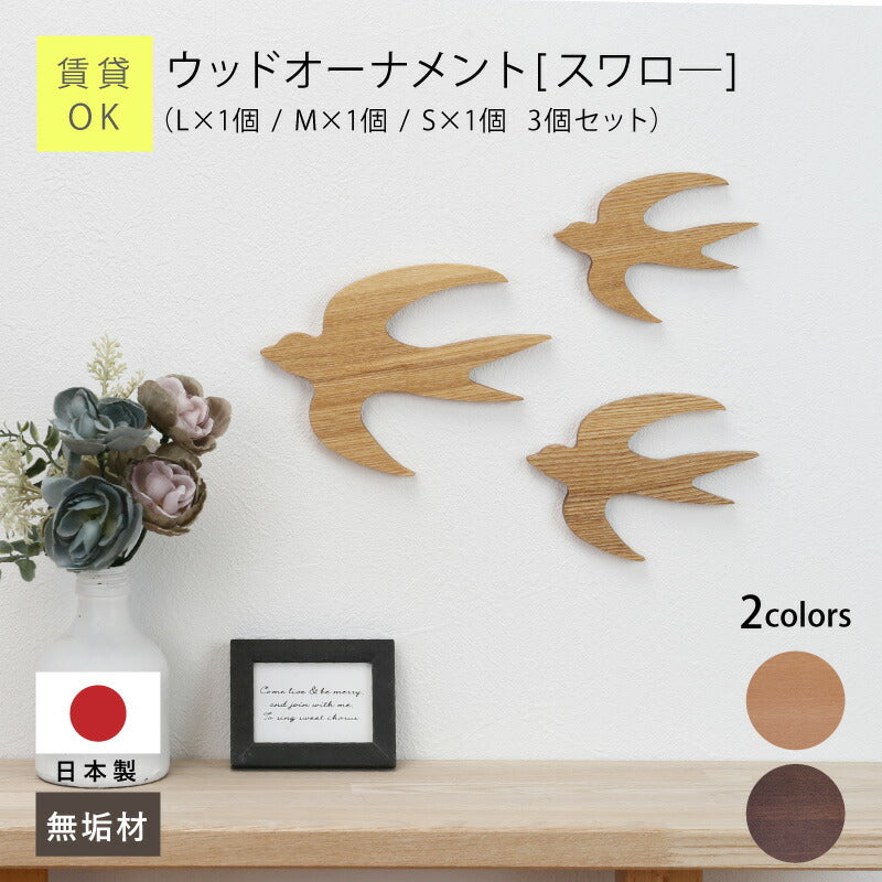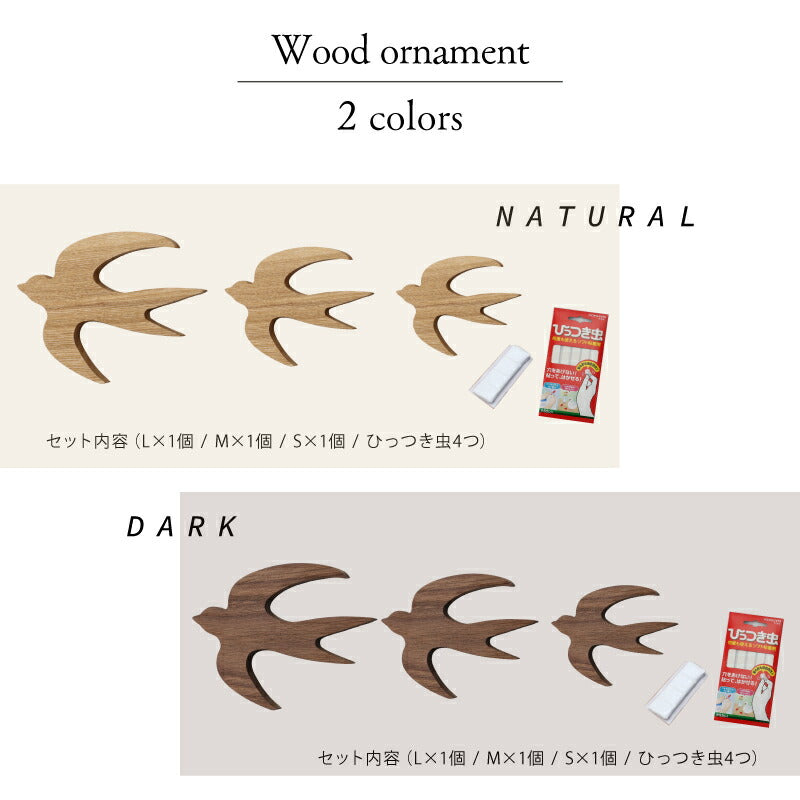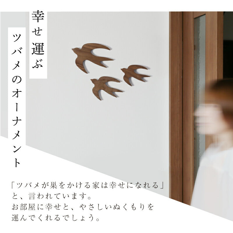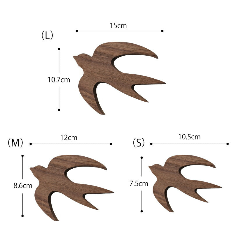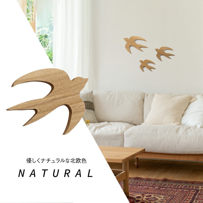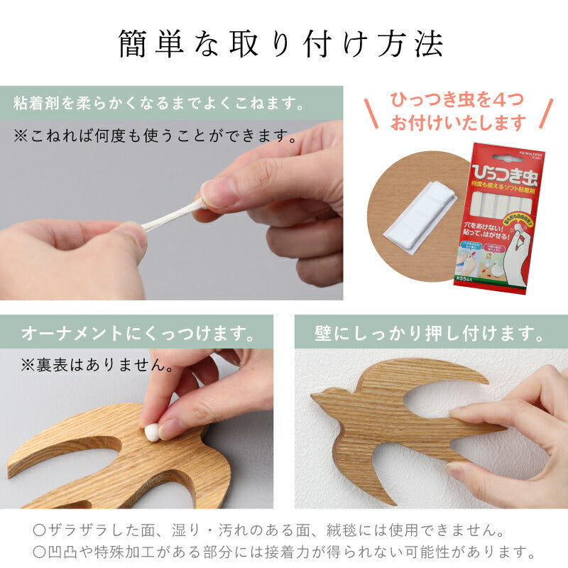 \ お部屋の壁に木の温もりをプラス! / 貼るだけで簡単模様替え! お部屋の壁を自分らしくアレンジして、 心地よい空間づくりを叶えましょう♪ 1. 貼るだけ簡単!お部屋を気軽に模様替え シンプルな自宅の壁が 少し殺風景に感じる時、ありますよね。 そんな時、壁を素敵に彩る インテリアアイテム があるんです! ウォールオーナメント で気軽に お部屋の模様替えをしてみませんか? 壁 にひと工夫するだけで いつものお部屋がおしゃれで居心地の良い空間に! ウッドオーナメントには、 「ひっ付き虫」を4つ添付いたしますので、 届いたその日にお使いいただけます。 コクヨの「ひっ付き虫」は、くり返し使える粘着剤。 壁を傷つけることなく、何度も貼ってきれいにはがせるので便利です。 2. あたたかみのある天然木 ウォールオーナメント には 国産 の 天然木 を使用しております。 木のぬくもりが優しい雰囲気を演出し、 暮らしに安らぎを与えてくれることでしょう。 オーナメントの木材は、 2種類からお選びいただけます。 ・ タモ 部屋が明るくなるような淡く白っぽい色合いが特徴です。 はっきりとした木目が美しく、天然木ならではの ナチュラル なテイストをお楽しみいただけます。どんな インテリア とも合わせやすいので、飾るお部屋を選びません。 ・ ウォールナット 世界三大銘木であるウォールナットは、古くから重宝されてきた高級木材です。 深みのある上品な色合いが美しく、衝撃にも強く丈夫な木材のため、さまざまな家具や建築に幅広く使用されます。 3. 幸せを運ぶ ツバメ モチーフ 人里に巣をつくる 燕 は、「幸運を運ぶ鳥」と呼ばれており、 「商売繁盛」や「無病息災」などのご利益があるとも言われています。 優雅に羽ばたく つばめ のオーナメントが お部屋に幸せとやさしいぬくもりを運んでくれることでしょう。 ・ Lサイズ(15cm×10.7cm) ・ Mサイズ(12cm×8.6cm) ・ Sサイズ(10.5cm×7.5cm) の3点セットになっております。 玄関 や リビング 、寝室 など、お好きな場所に飾ってください。 |