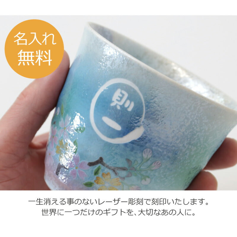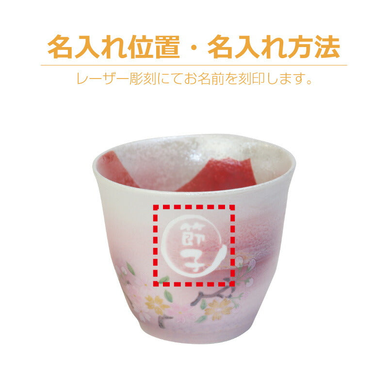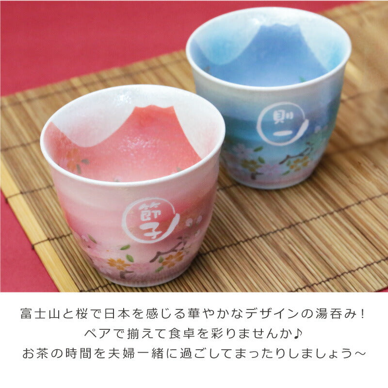 富士山と桜で日本を感じる華やかなデザインの湯呑み。 磁器で出来ているので手に持つと軽くてなめらかな手触り。 持ちやすい形状になっているのでお年寄りでも安心して使えます。 長寿のお祝いにぴったりです。 |