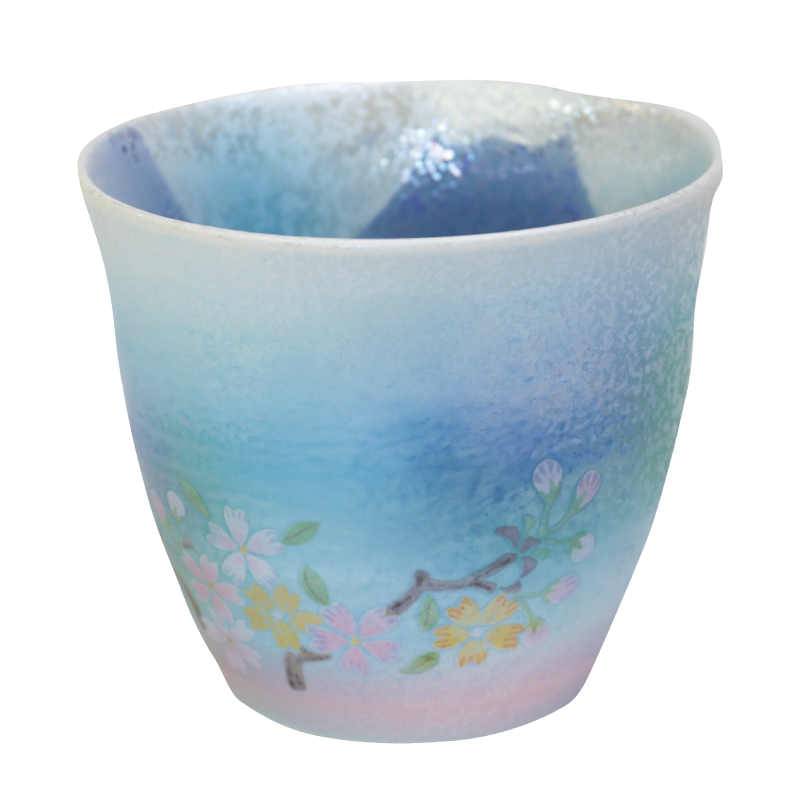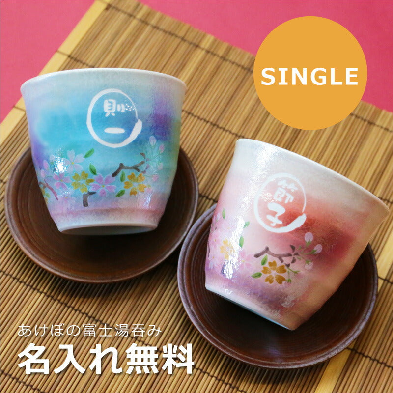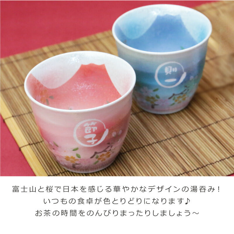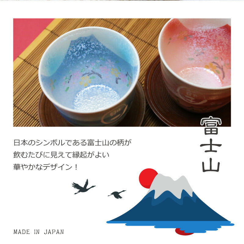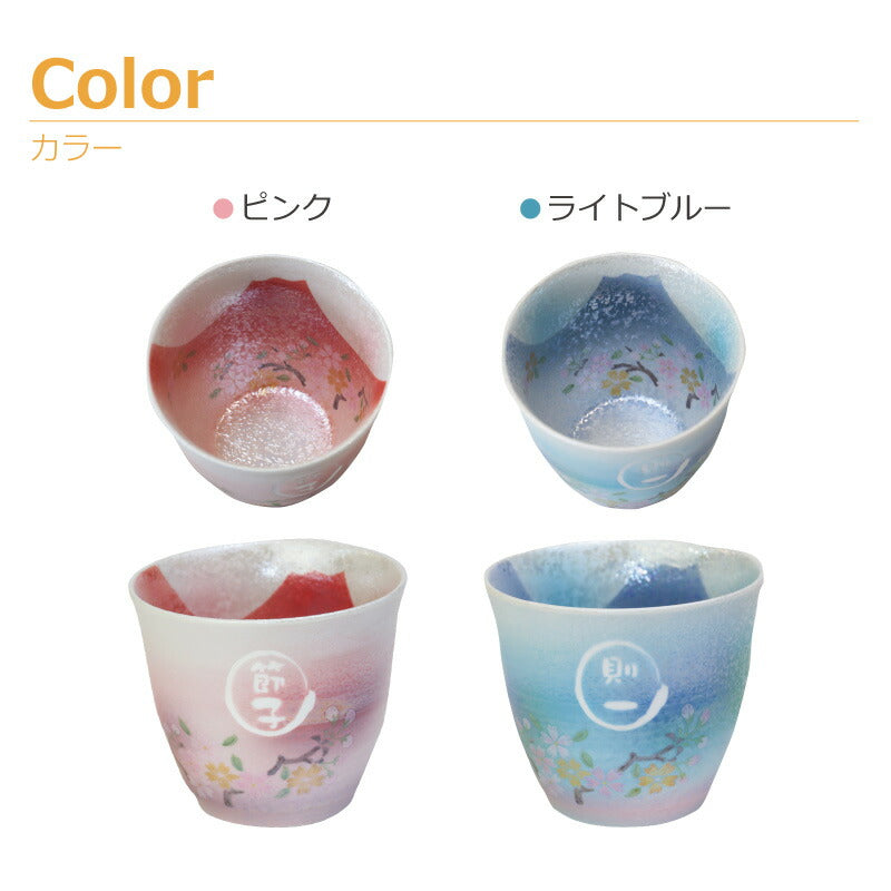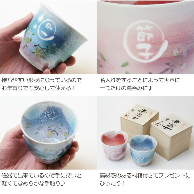 富士山と桜で日本を感じる華やかなデザインの湯呑み。 磁器で出来ているので手に持つと軽くてなめらかな手触り。 持ちやすい形状になっているのでお年寄りでも安心して使えます。 長寿のお祝いにぴったりです。 |