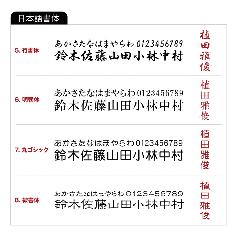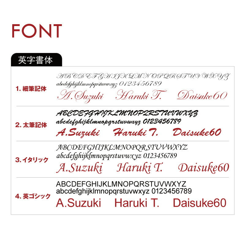 | 名入れ | ■1.細筆記体・2.太筆記体は 全て大文字で記載の場合は、頭文字大文字+小文字になります。 3.イタリックはお客様から頂いた表記のままになります。 ■メッセージ不可 ■2行不可 ■日本語:6文字まで・ローマ字:12文字まで ※上記以外の記入方法の場合は、当店で変更させていただくことがございます。 【日本語とローマ字 混合の彫刻内容】の場合は日本語書体に合わせて彫刻します。書体は日本語書体からお選びください。 |